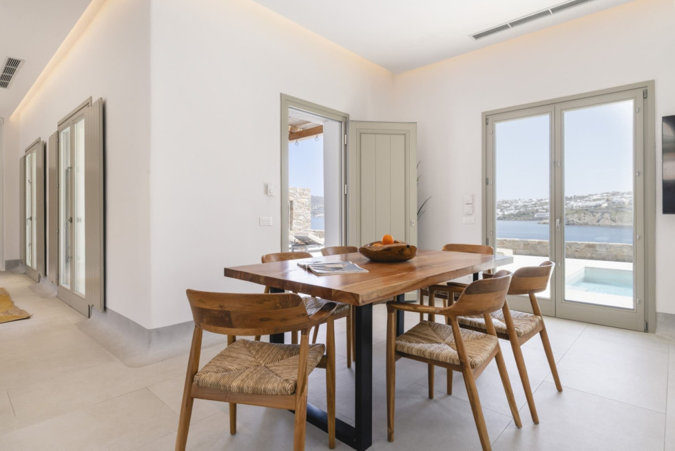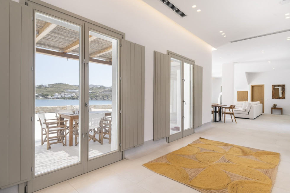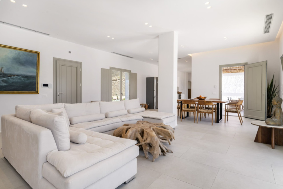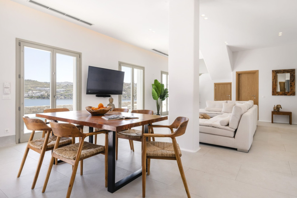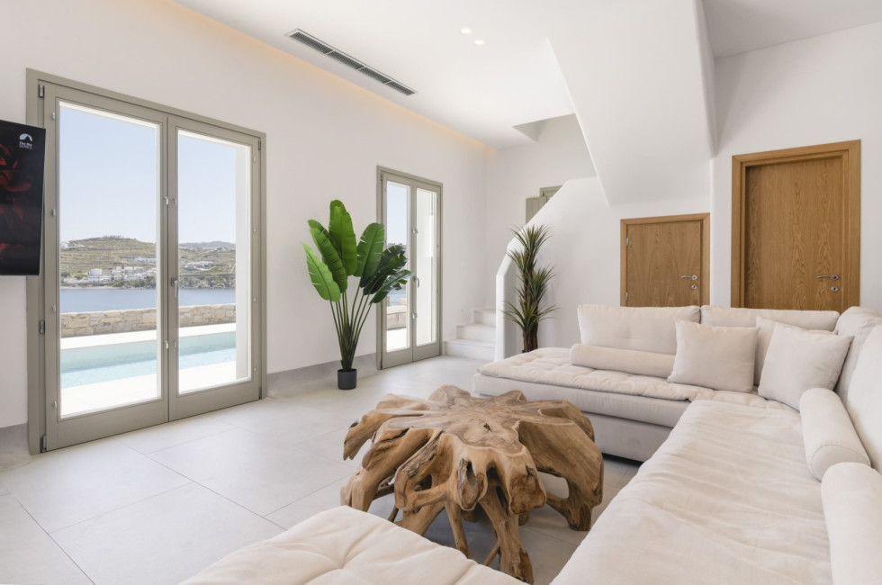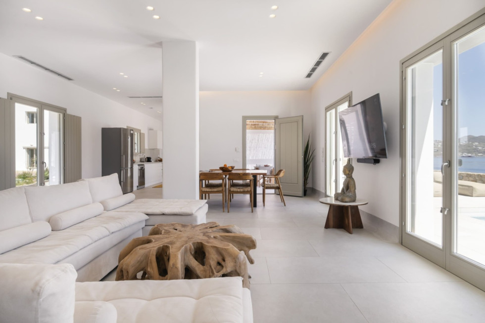 Designed in a modern Mykonian style, the villa combines clean architectural lines with natural tones and light-filled interiors. Large windows and sliding doors seamlessly connect indoor and outdoor living spaces, allowing guests to fully enjoy the sea views and Mykonian sunlight throughout the day.