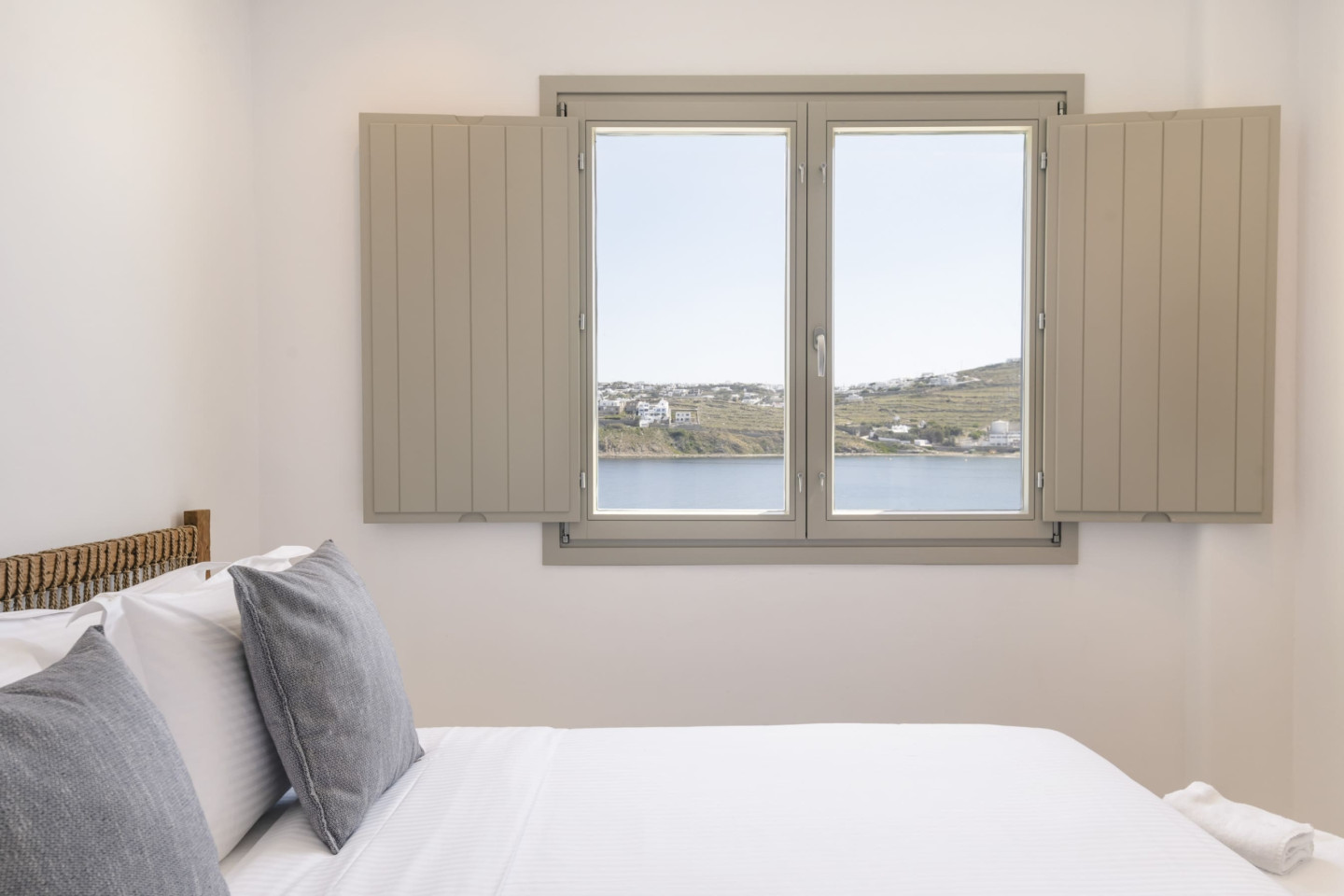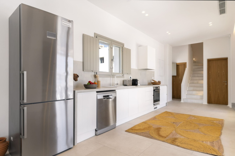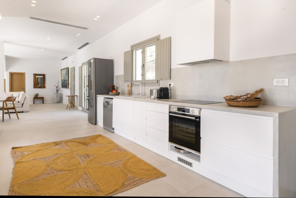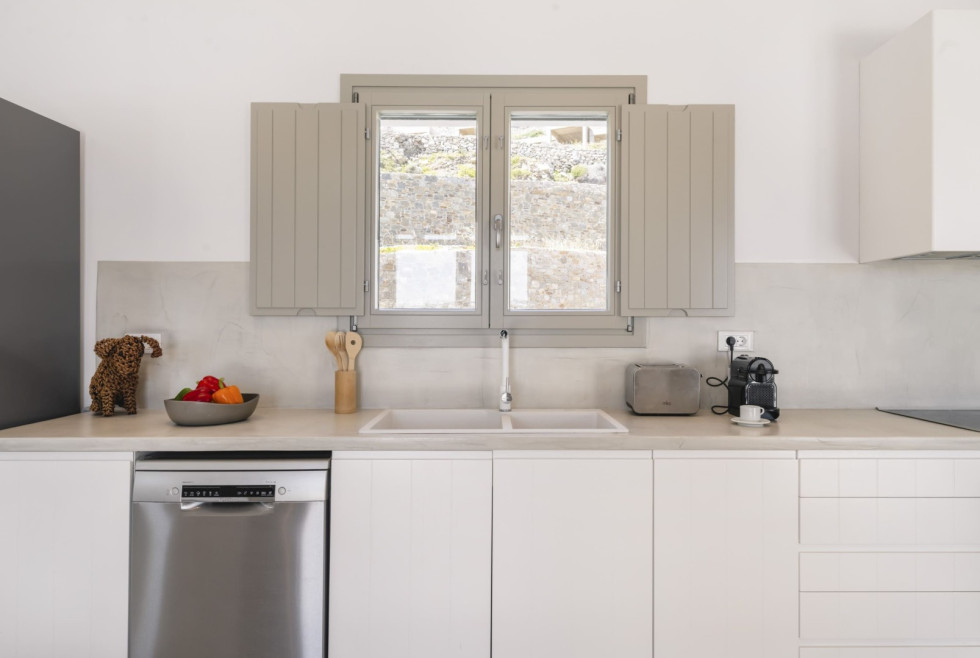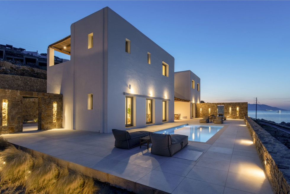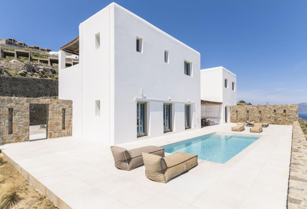 Designed in a modern Mykonian style, the villa combines clean architectural lines with natural tones and light-filled interiors. Large windows and sliding doors seamlessly connect indoor and outdoor living spaces, allowing guests to fully enjoy the sea views and Mykonian sunlight throughout the day.