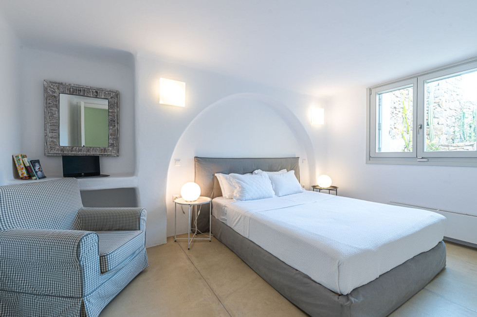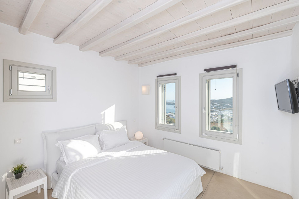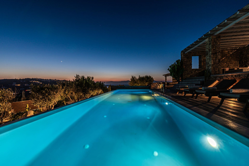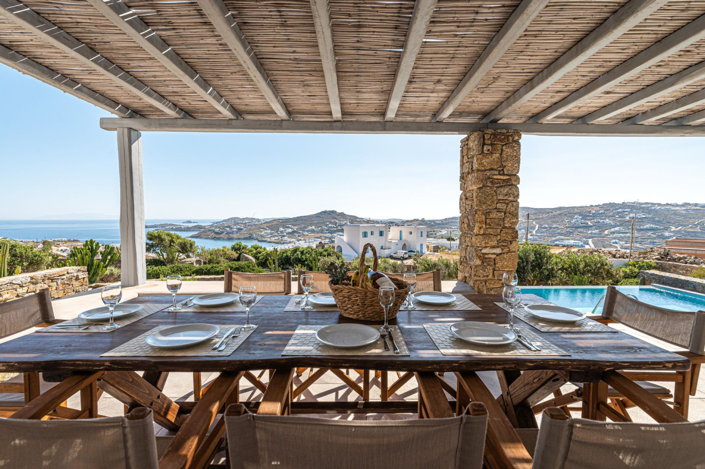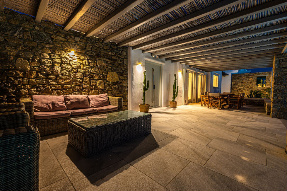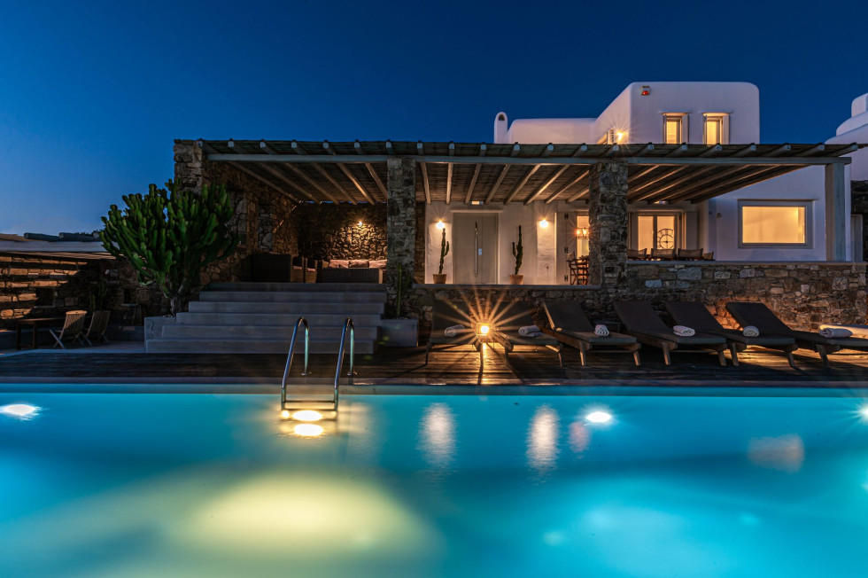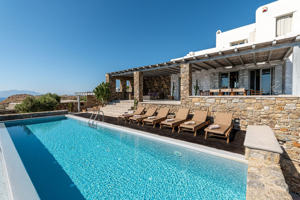 The villa features an impressive private swimming pool surrounded by a large sun terrace overlooking Ornos beach. Sunbeds, a cozy lounge, a dining area, pergolas and BBQ facilities complete the outdoor scenery.