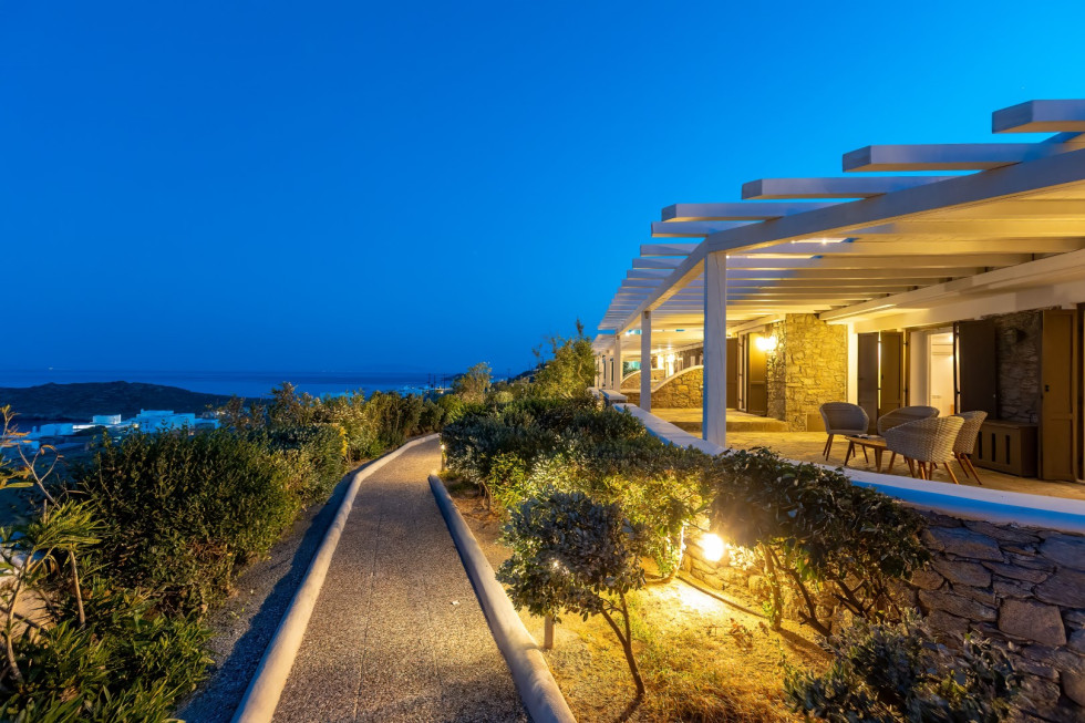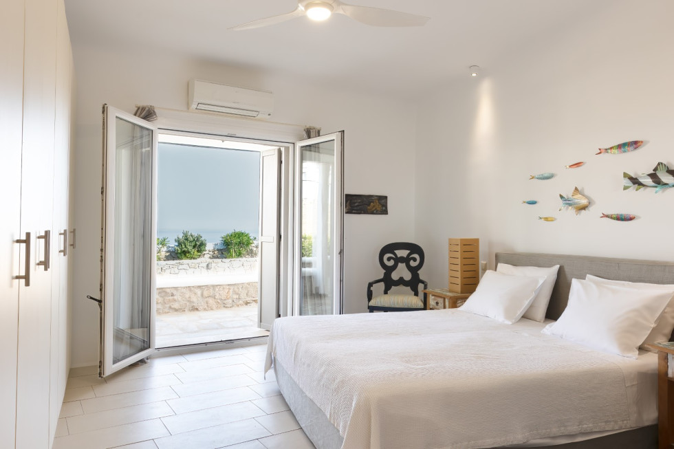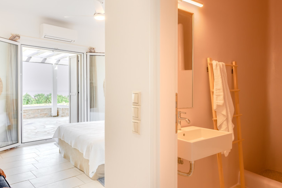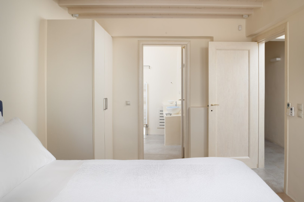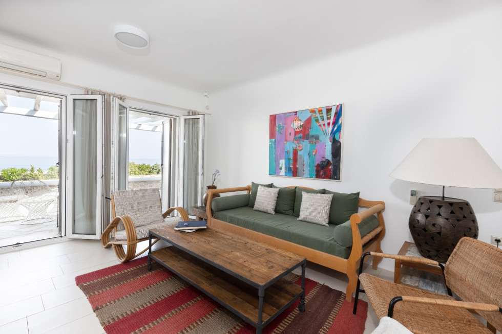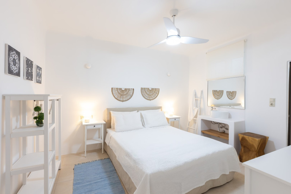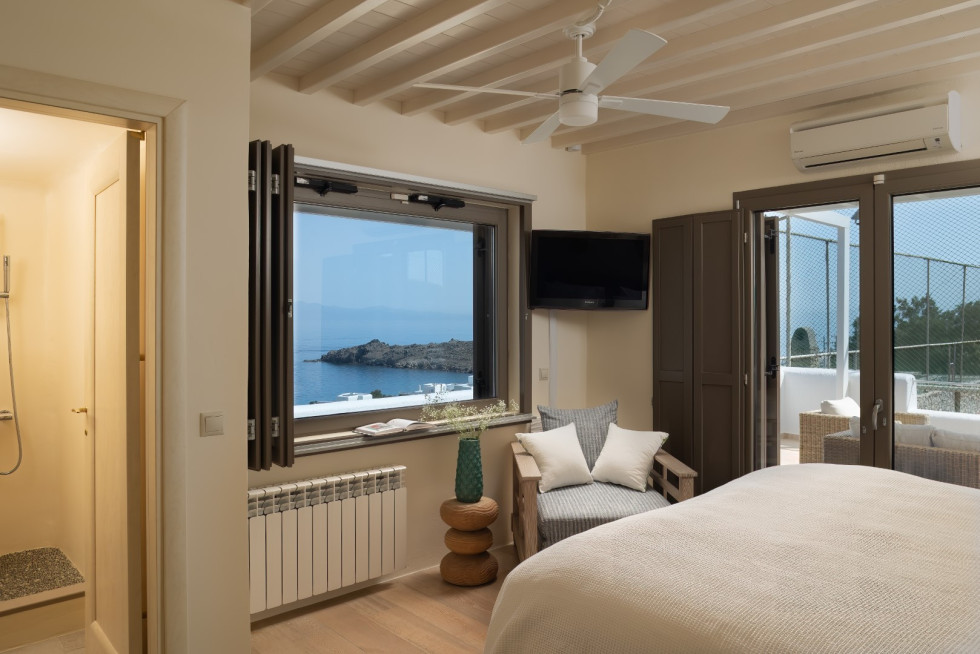Just a short walk away, the serene Glyfadi Beach invites guests to unwind by the water, while the world-renowned beaches of Ornos, Saint John, and Psarrou are within close proximity, offering the perfect blend of relaxation and vibrant island life.