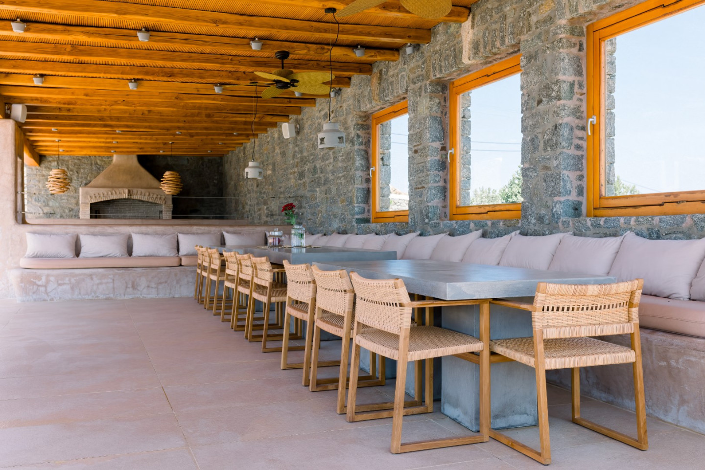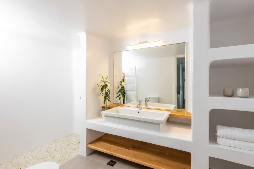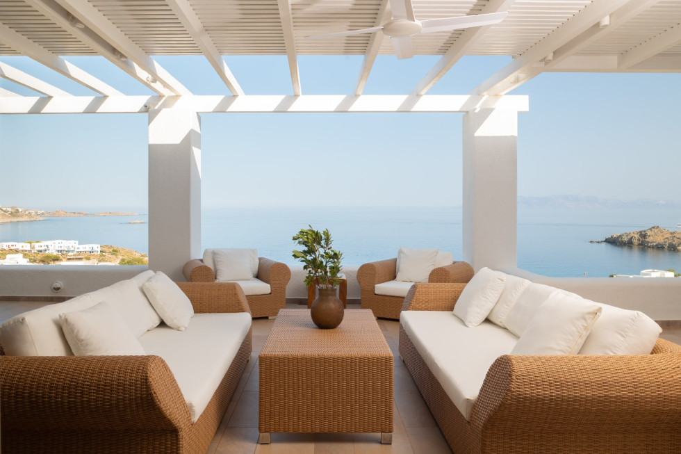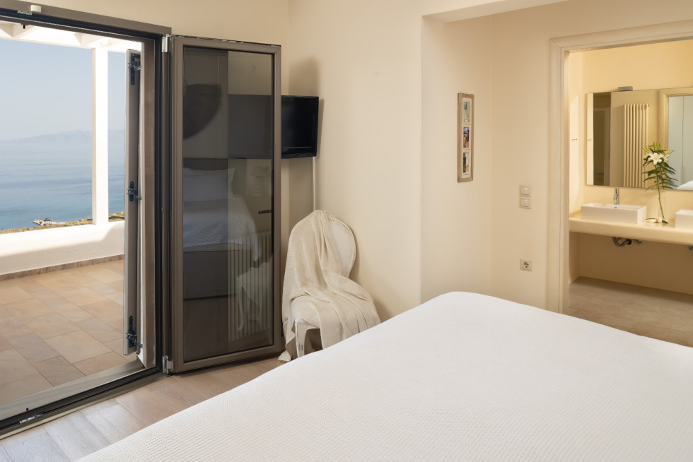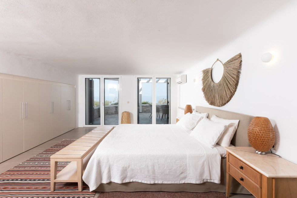 Spanning two levels, the Cycladic Horizon Retreat is designed with both comfort and privacy in mind.