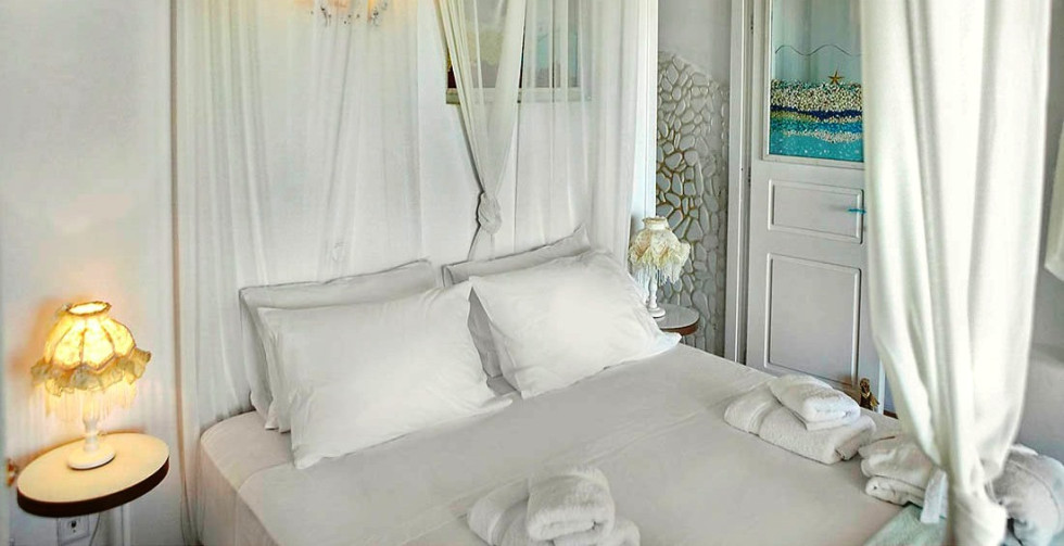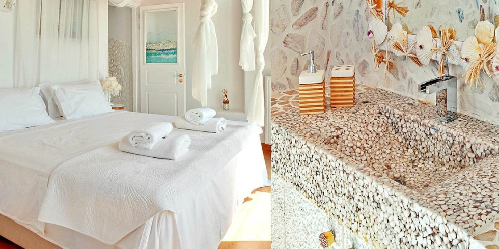 All handcrafted bathrooms of this enchanting villas accommodation are splendidly decorated with natural stones, colorful sea elements and lavish