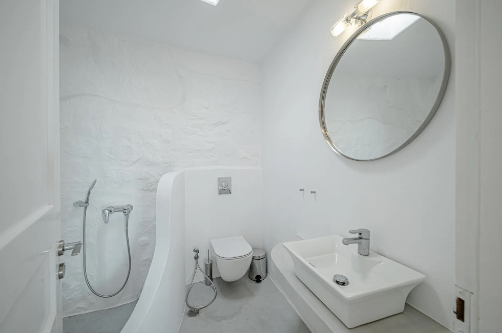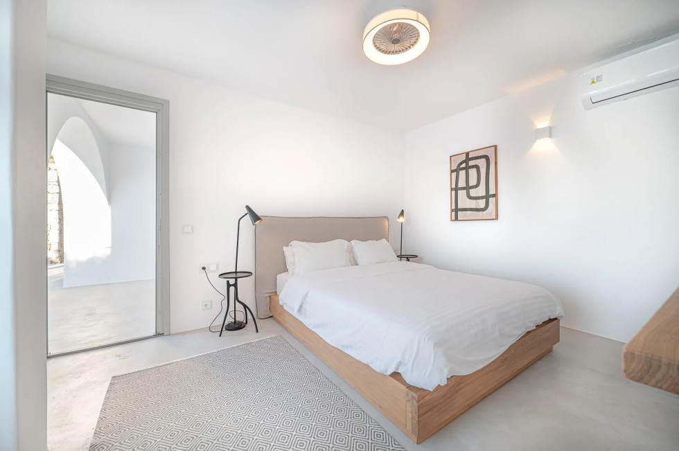 Spanning 280 sq.m., this luxurious 6-bedroom villa perfectly merges traditional Mykonian architecture with sleek, modern interiors. The stark whitewashed walls and natural stone elements contrast beautifully with the deep blues of the sea, creating a serene, elegant atmosphere.