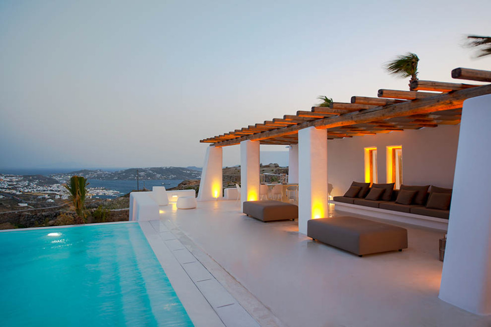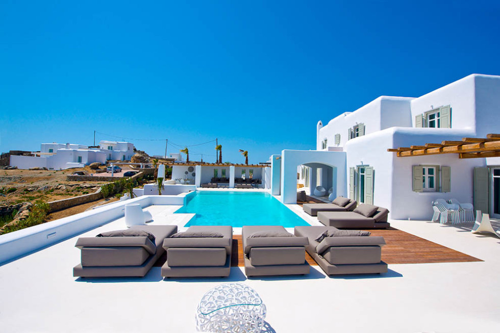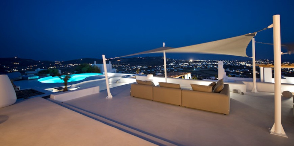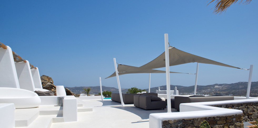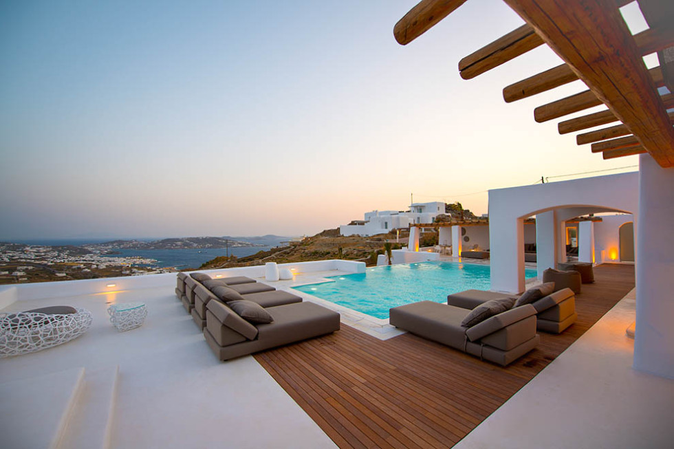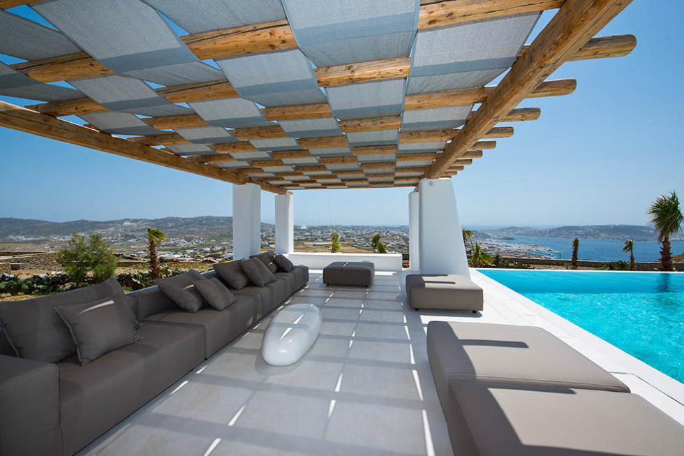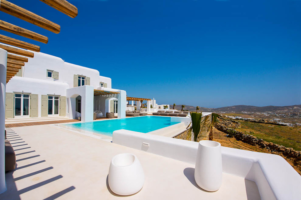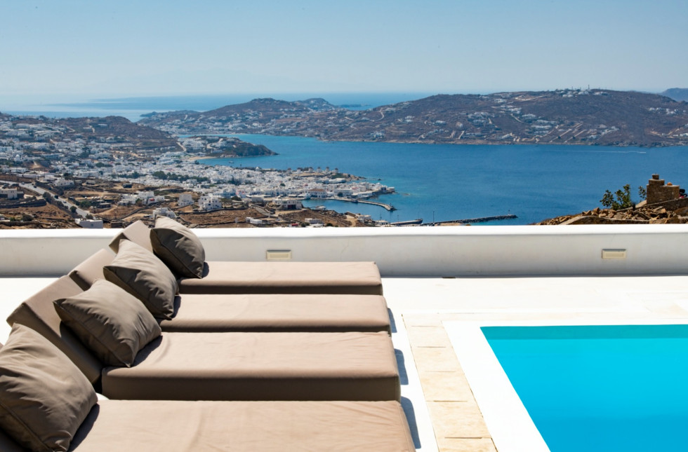 The exclusive villa provides a unique panoramic view of the island and the endless turquoise of the Aegean Sea.