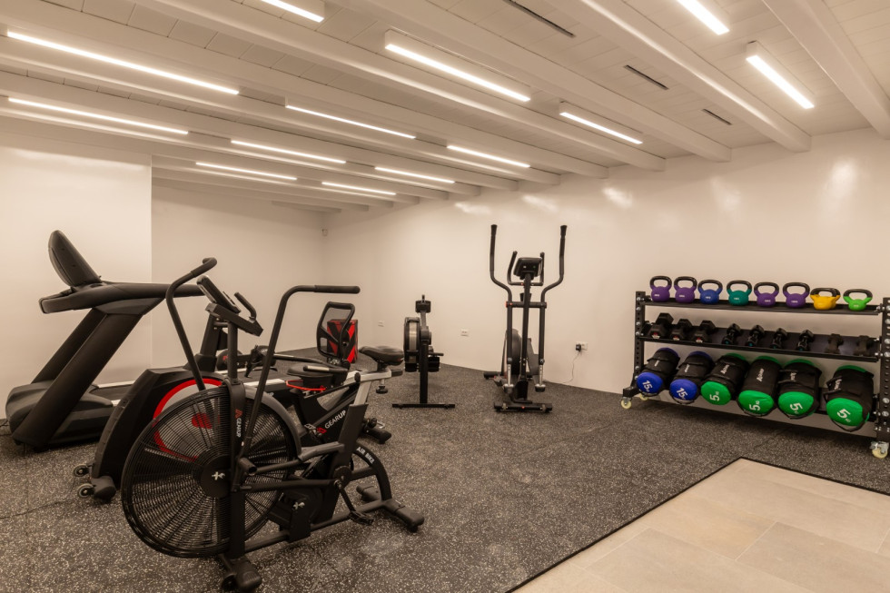 Gym: Fully equipped with a treadmill, steady bicycle, rowing machine, fitness dumbbells, TRX equipment, gym mats, and a 65-inch smart TV. A small bar area enhances the workout experience.