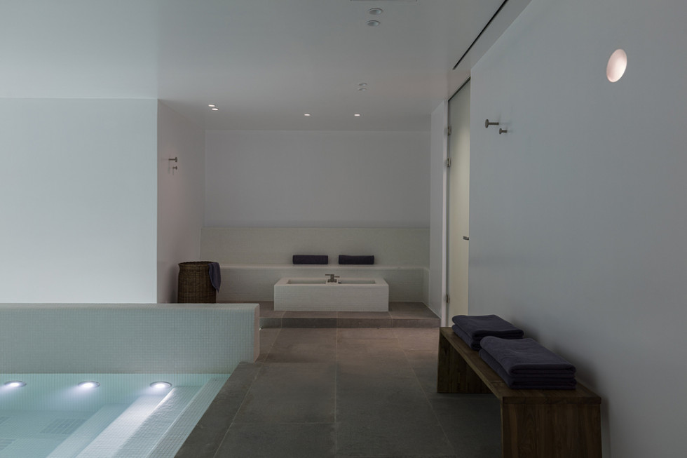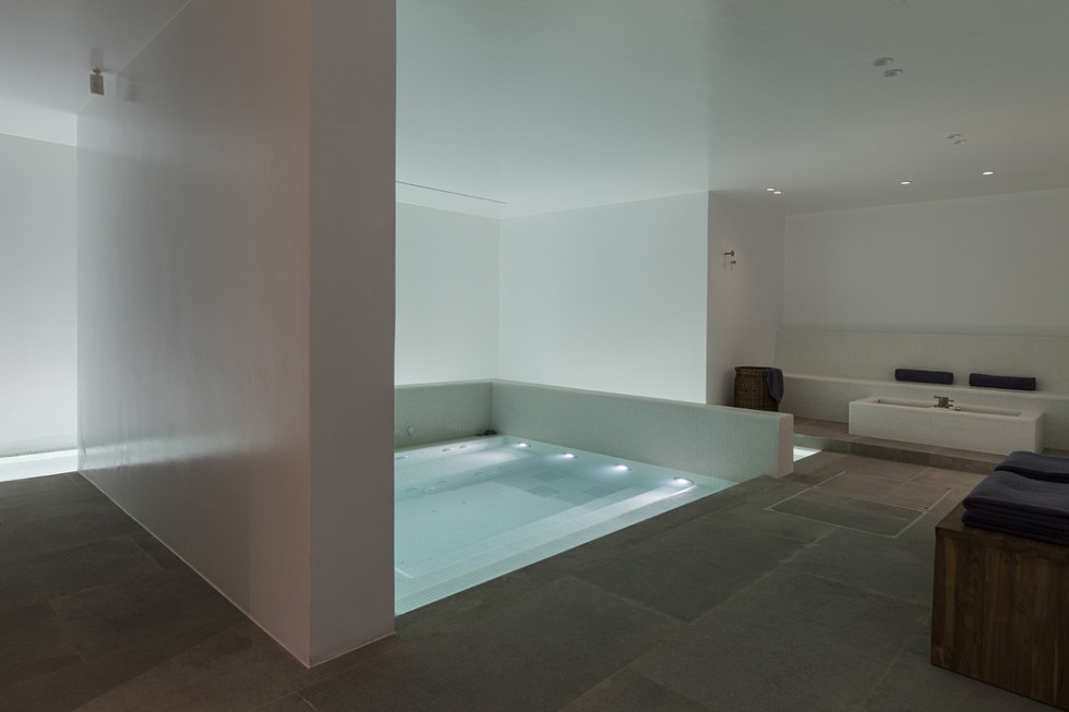 Infinity Swimming Pool (100 sq. meters): Heated upon request (extra charge) with breathtaking, unobstructed sea views. Features sunbeds, coffee tables, and comfortable couches for relaxation.