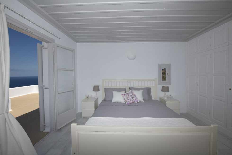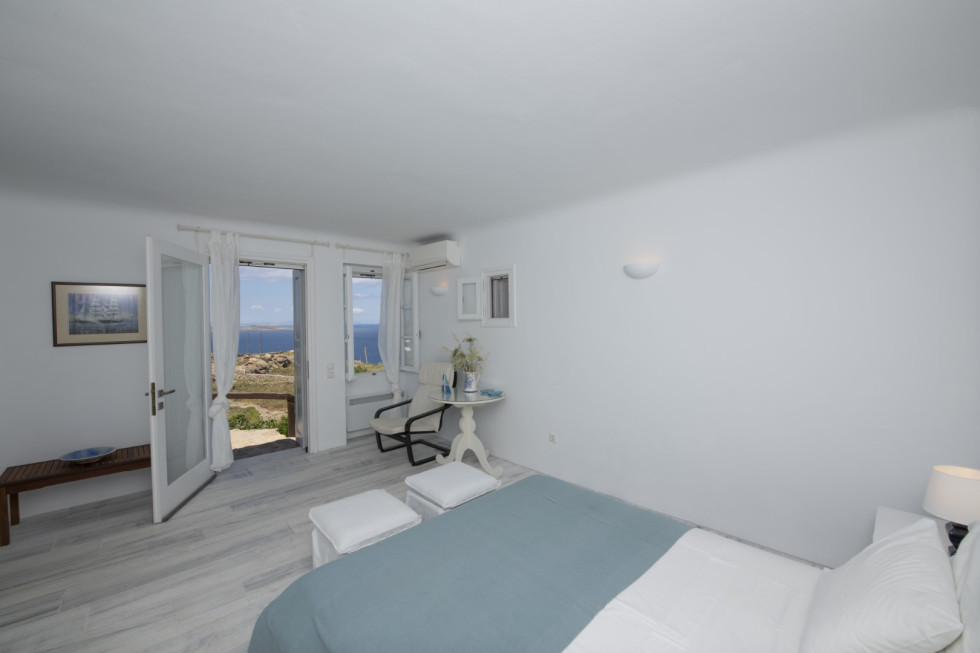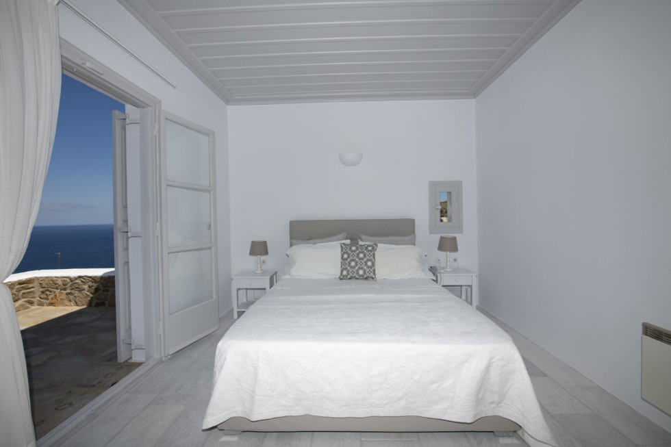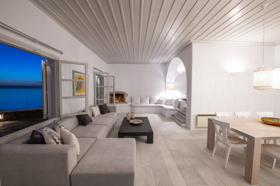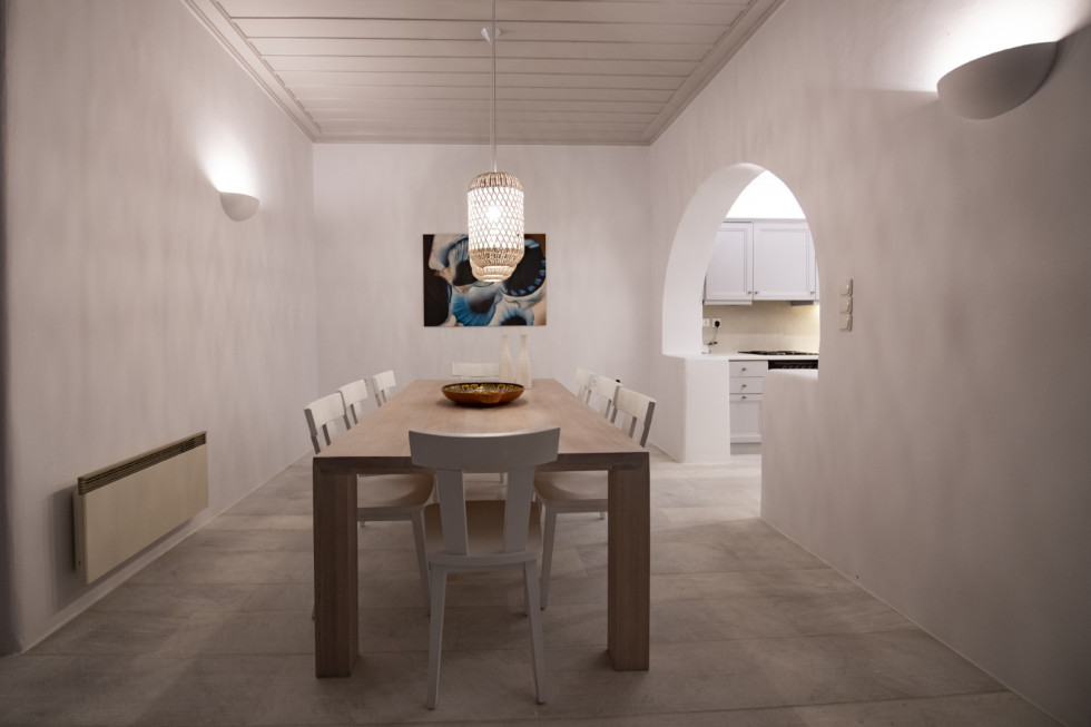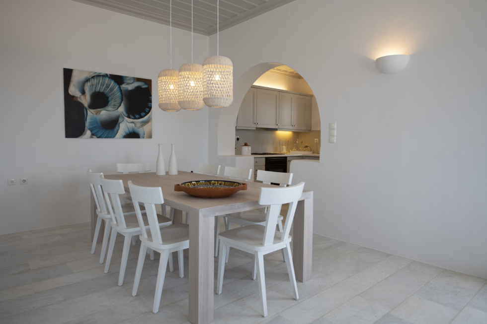The interior design of the residence follows simple Cycladic style, with the use of wood giving a more traditional tone.