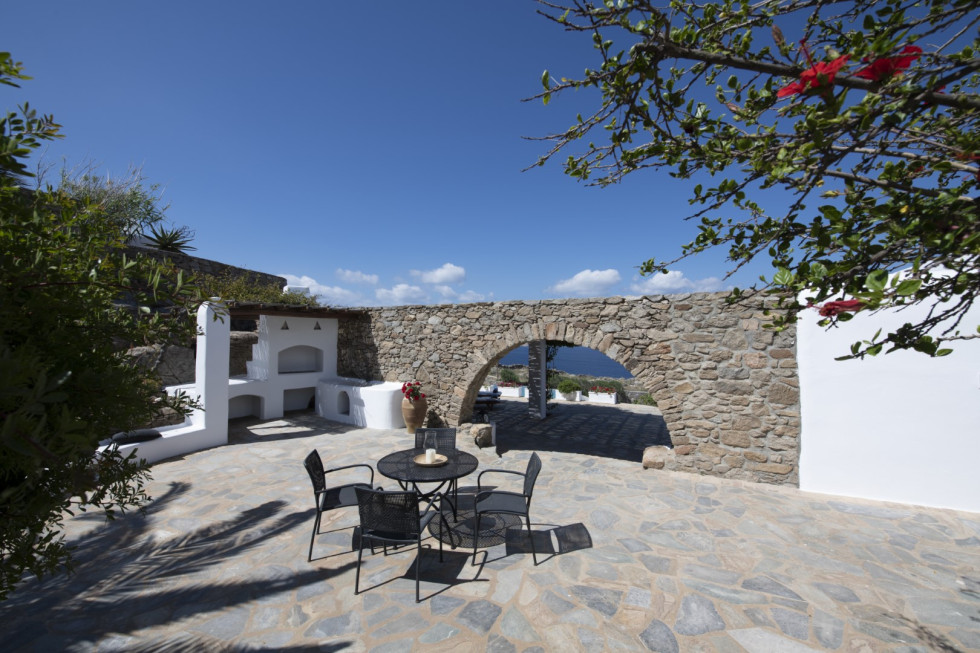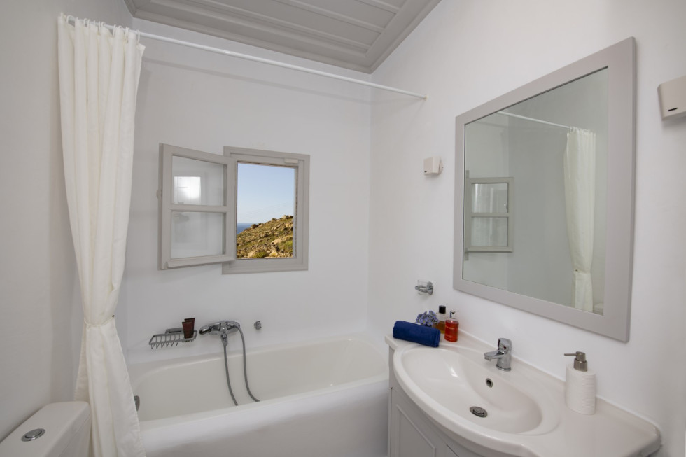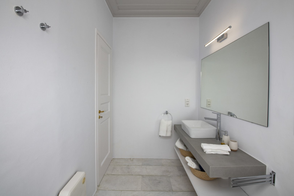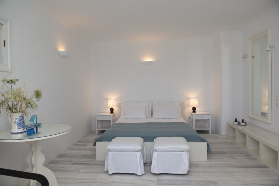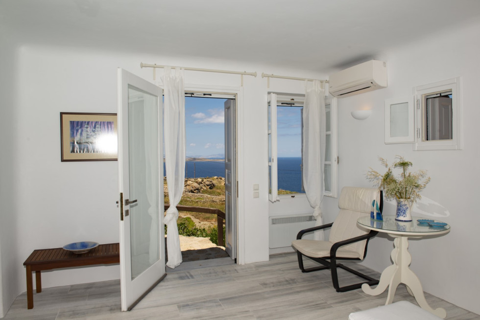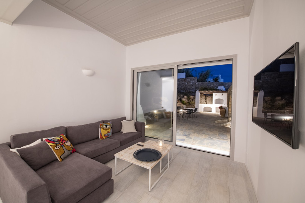 The interior design of the residence follows simple Cycladic style, with the use of wood giving a more traditional tone.