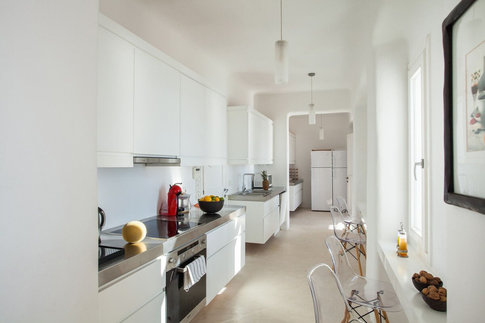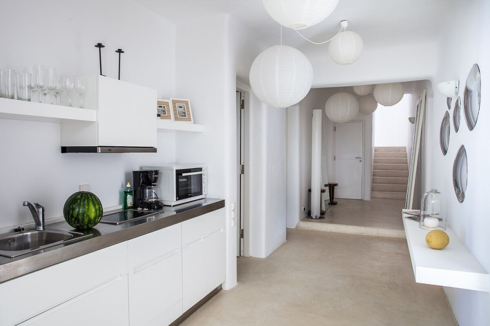 The interior decor of the property boasts a minimal theme, heavily influenced by solid white surfaces and furnishing which is wisely blended with the darker colors of the cimentogonia floors and darker-toned details.