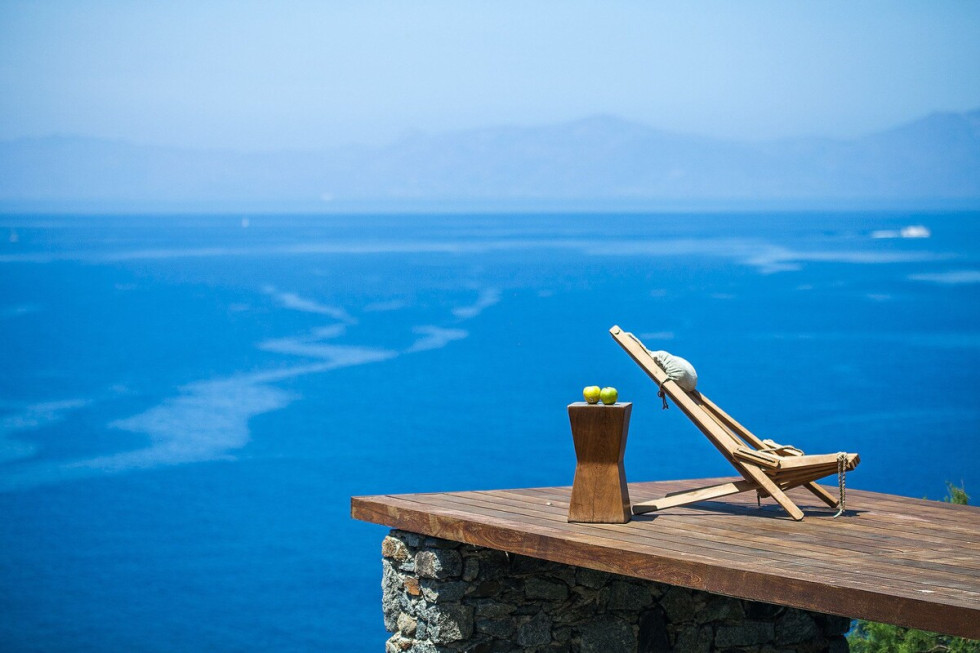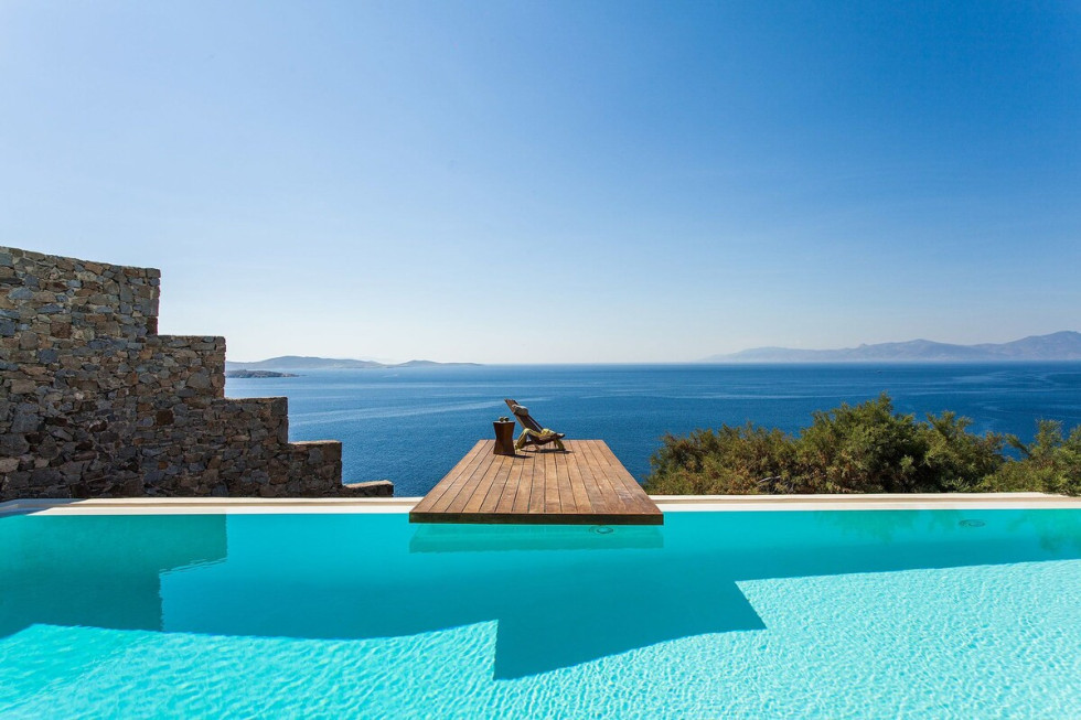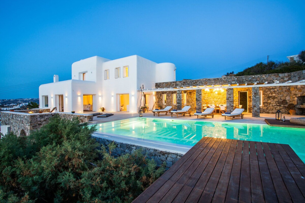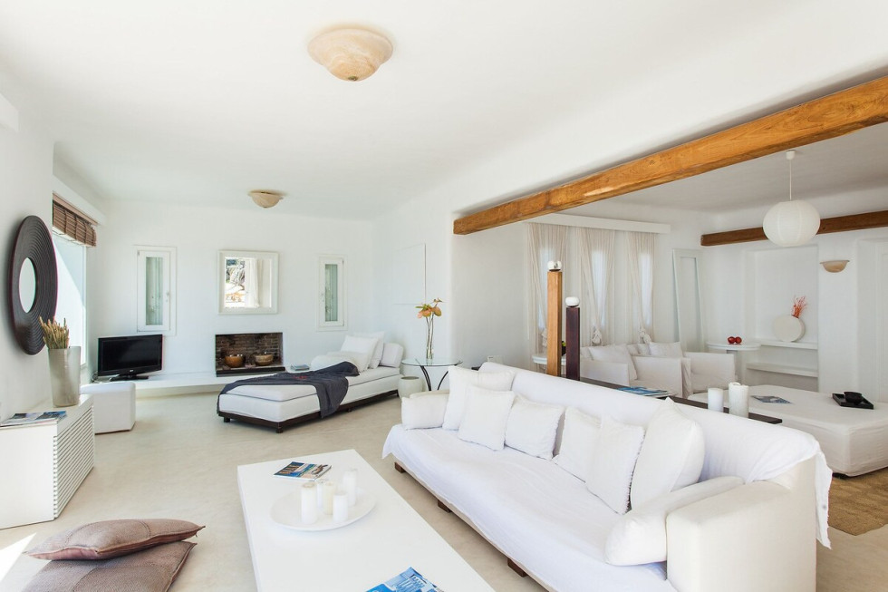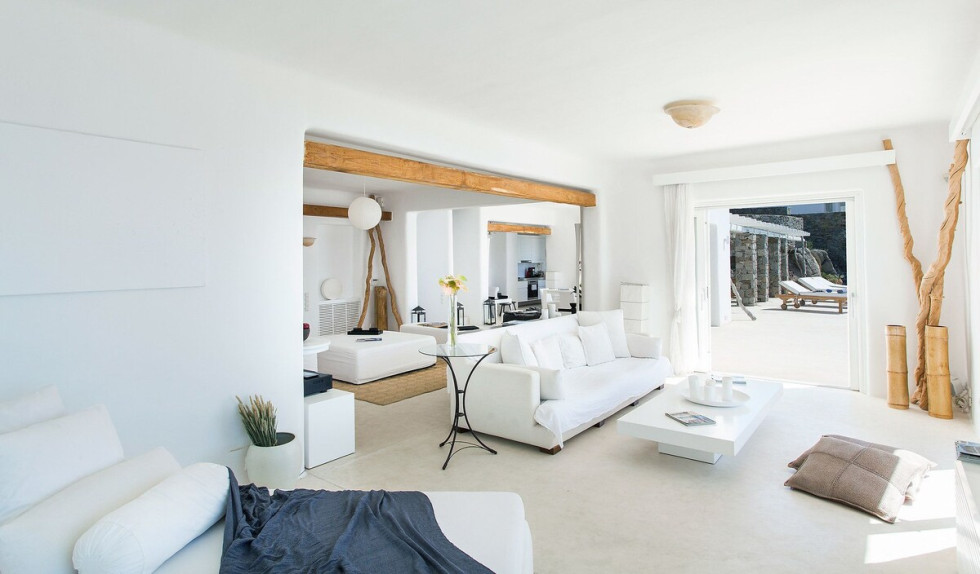 The villa faces west granting panoramic views of the sunset over the Aegean sea and the islands of Delos and Rhenia, while its southwestern position on the island provides easy access to the island’s Chora and the nearby beaches of Agios Ioannis and Ornos. Esperida’s pool terrace surrounds the front of the property, generous in space and providing both sunbathing options as well as a shaded outdoor dining area.