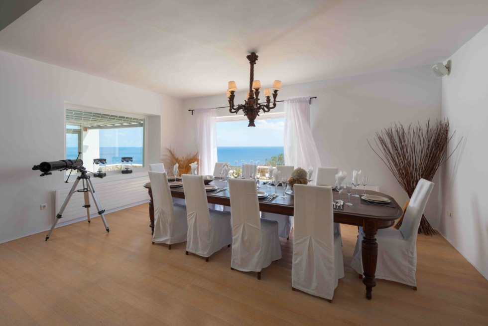 The ground floor of villa Carina consists of an open kitchen with large indoor dining and living room with a TV & A / C system.