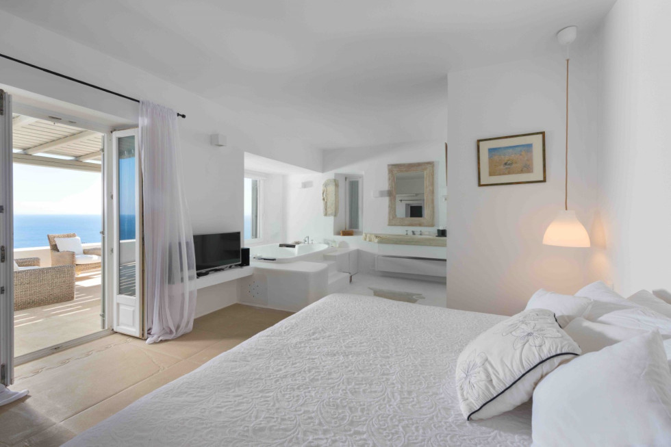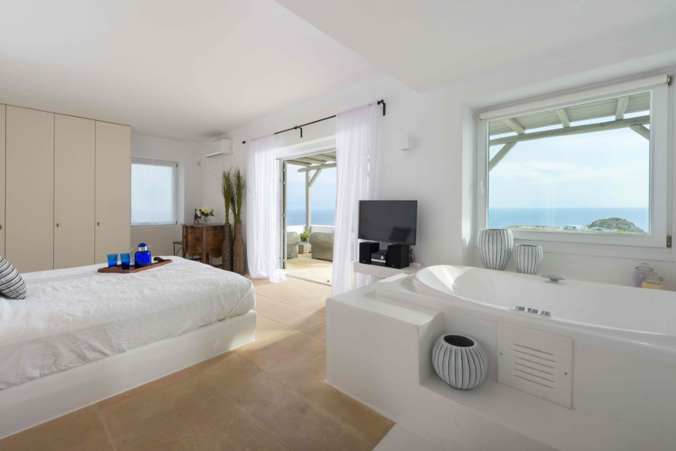 1 Master Bedroom with a double bed, A / C system, en-suite bathroom with shower and a Jacuzzi, front terrace access through balcony door to the outdoor sitting area covered by a pergola, sea view. Guests are able to enjoy the amazing sea view from their bed and from the Jacuzzi.