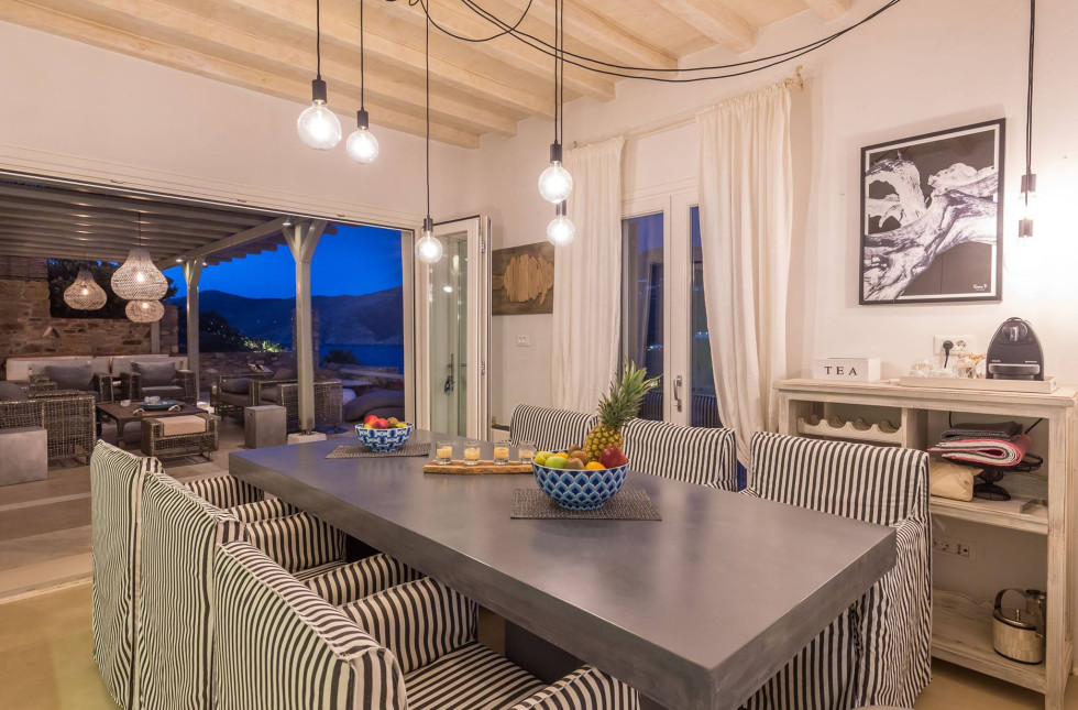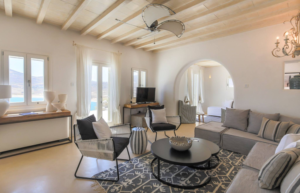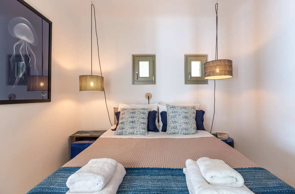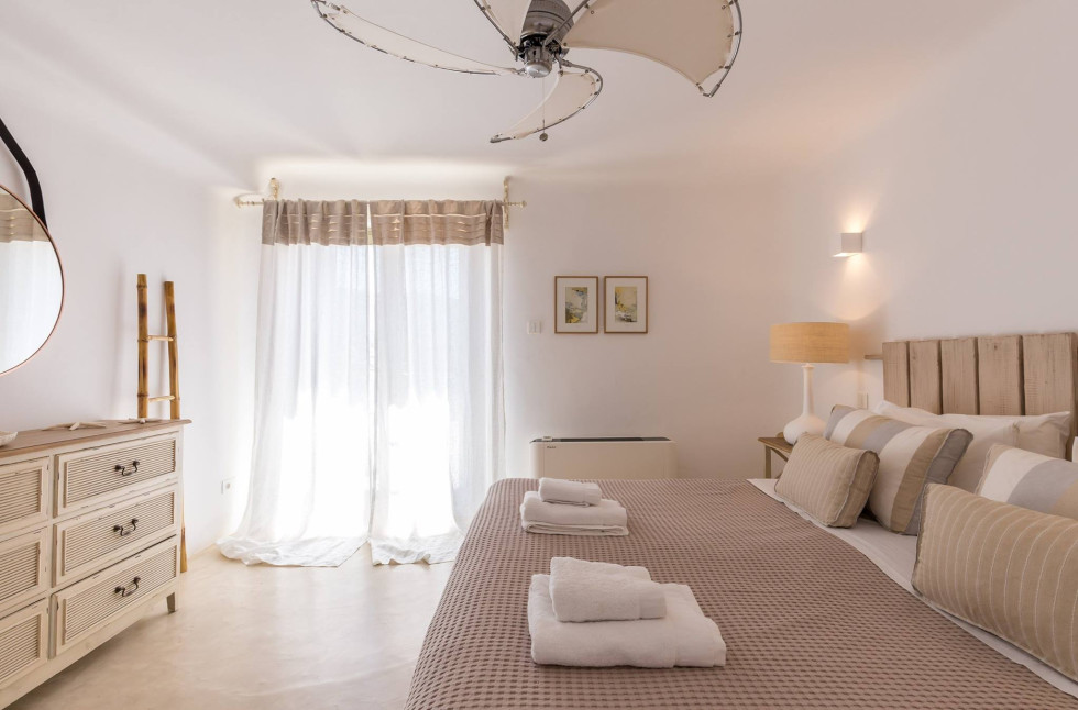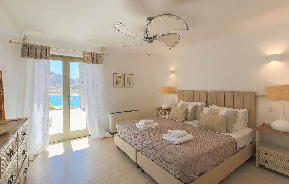 Two spacious suites can be found on the lower level overlooking Ftelia Bay with a shared balcony.
