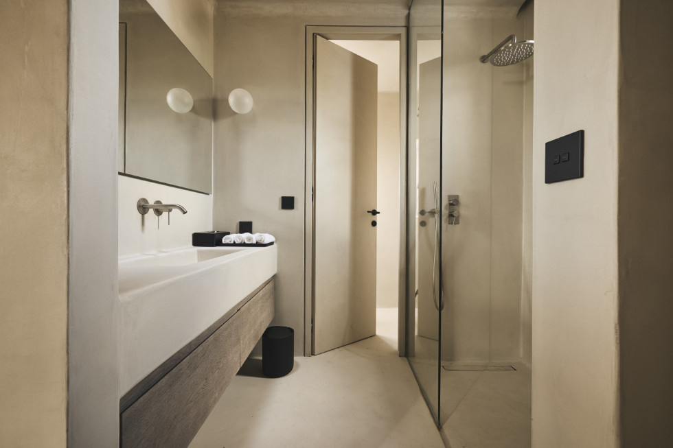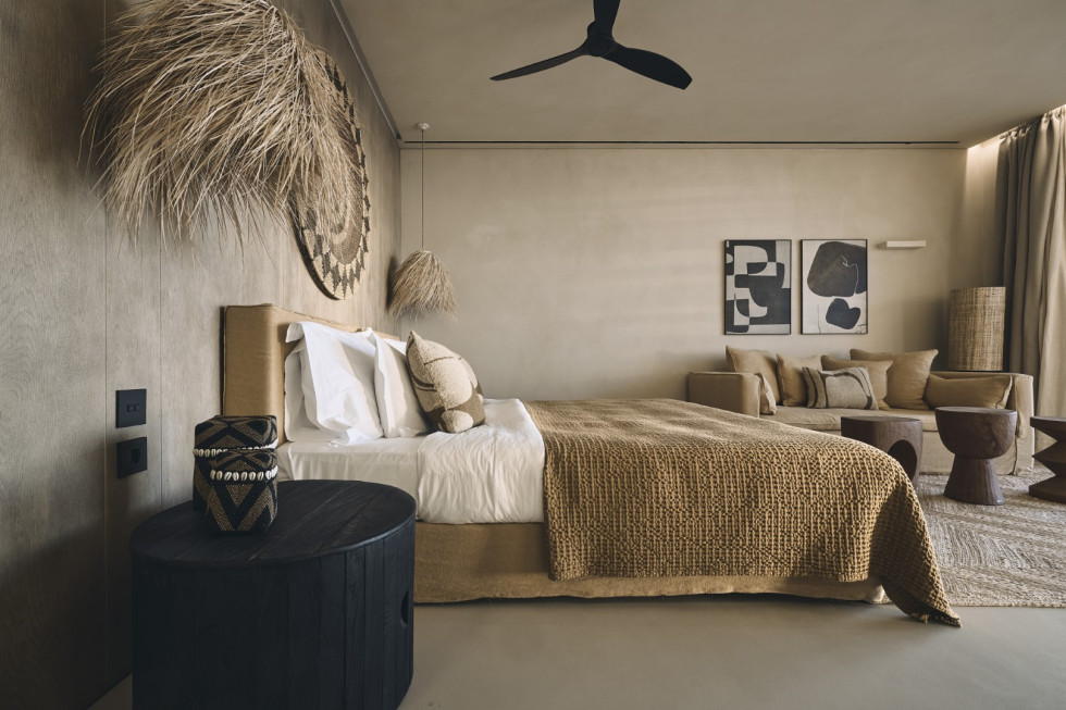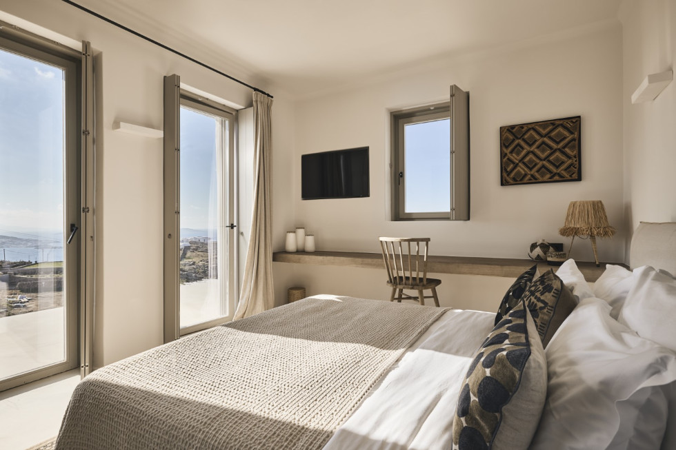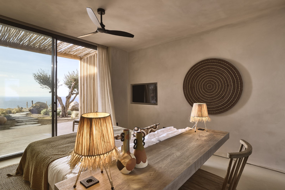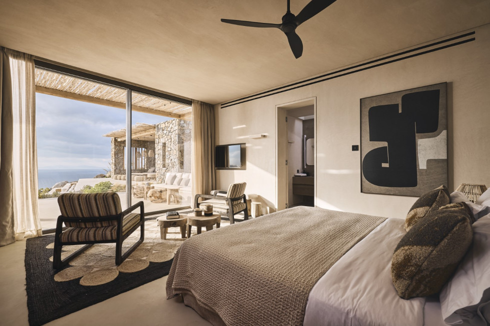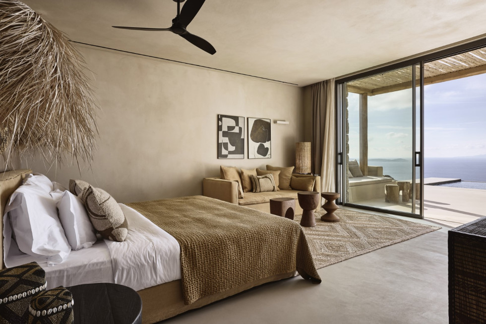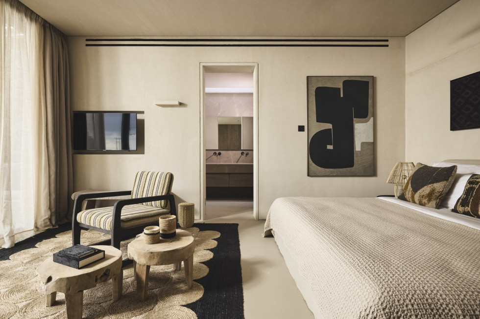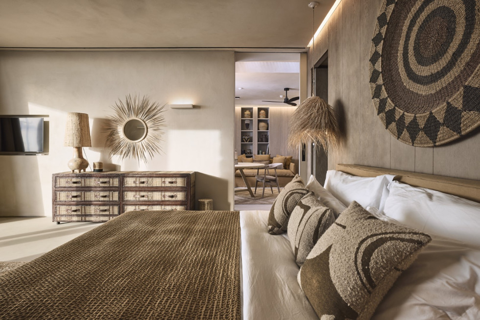 1 master suite 84 m2 with lounge/workspace area, en-suite bathroom with shower, safe room, king size bed, mini bar, safe box, flat Smart TV, type-C fast charge ports, outdoor lounge, direct access to the main pool area, unobstructed sea and sunset views.