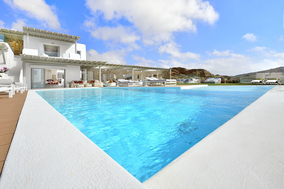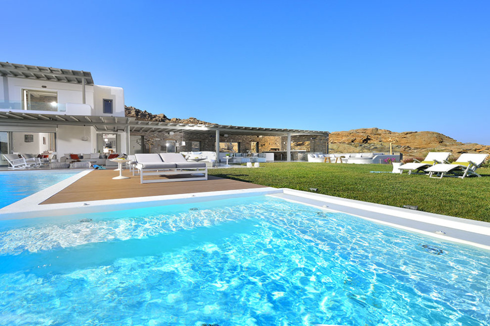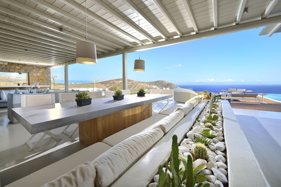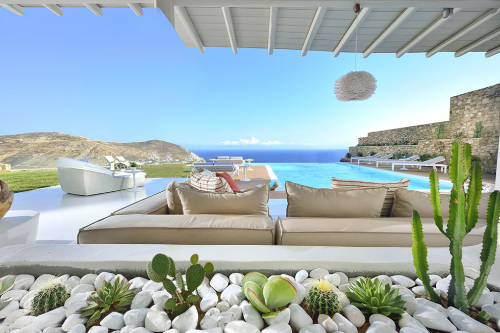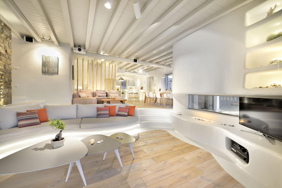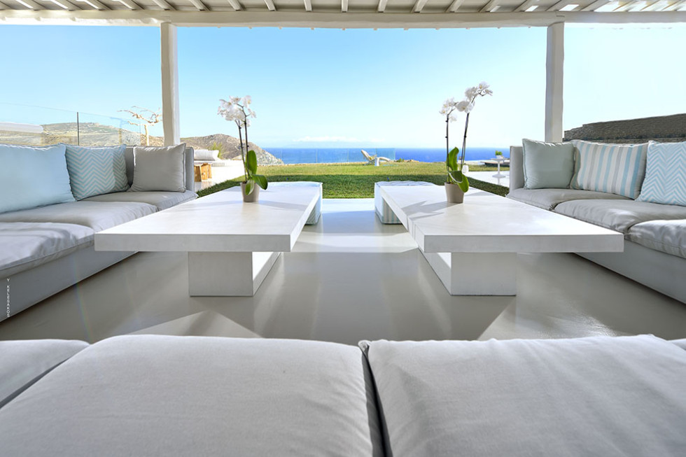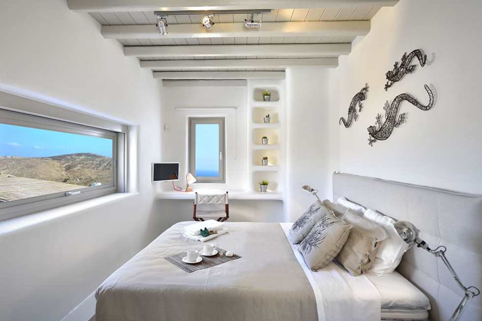 The Mykonos villa unfolds in two levels and consists of six comfortable bedrooms with en suite bathroom facilities and a separate guest bedroom.