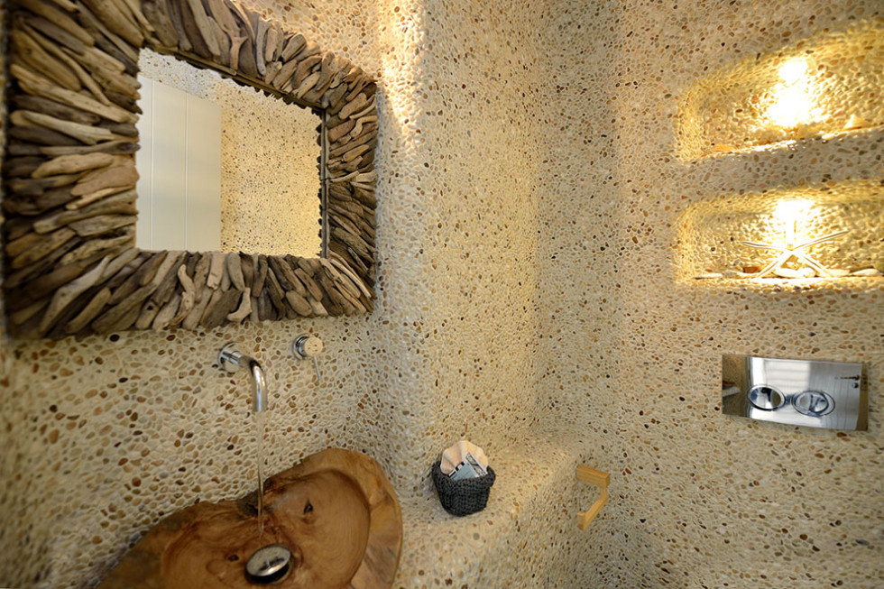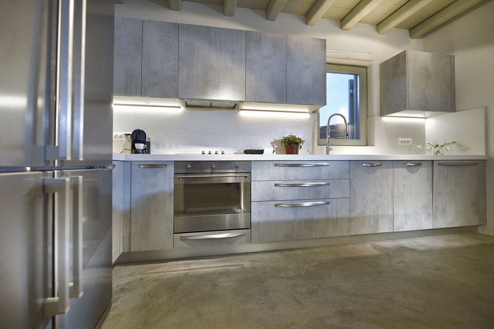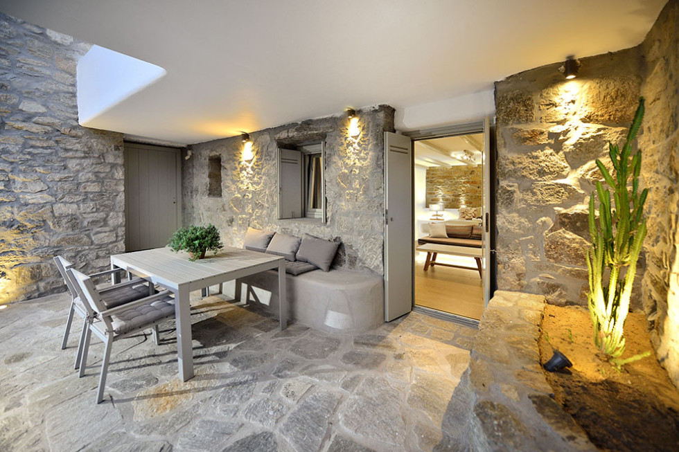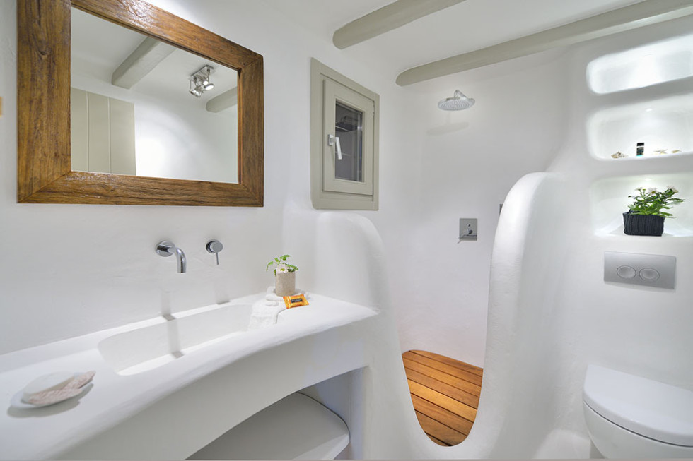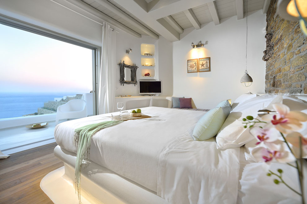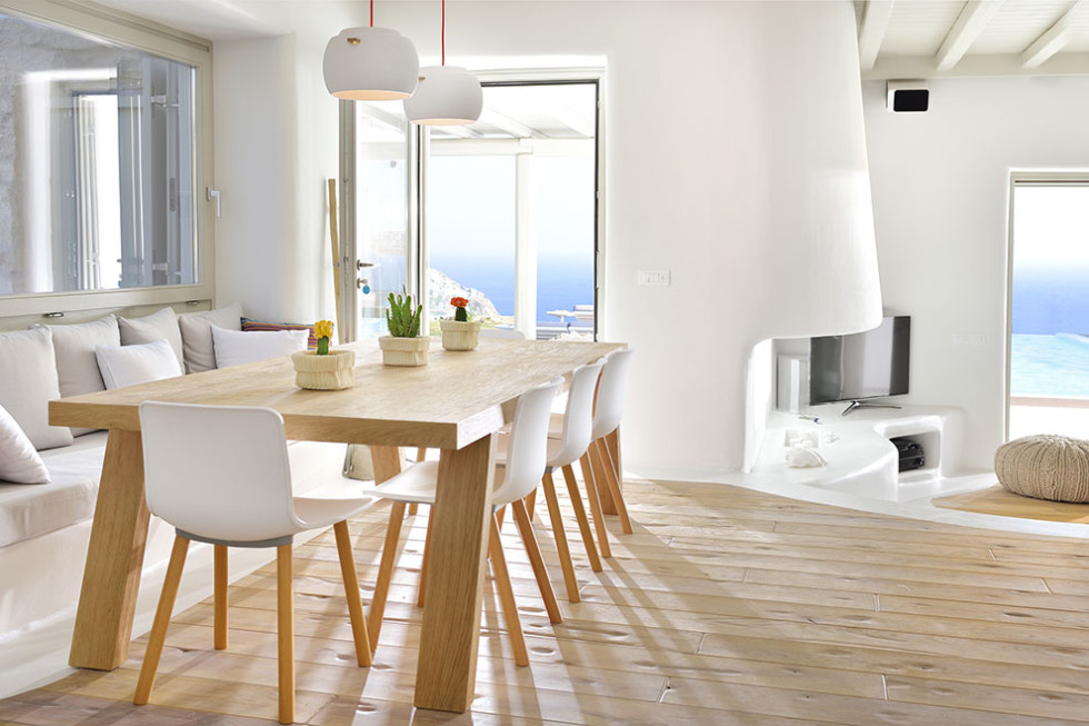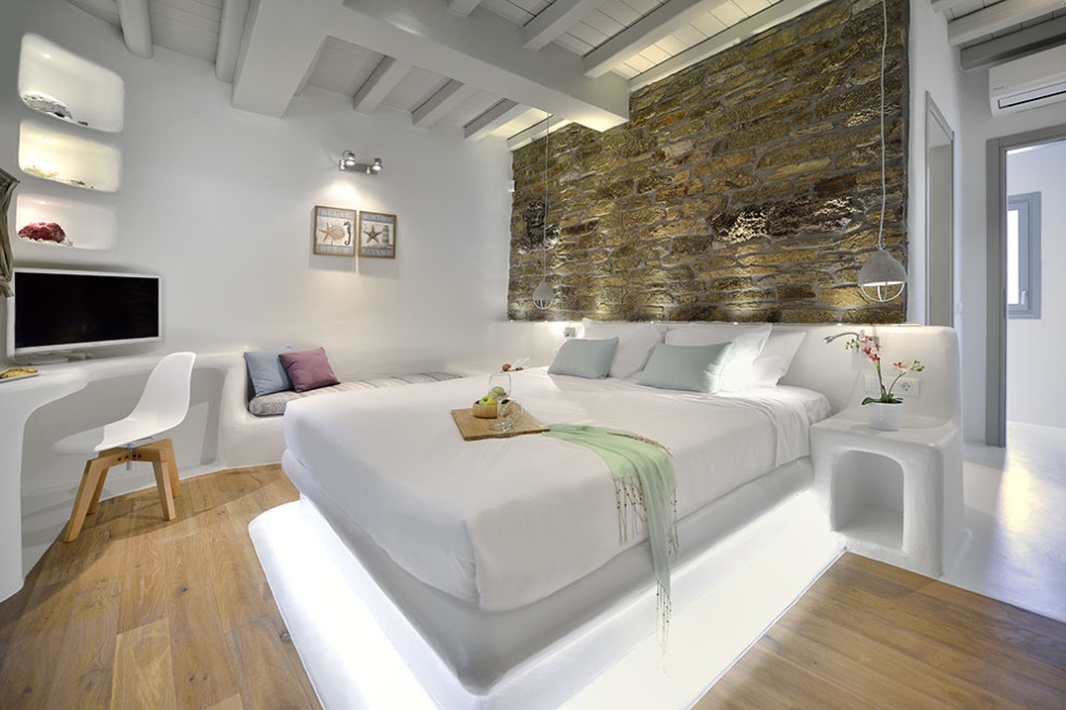 The Mykonos villa unfolds in two levels and consists of six comfortable bedrooms with en suite bathroom facilities and a separate guest bedroom.
