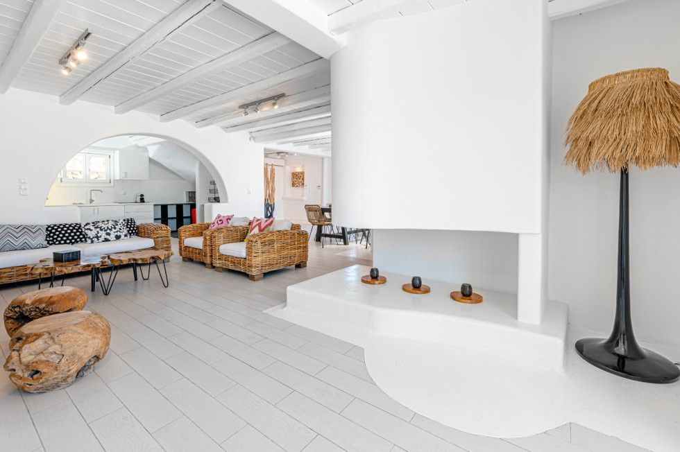 When not enjoying the private pool, jacuzzi, or outdoor BBQ area, guests can unwind while watching the famous Mykonian sunset from one of the island’s most privileged vantage points. The tranquil Delfini Beach is just a short walk away, while the cosmopolitan village of Ornos lies only 3 km from the villa, offering vibrant beach clubs, restaurants, and nightlife.