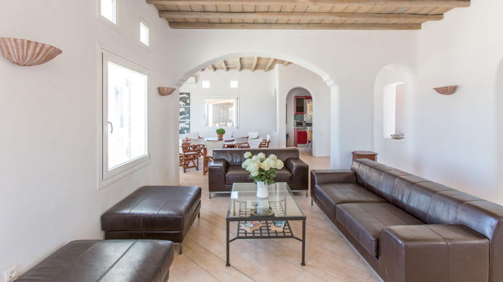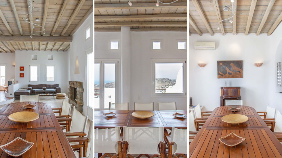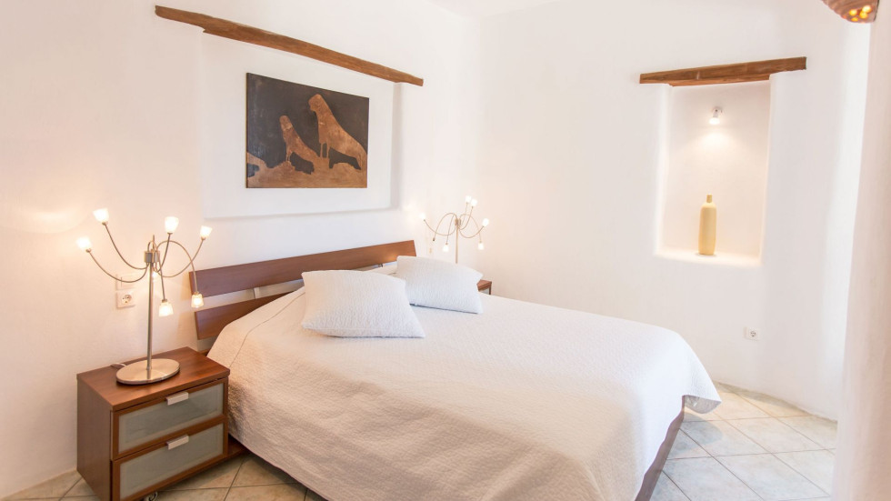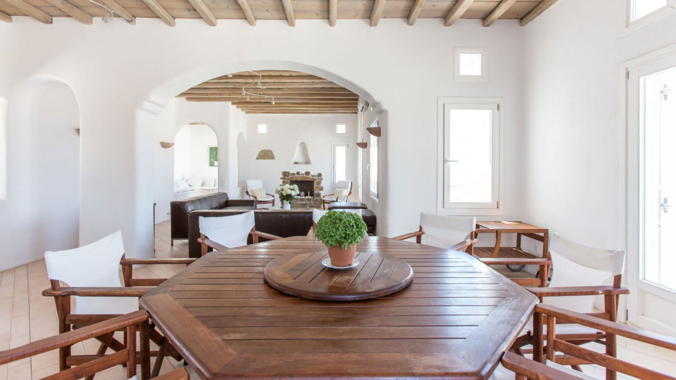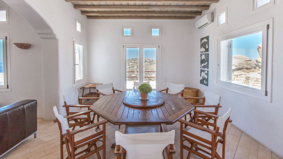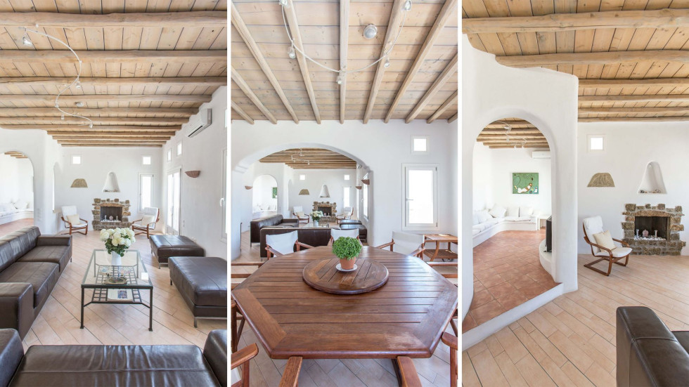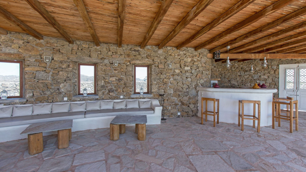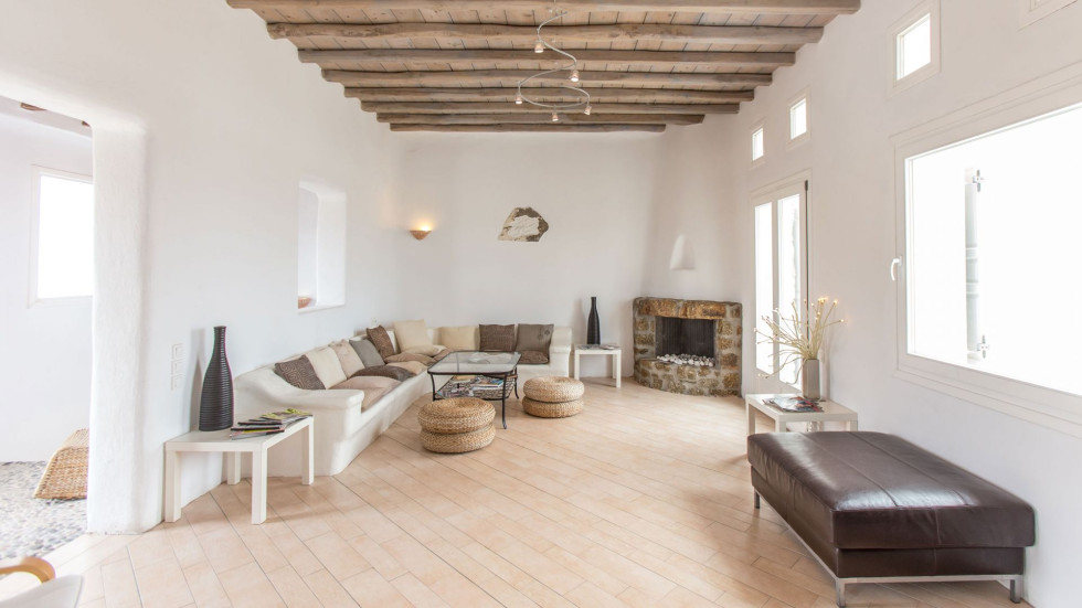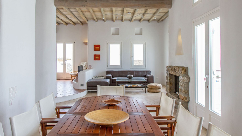 The interiors boast a refined blend of traditional Myconian style and modern luxury, with whitewashed walls, natural stone accents, and high-end furnishings. Floor-to-ceiling French doors flood the living spaces with natural light, creating an open, breezy atmosphere that invites the outside in.