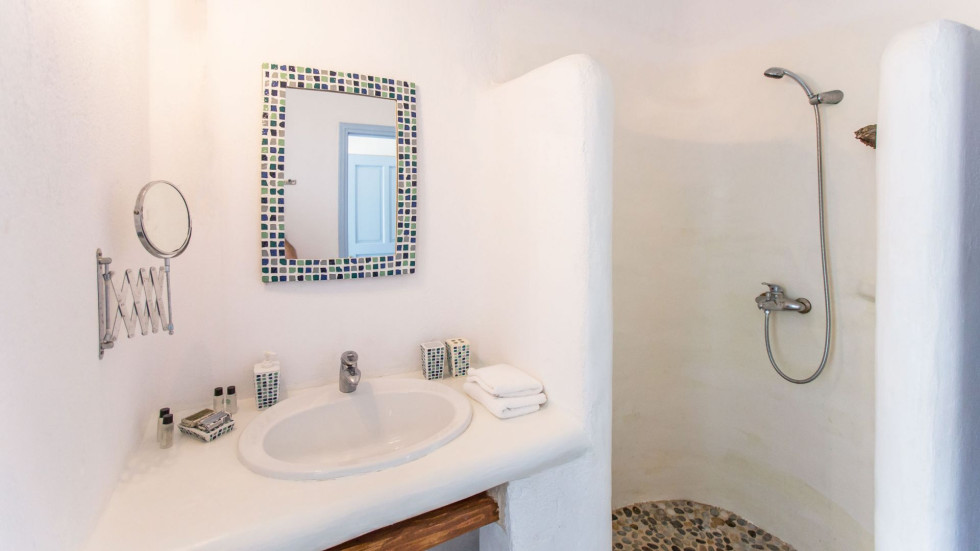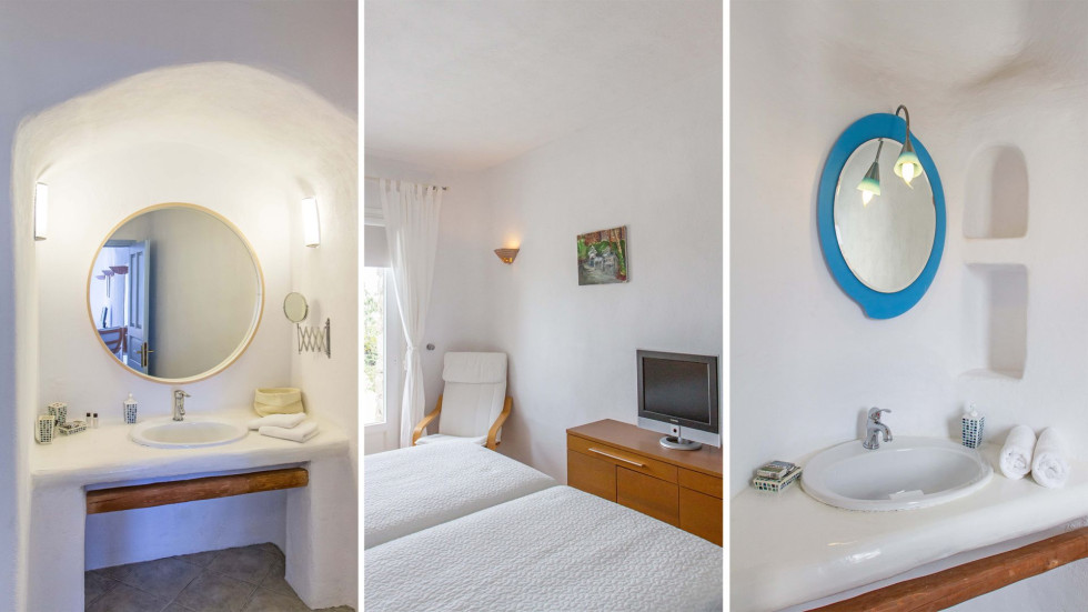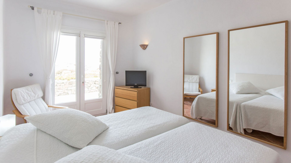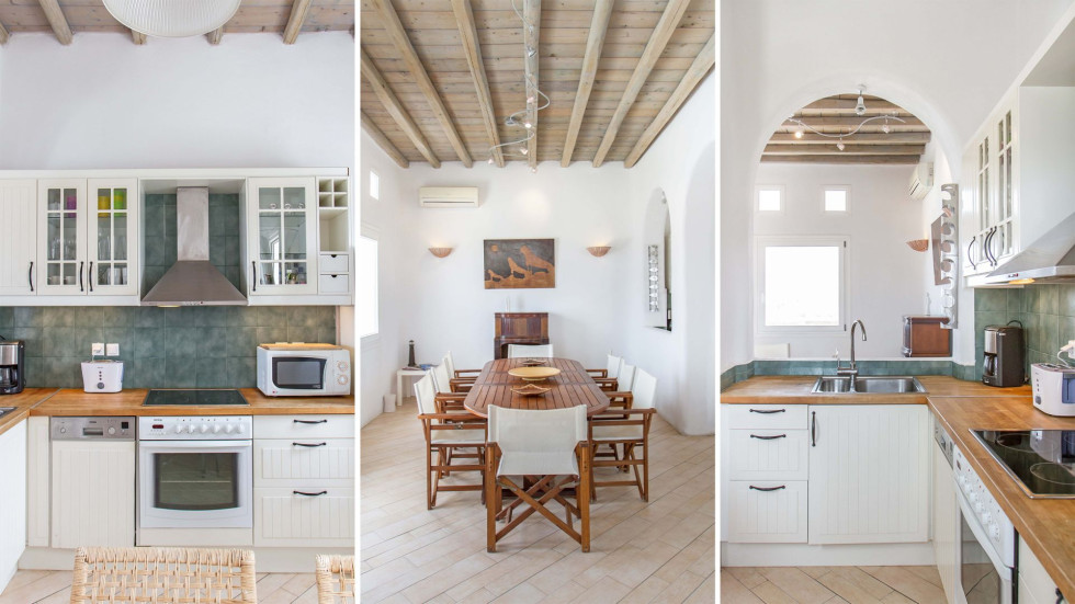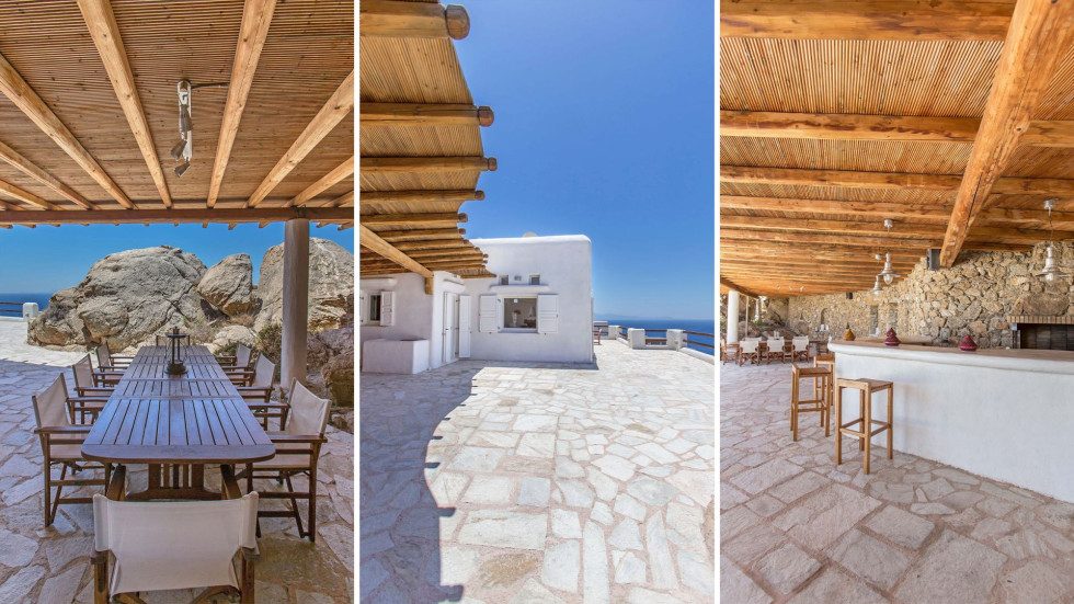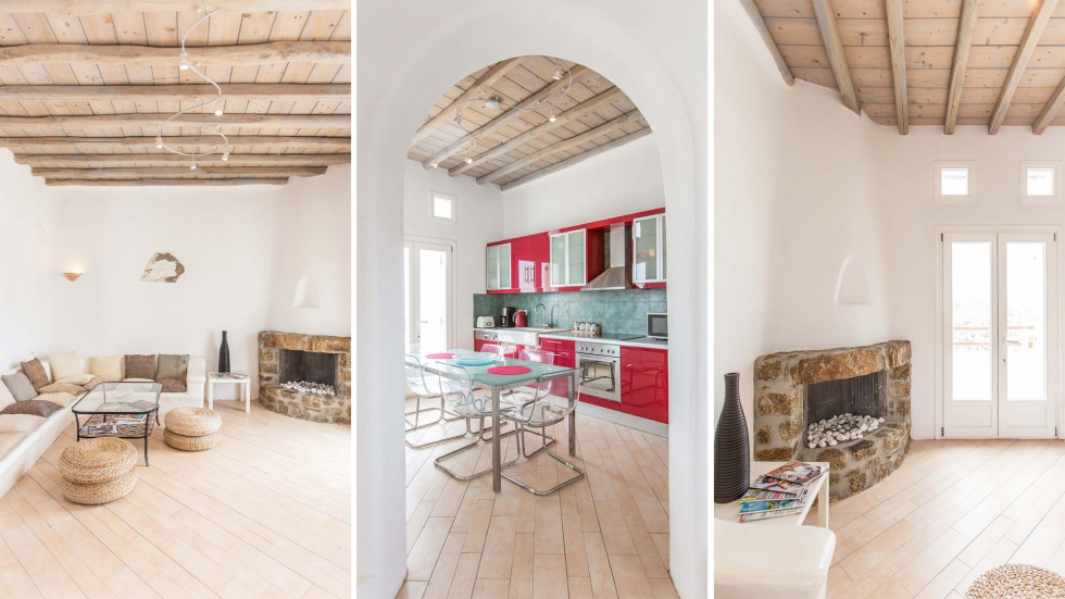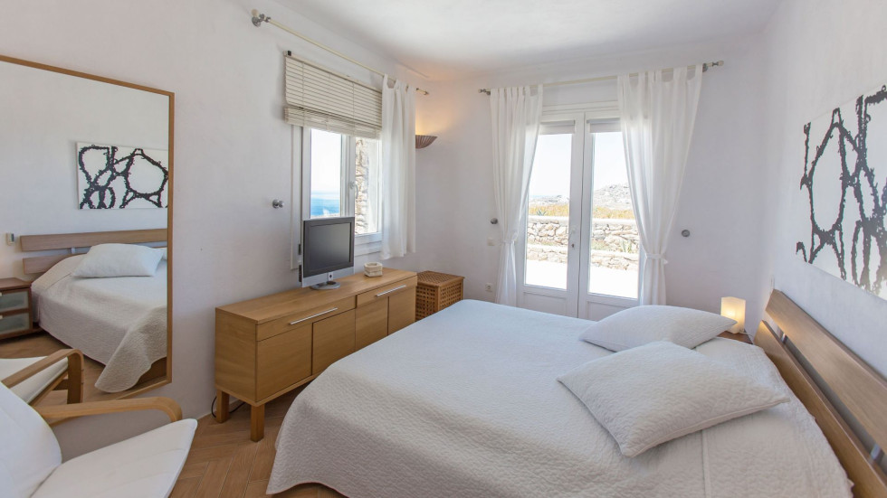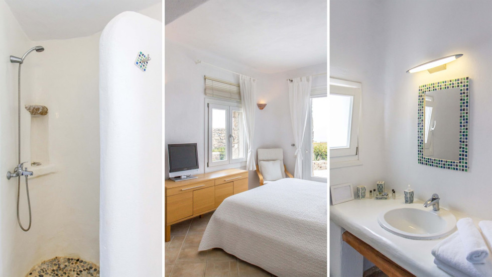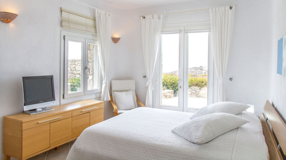 The interiors boast a refined blend of traditional Myconian style and modern luxury, with whitewashed walls, natural stone accents, and high-end furnishings. Floor-to-ceiling French doors flood the living spaces with natural light, creating an open, breezy atmosphere that invites the outside in.