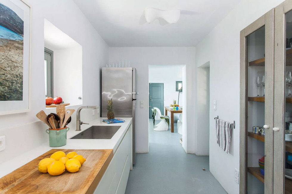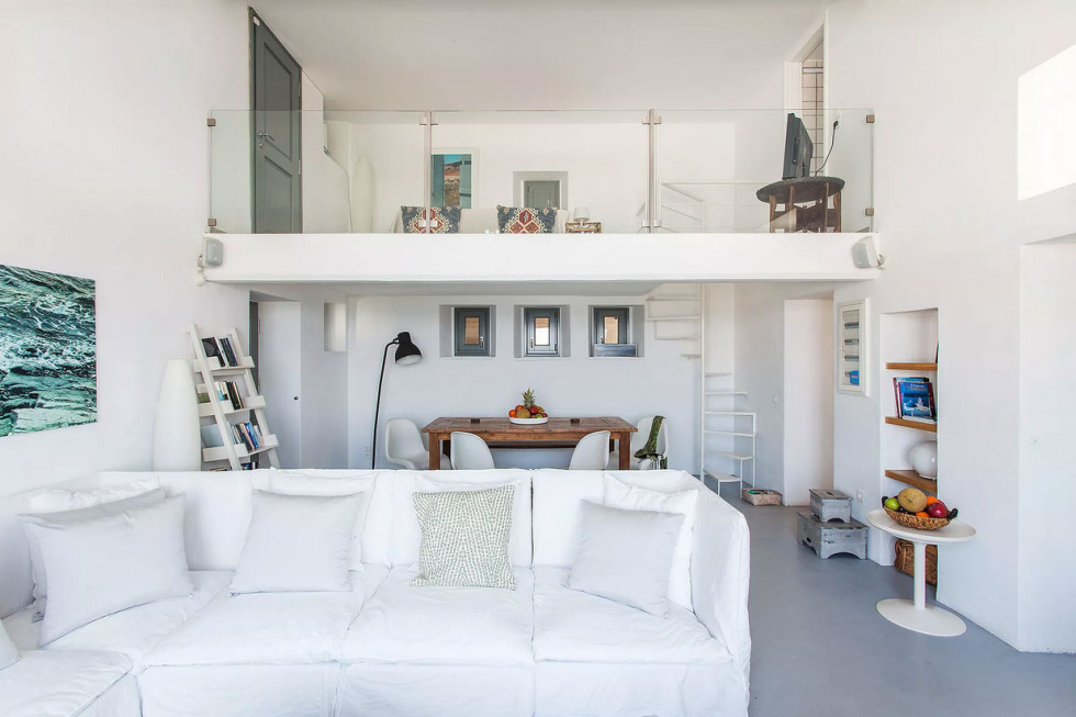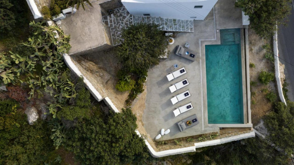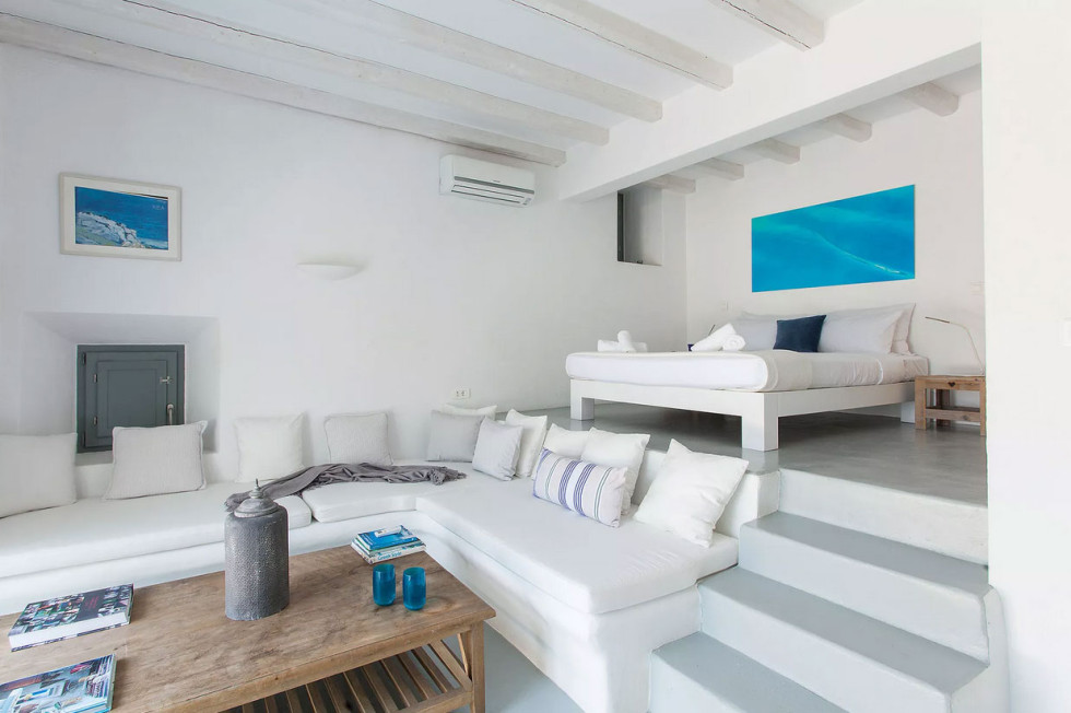 Inside, an airy living space with a seamless blend of modern design and sculptural 70s influences sets the tone for elegance and comfort. A large window invites the outside in, offering breathtaking views of the Aegean and Mykonos Town. A sleek, fully equipped kitchen caters to culinary enthusiasts, while a stylish mezzanine lounge adds an artistic touch.