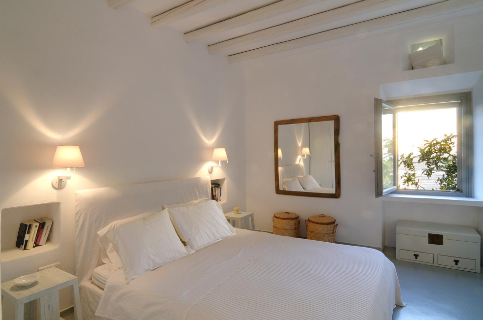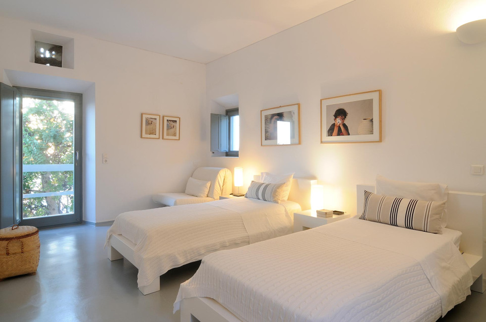 The villa’s tranquil bedrooms embrace minimalistic sophistication, with crisp white interiors, plush bedding, and wooden-framed windows that welcome the refreshing sea breeze. Designed for relaxation, each space ensures a peaceful retreat after sun-soaked adventures.