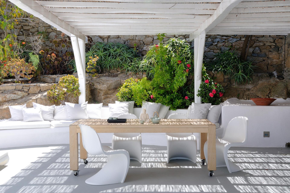 At the heart of the villa, a serene stone-paved courtyard seems to emerge from the natural rock formations surrounding it. Bursting with colorful flowers, this hidden oasis features a pergola-shaded lounge, a cozy dining area, and an open-air jacuzzi—offering a private retreat to unwind. A small terrace at the courtyard’s edge frames uninterrupted views of the Mykonian seascape and the island’s famous windmills.