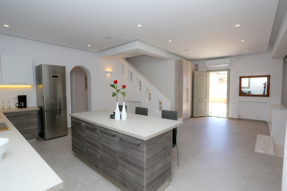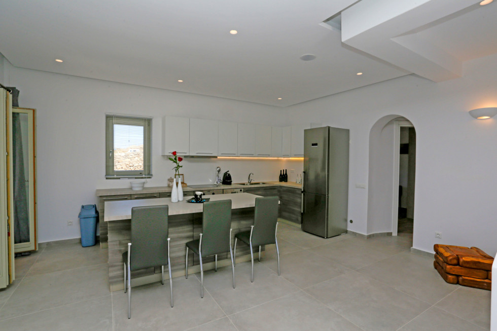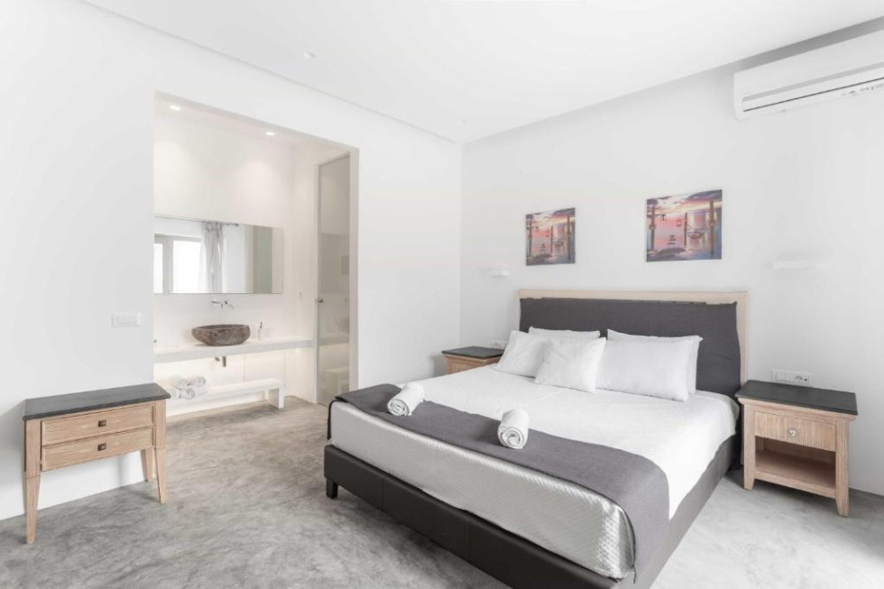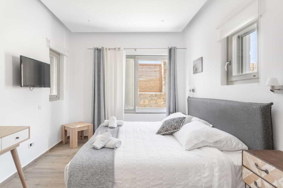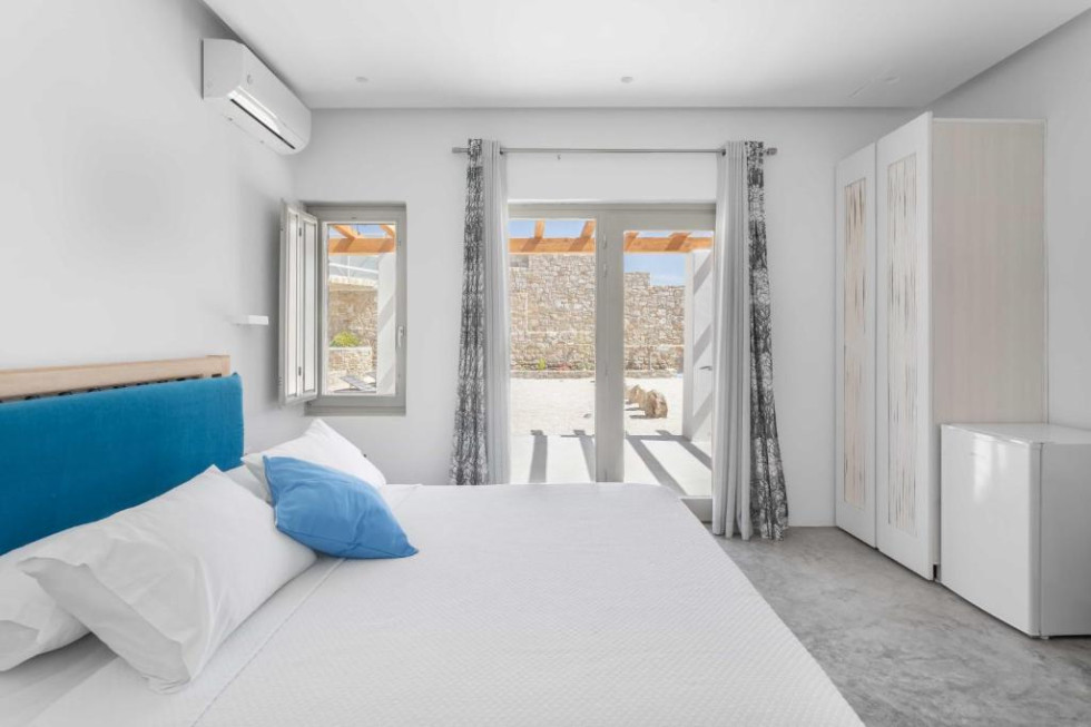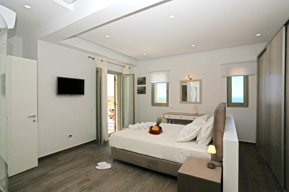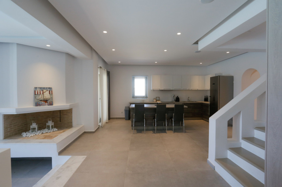 The upper level features 2 master bedrooms one with double bed and one with two single beds and private bathrooms, spacious living and dining area with fireplace with amazing view of the Aegean Villa provides the perfect place for your dream vacation in Mykonos island.