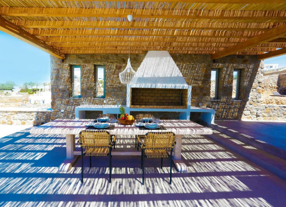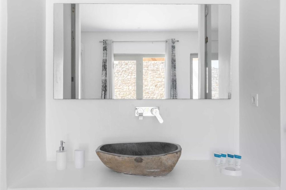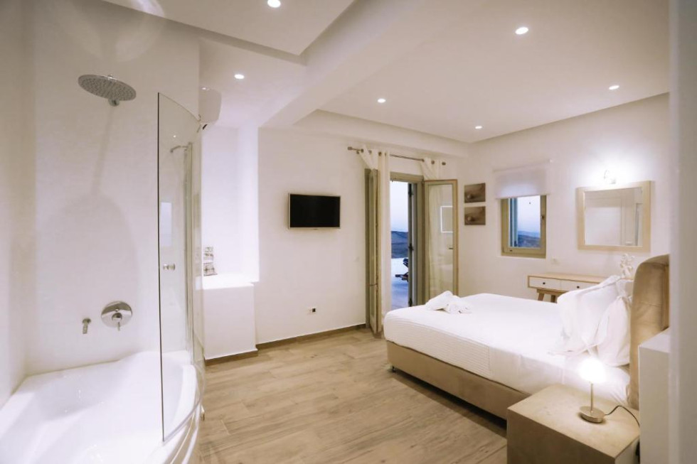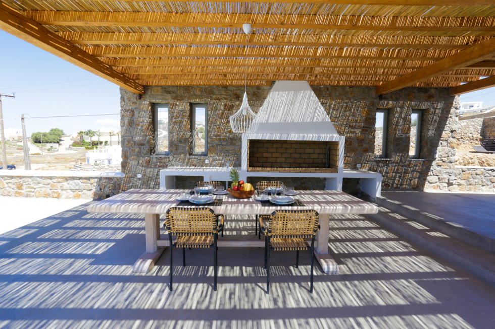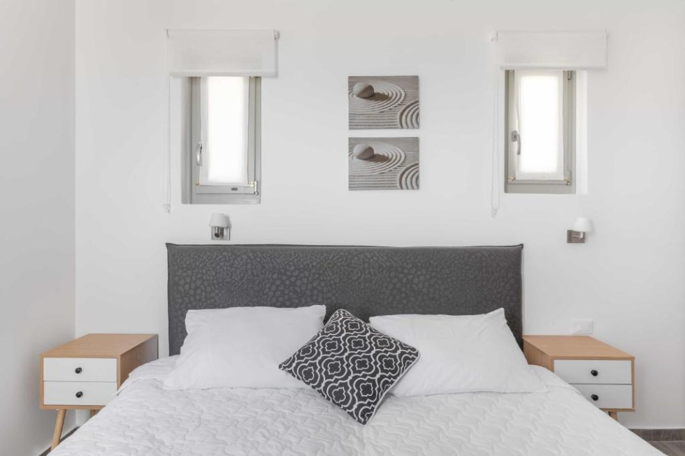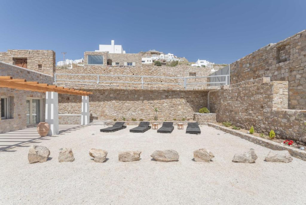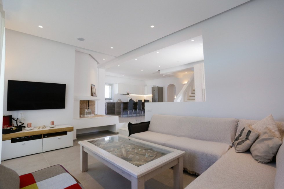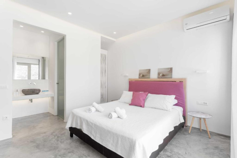 The upper level features 2 master bedrooms one with double bed and one with two single beds and private bathrooms, spacious living and dining area with fireplace with amazing view of the Aegean Villa provides the perfect place for your dream vacation in Mykonos island.