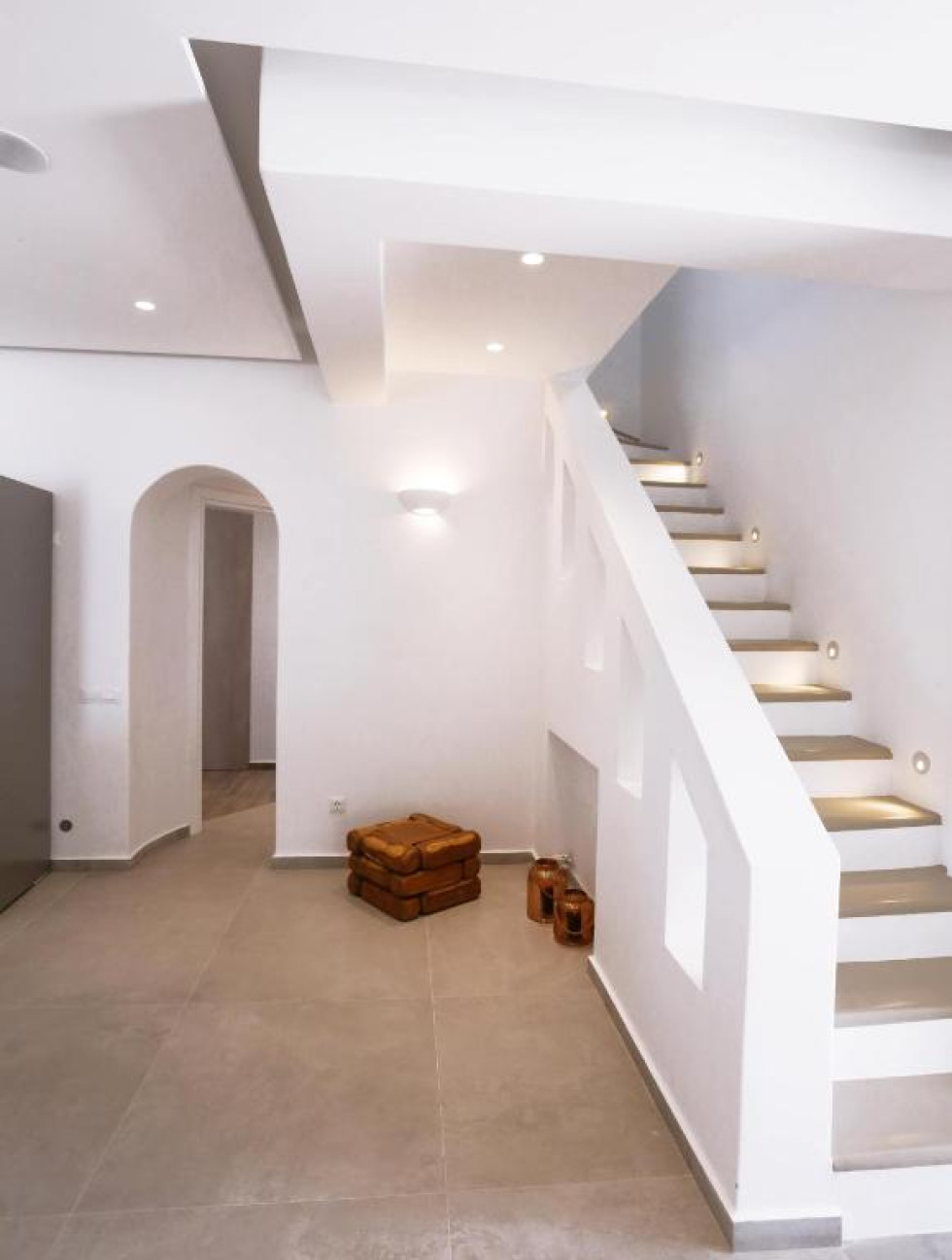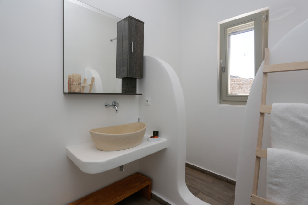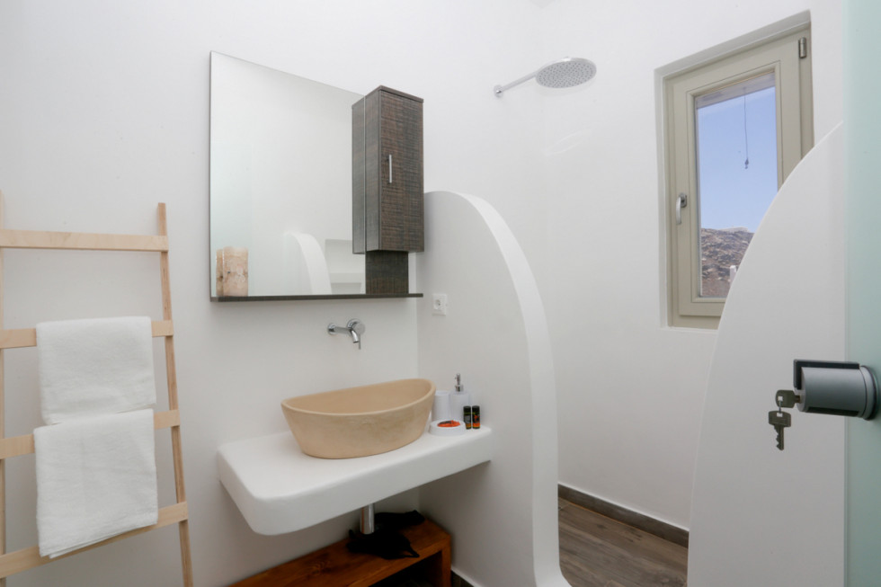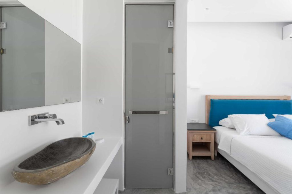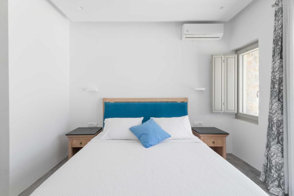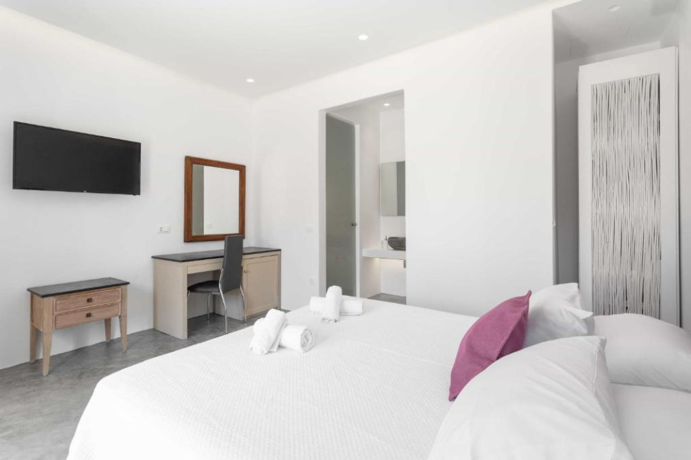 The upper level features 2 master bedrooms one with double bed and one with two single beds and private bathrooms, spacious living and dining area with fireplace with amazing view of the Aegean Villa provides the perfect place for your dream vacation in Mykonos island.