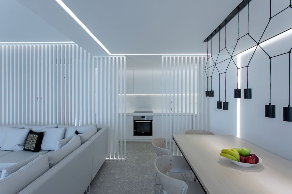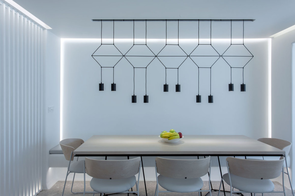 Open-plan living and dining area with large sliding doors opening onto the pool area