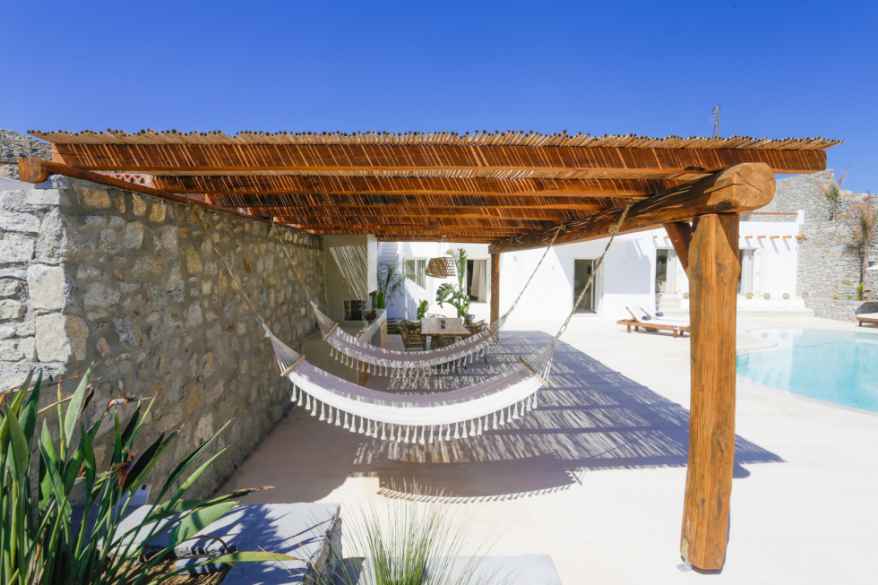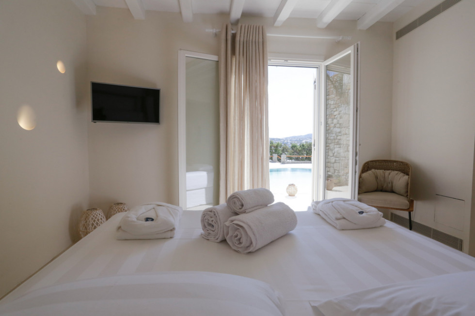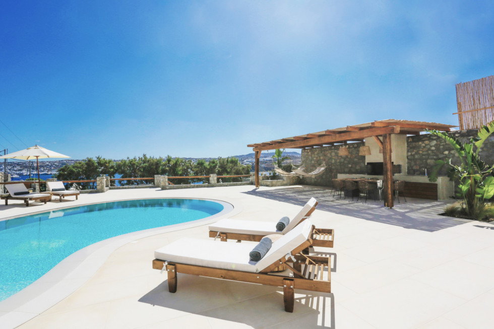 Bathed in the world famous Cycladic light and cooled by the Aegean breeze, it is one of the most luxurious Villas in Mykonos, with two adjacent guest apartments,