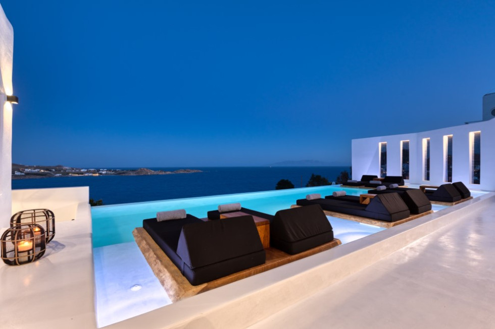 Villa Velvet on a hilltop position, high over Psarou with unparalleled panoramic views of Aegean sea and Psarou bay.