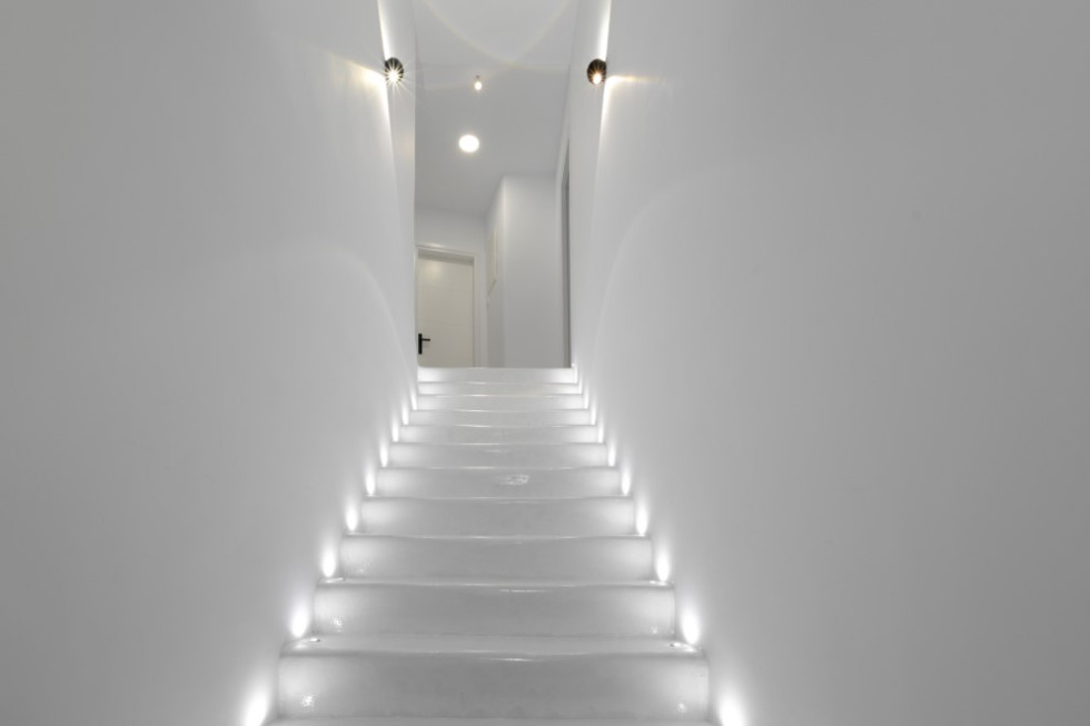 The interiors are very minimal, white curtains and cream upholstery, sober carved marble flooring and wood beams ceilings.