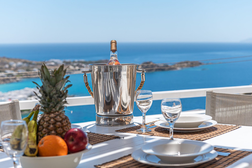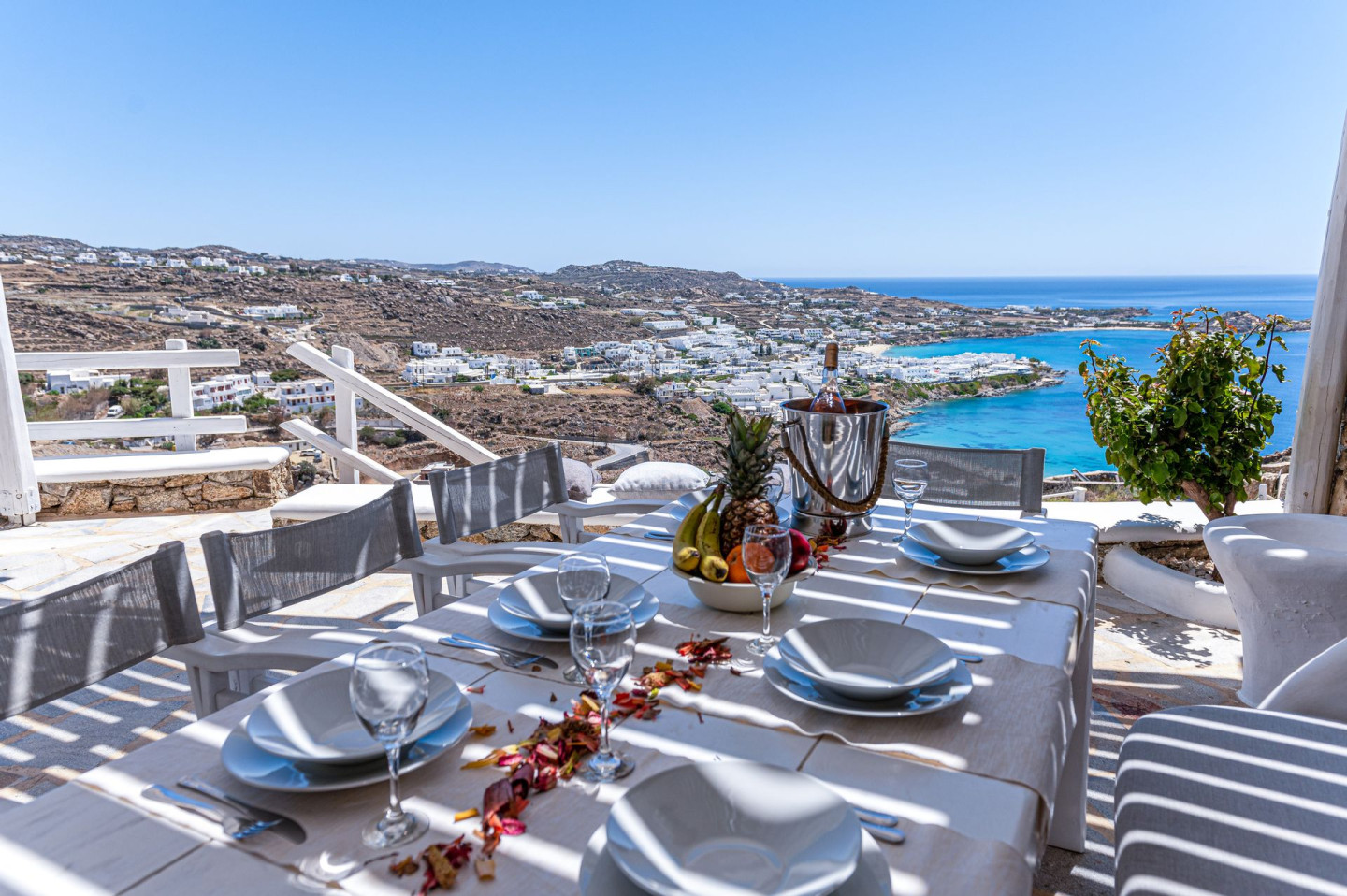 Multiple sitting areas in the front of the villa, to all which guests have access to, are designed, so that guests can break off into small groups and enjoy their own private space with a feeling of exterior independence enjoying panoramic sea and sunset views.