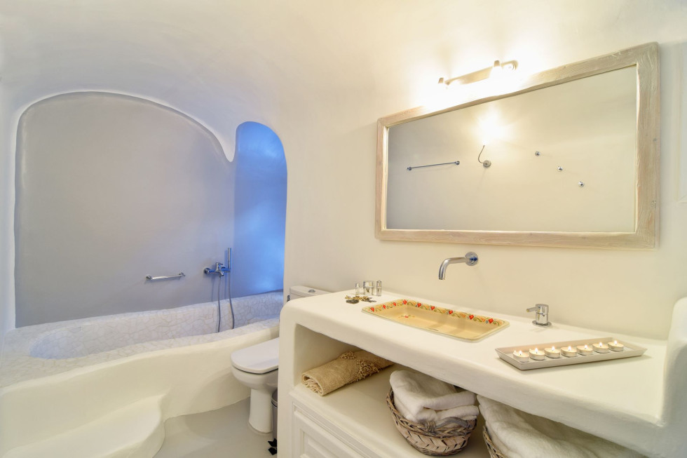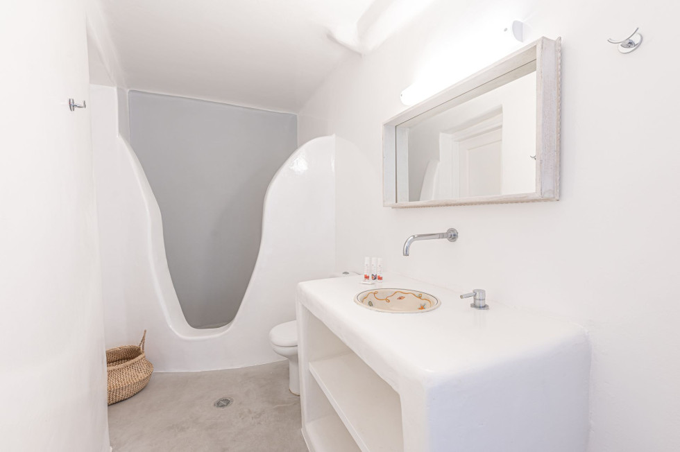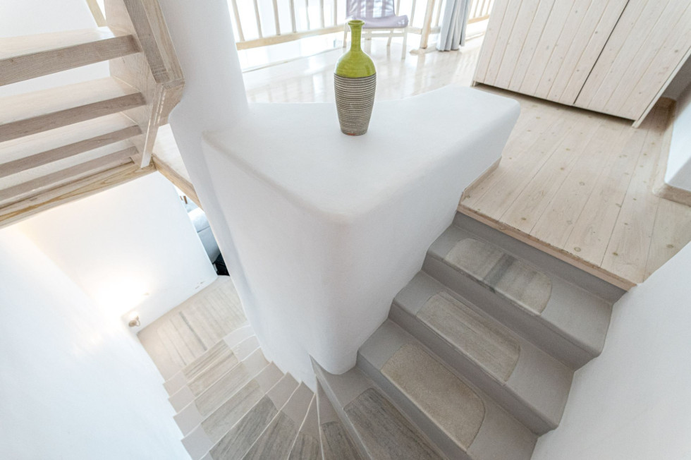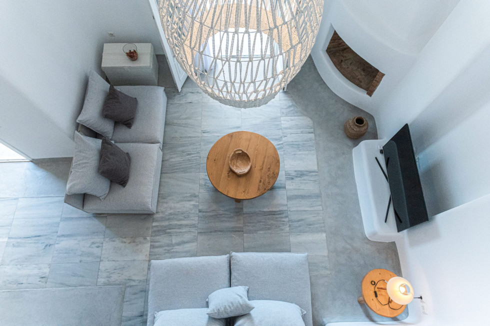 The main features include white plaster, local stone, natural rocks, built-in couches, and wooden pergolas intertwined with climbing bougainvillea and Cycladic arches.