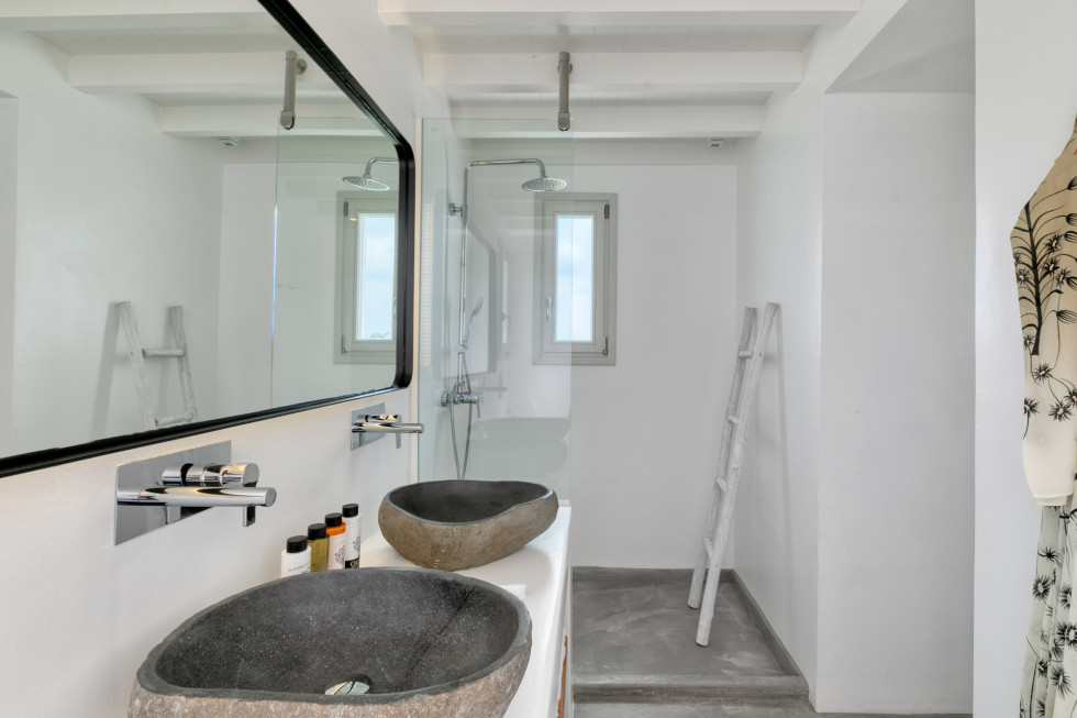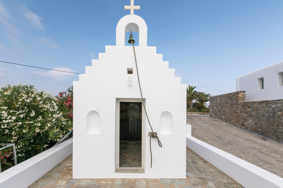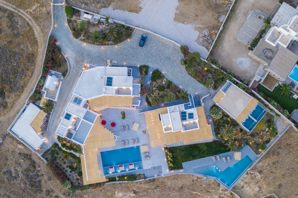The resort is set amidst the emerald waters of the sea and the azure sky, a few minutes walk from Kalo Livadi beach, and consists of three large Villas and 1 guesthouse in a total surface of 1.100 sq. m., with 20 bedrooms which may accommodate up to 40 persons.