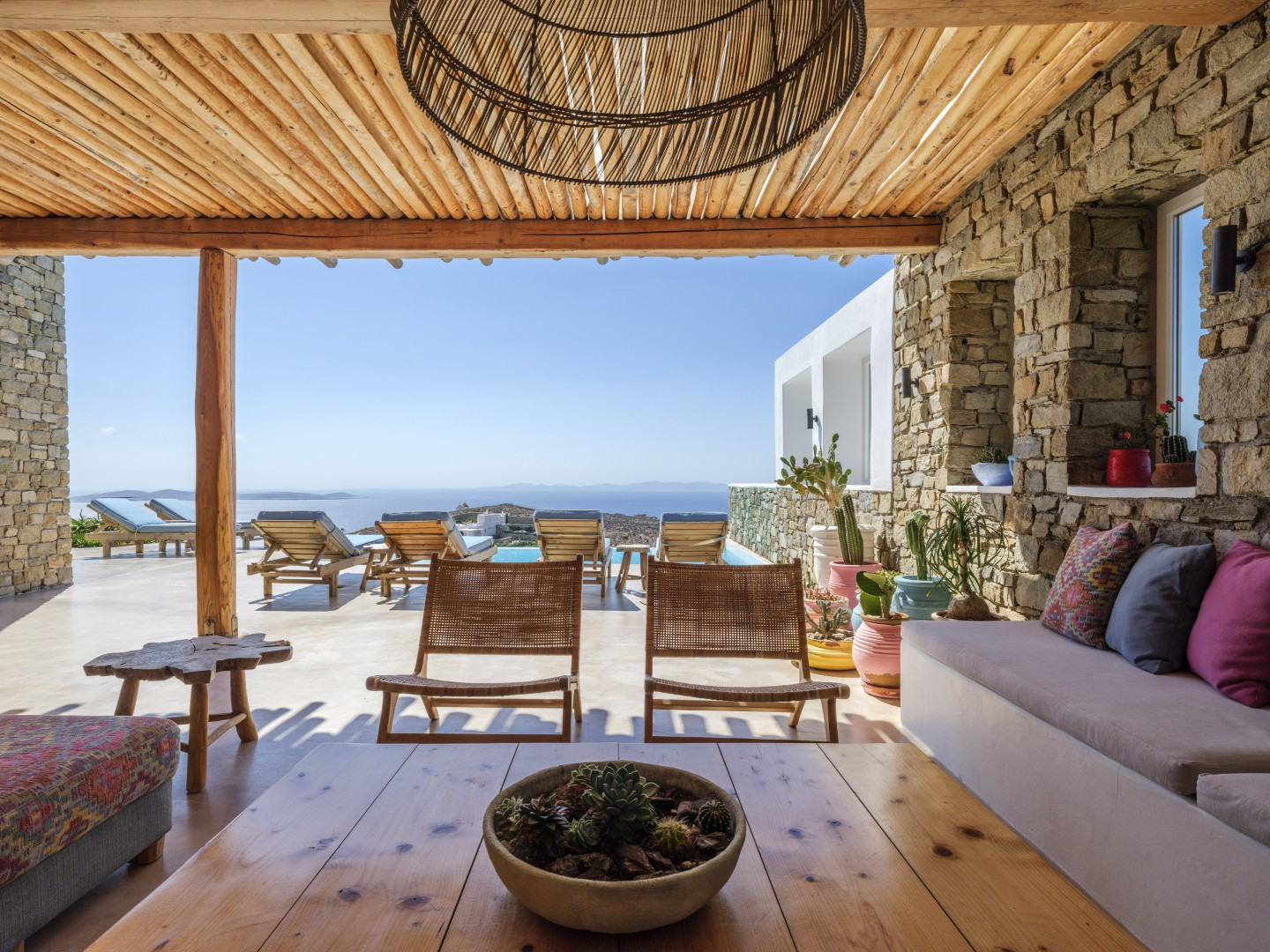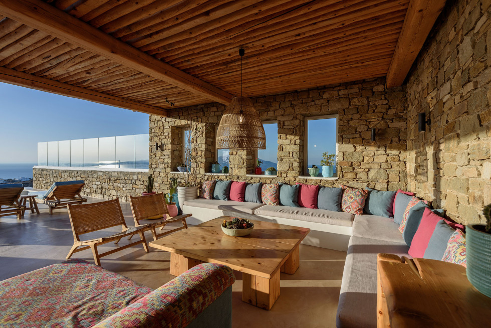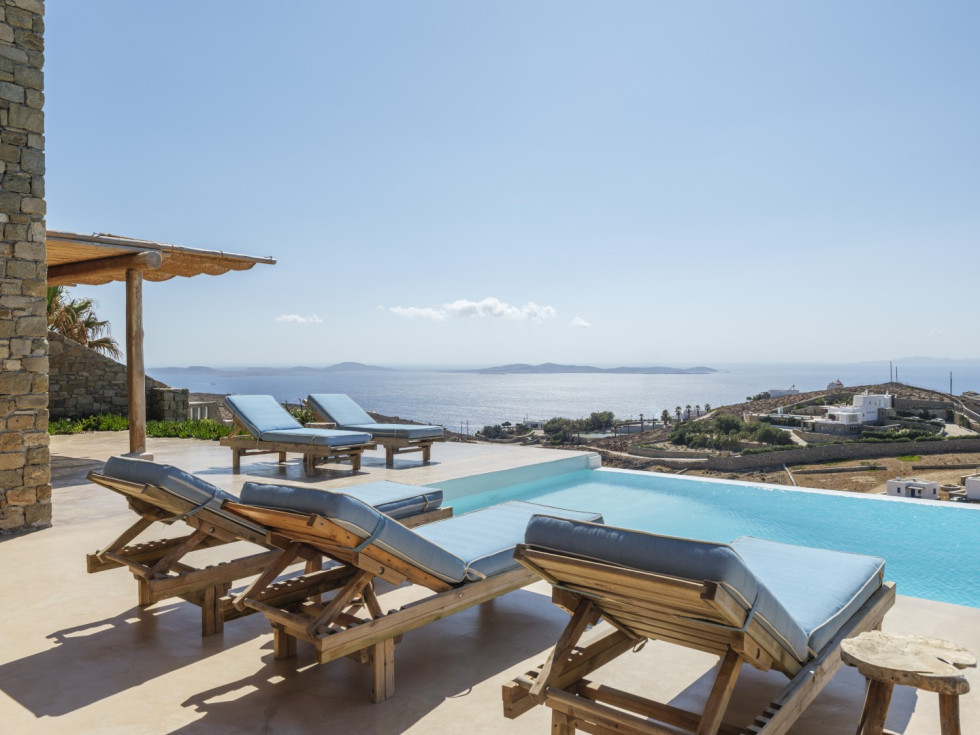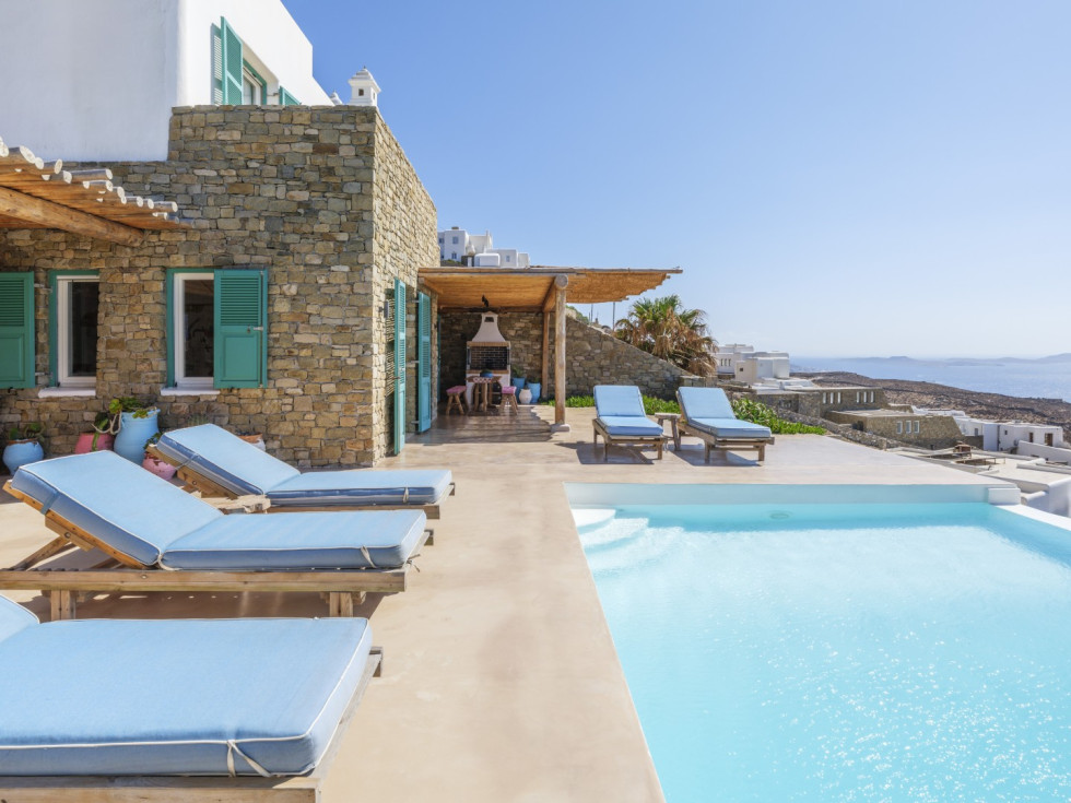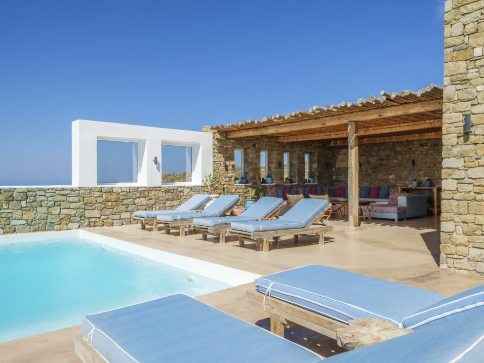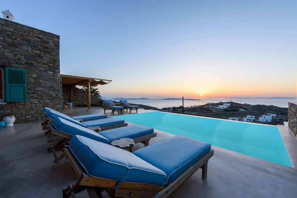 Outside there is a lovely swimming pool equipped with sunbeds, patio, lounge area where you can relax and enjoy the amazing view of the Aegean Sea and the sunset.