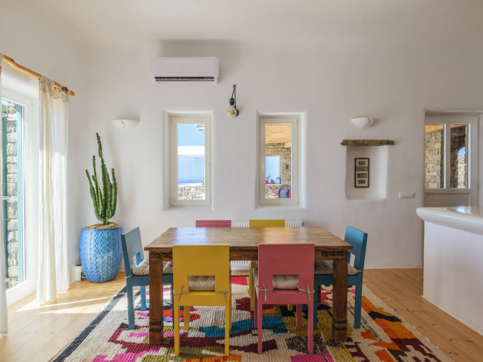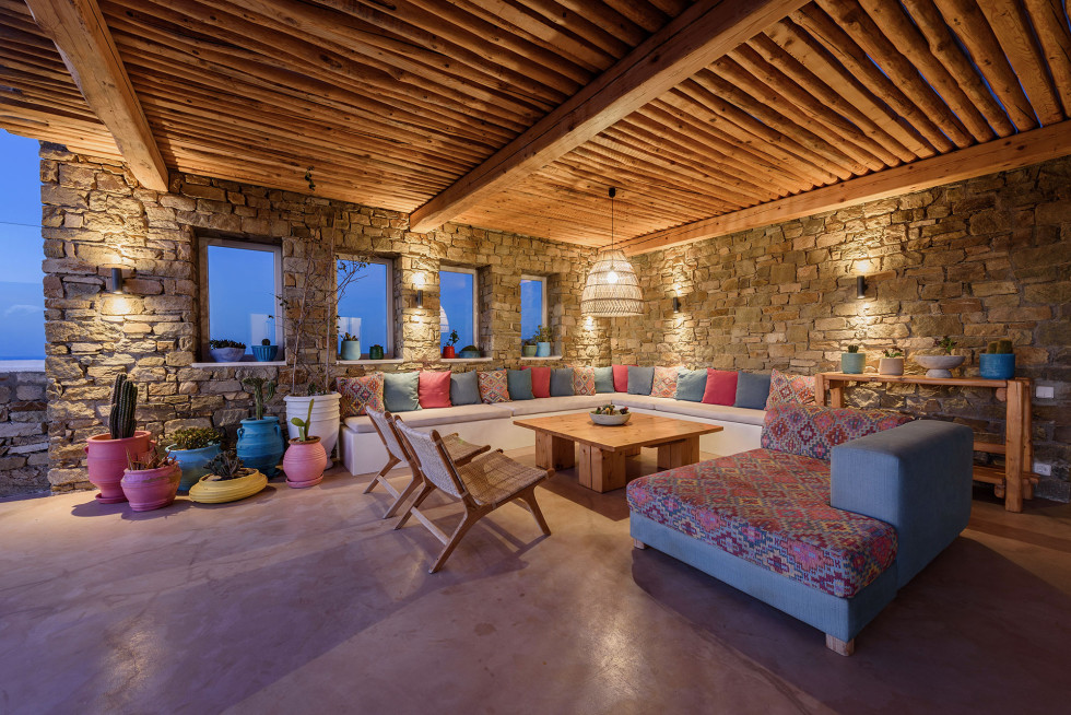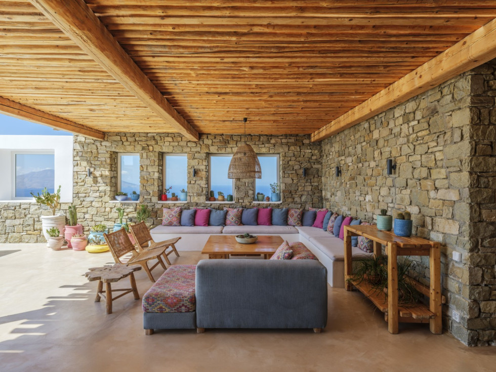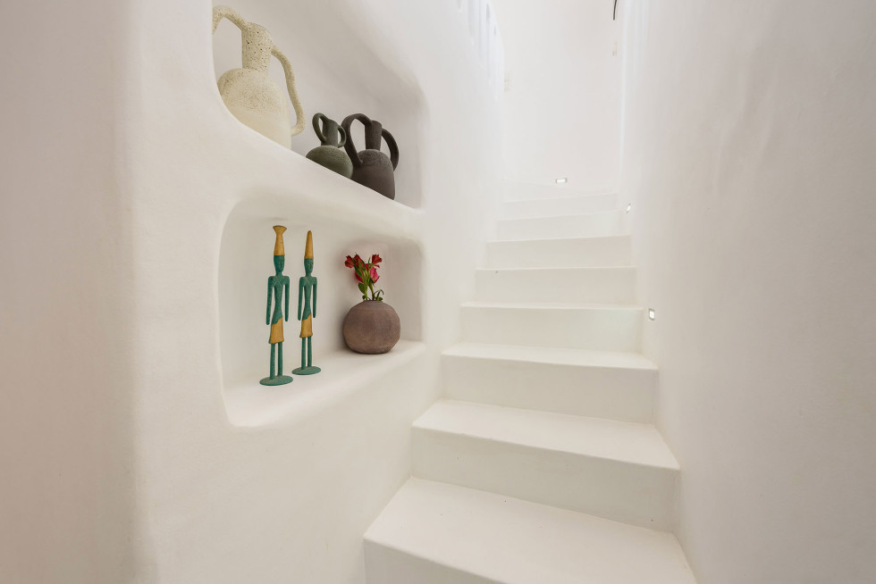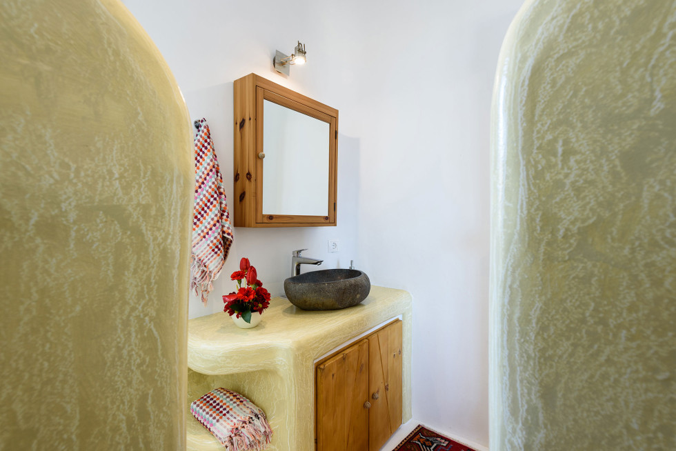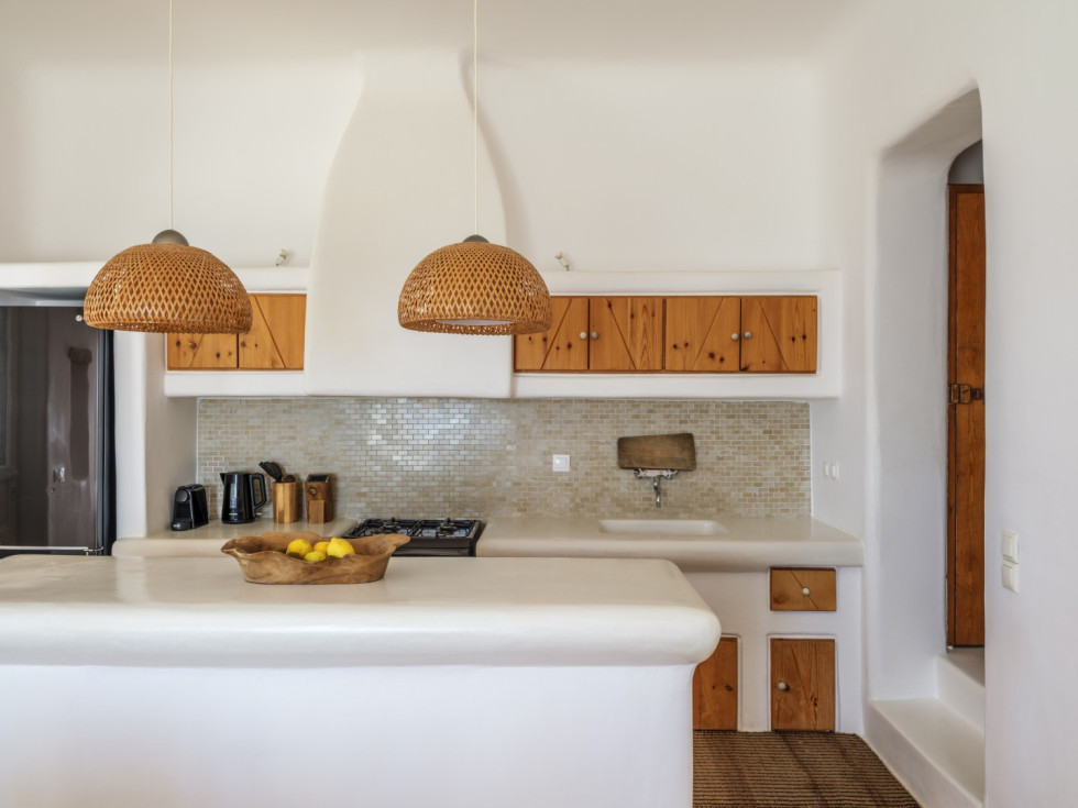 The villa features the typical architecture of the Cyclades, with stones and whitewashed walls, it develops on two levels and it can accommodate up to 6 people (thanks to a built-in sofa bed and 1 single bed).