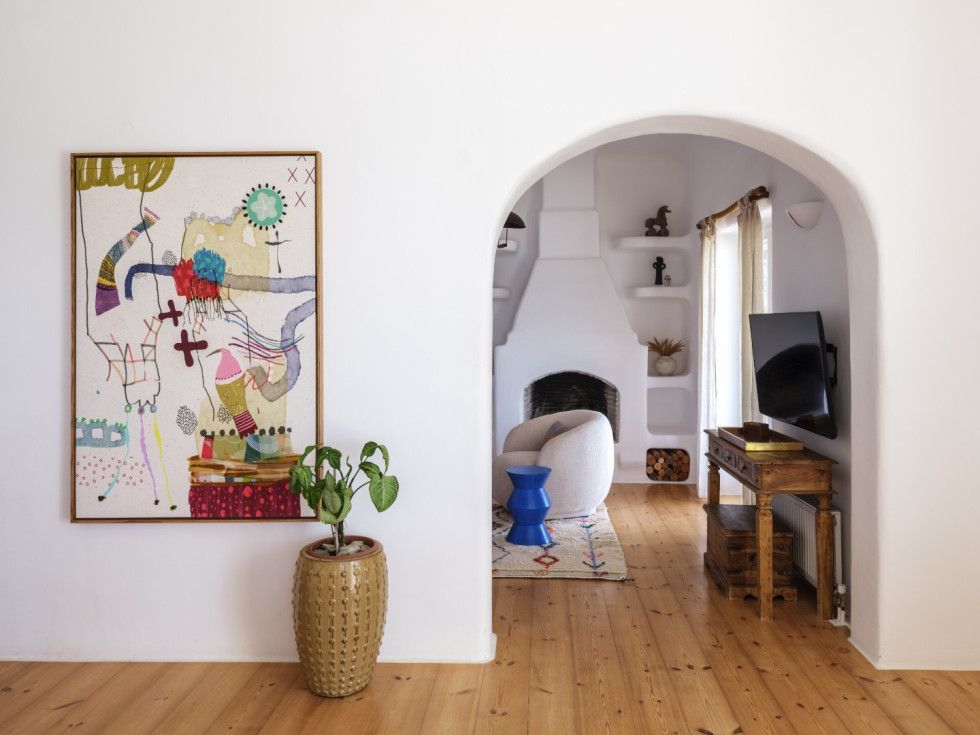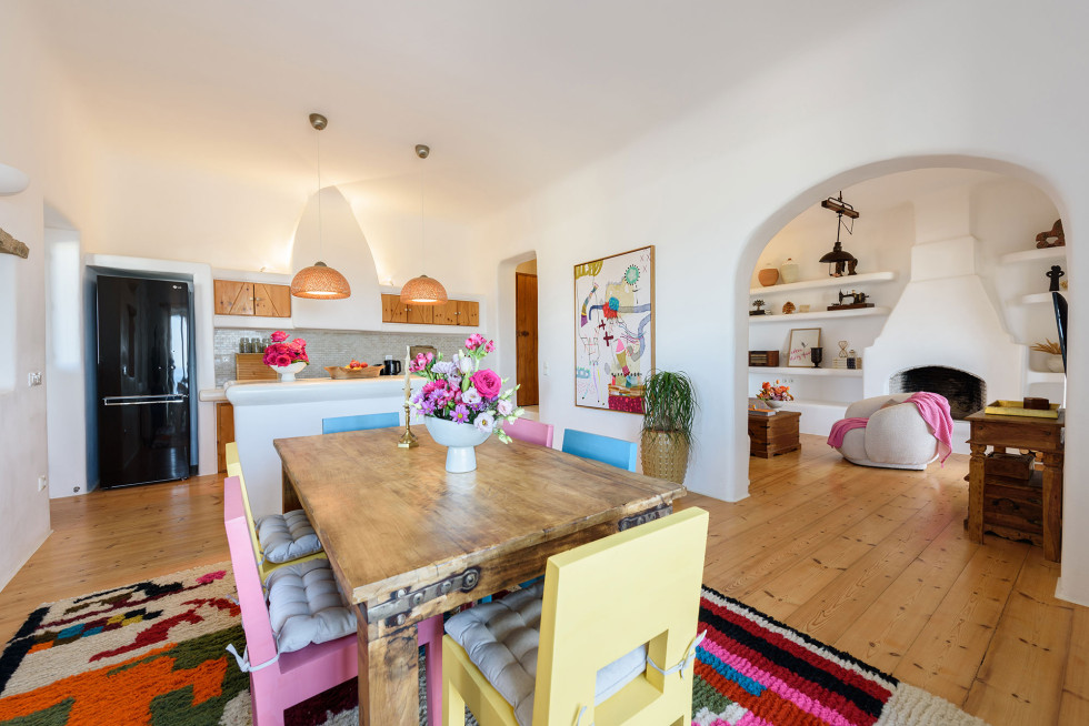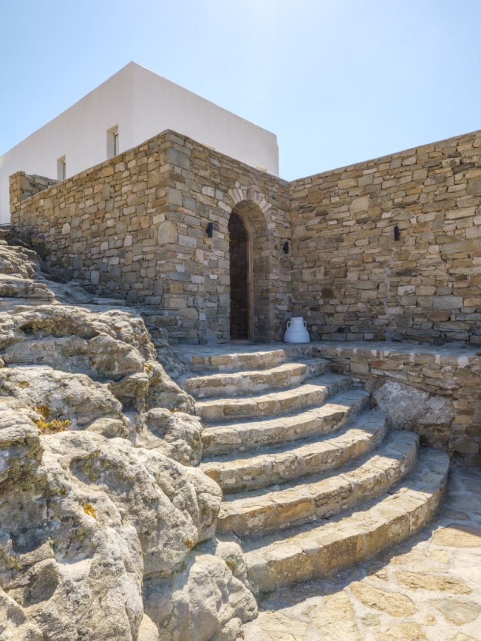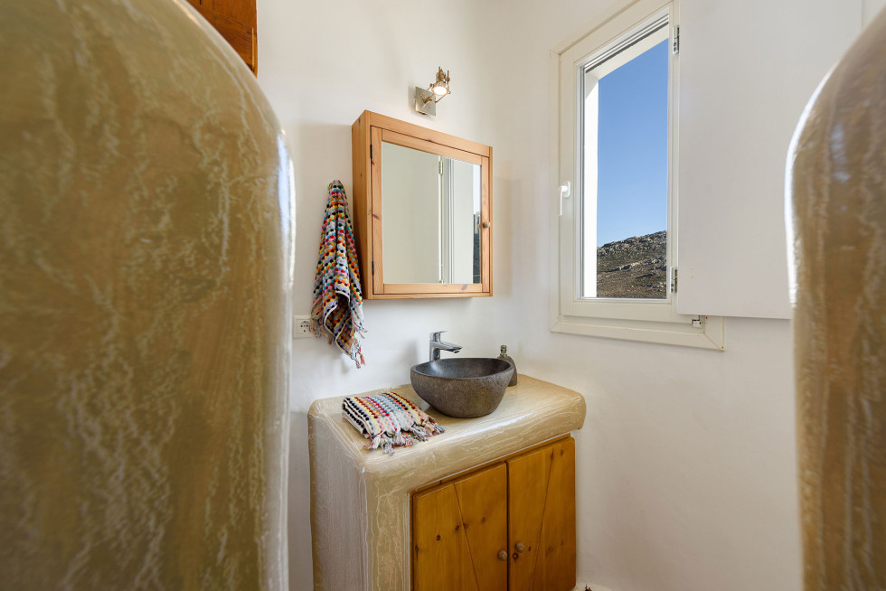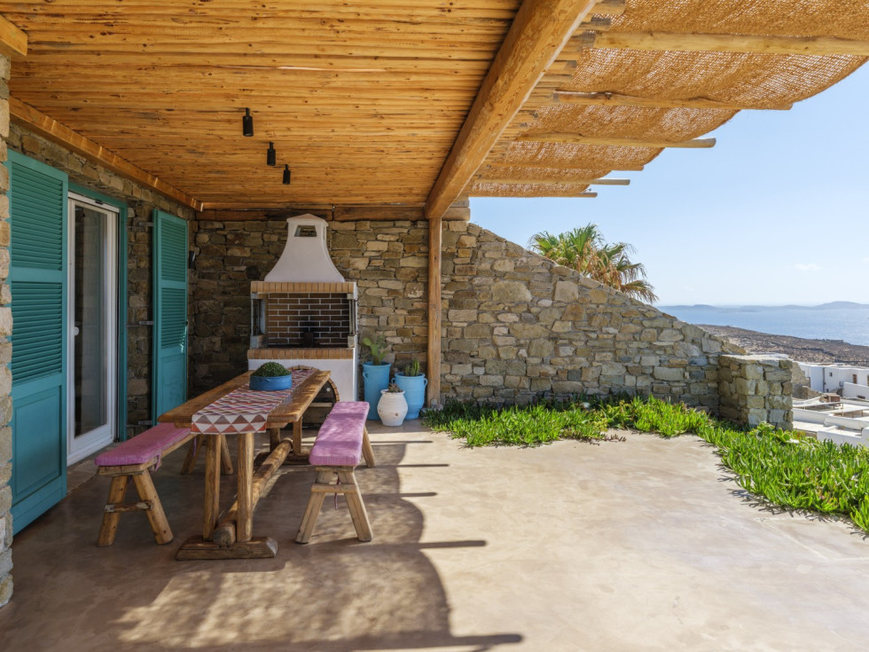 The villa features the typical architecture of the Cyclades, with stones and whitewashed walls, it develops on two levels and it can accommodate up to 6 people (thanks to a built-in sofa bed and 1 single bed).