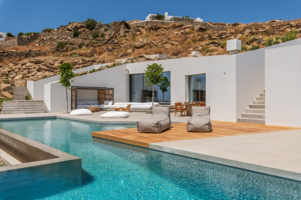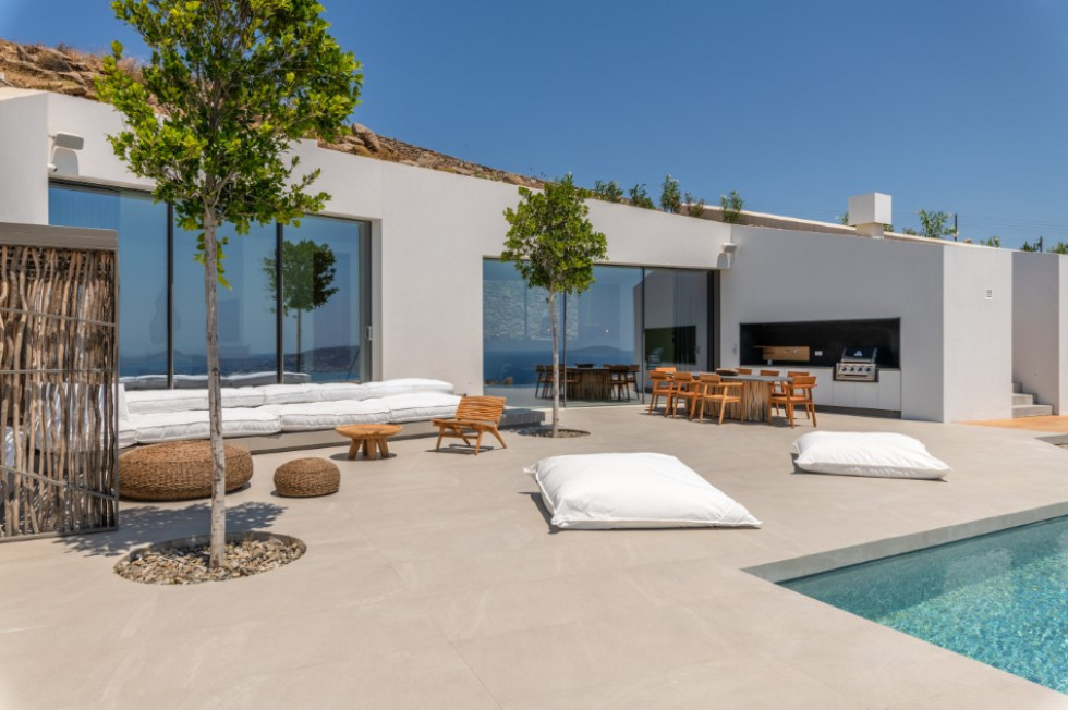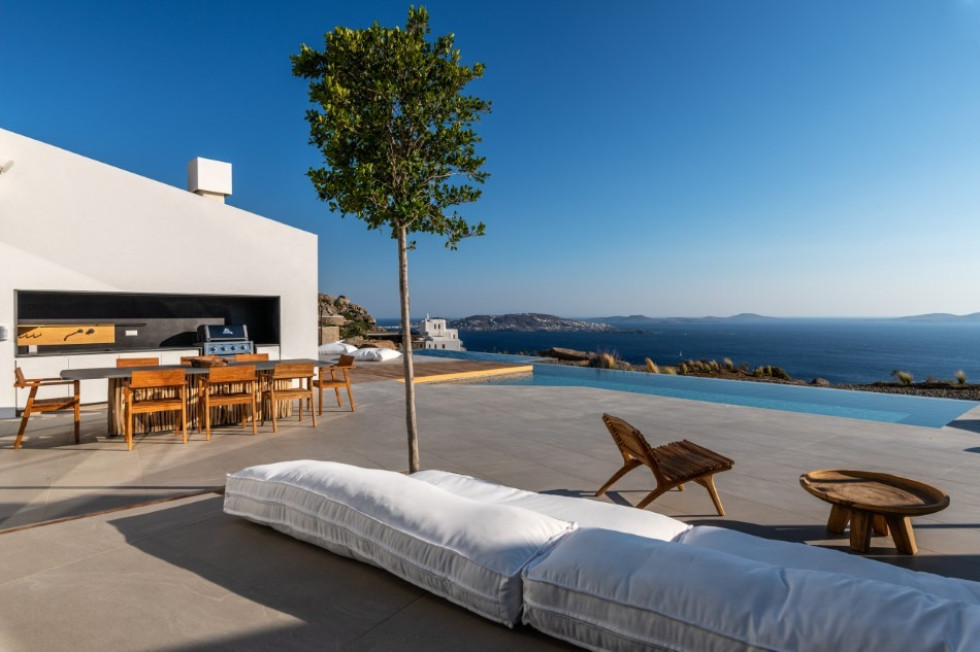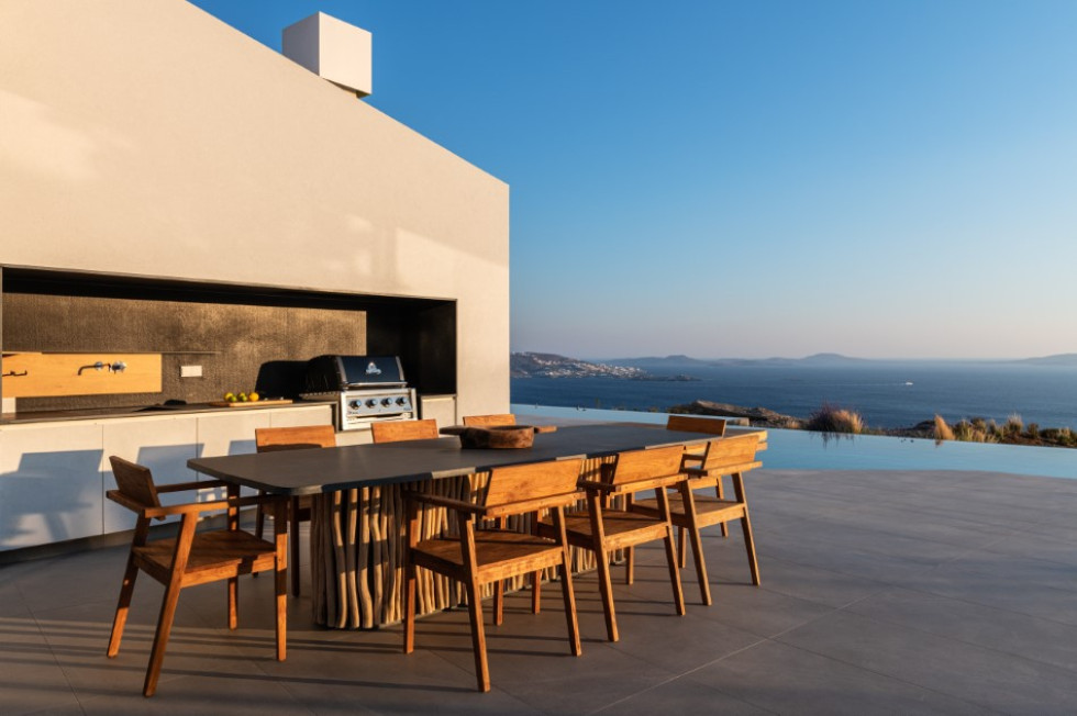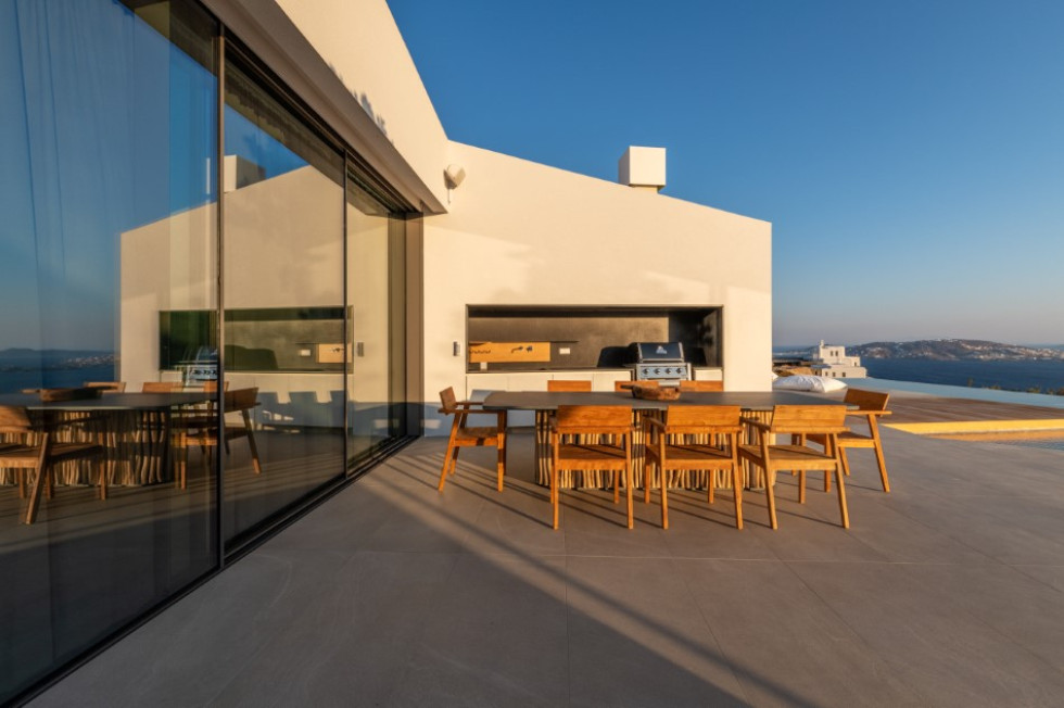 The spacious outdoor deck (of a total of approximately 500 sq. m.) features the 20x4 m. private Infinity pool which overlooks the Aegean Sea, the dining and BBQ area, the outdoor Home Cinema and multiple sitting and lounge areas all around the property where the guests may relax all together or independently.