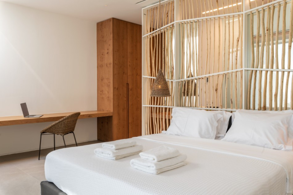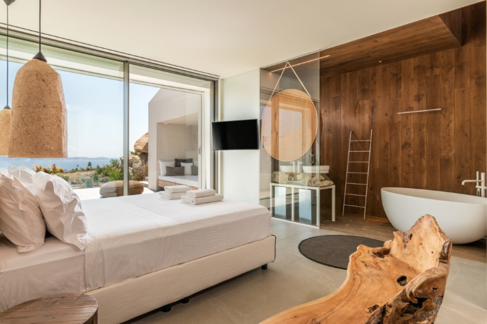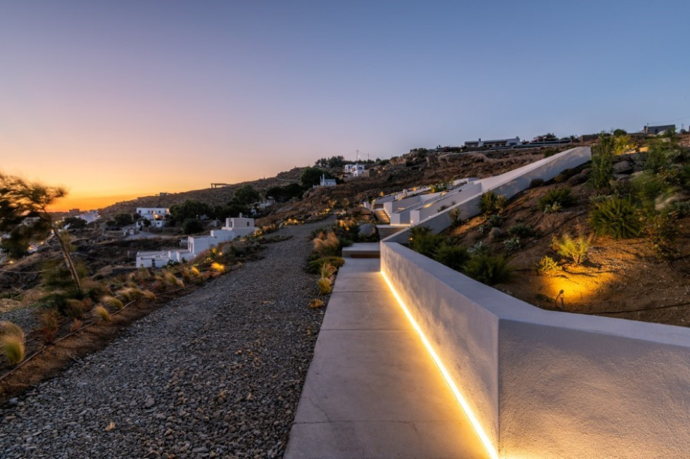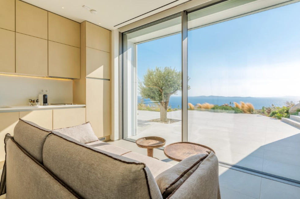 Due to its distinctive design, each and every room of the property faces the western Aegean Sea and enjoys amazing unobstructed sea sunset views.