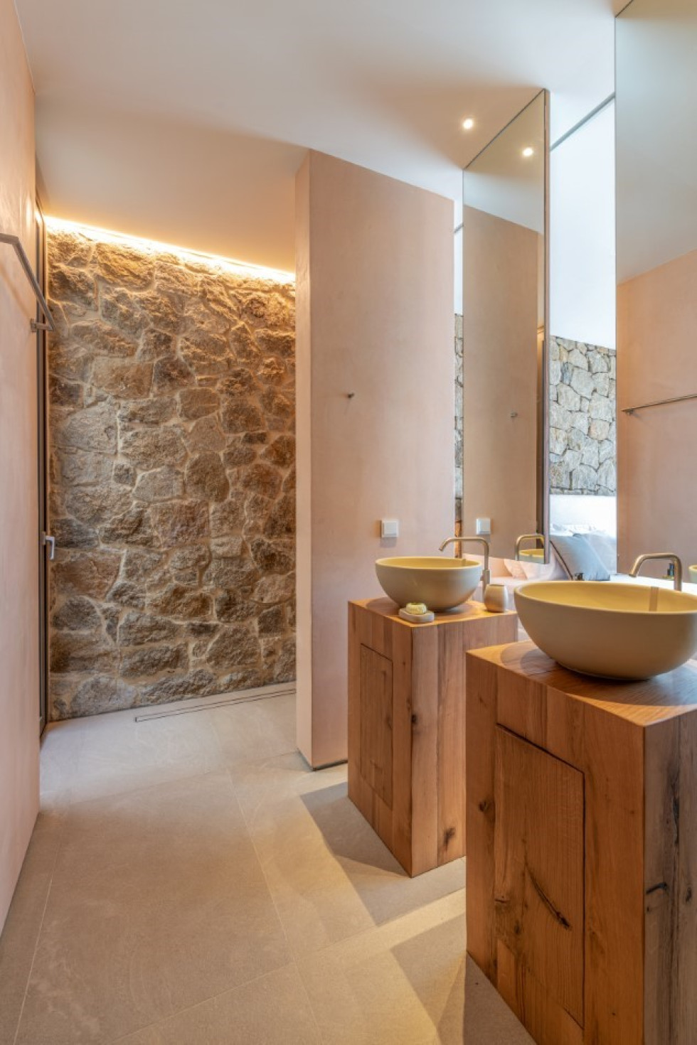The main house hosts the main interior living and dining spaces, 4 en suite bedrooms (one of which is master), the open plan kitchen space with its large cooking/food preparation areas, the wine room and the gym.