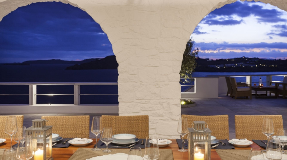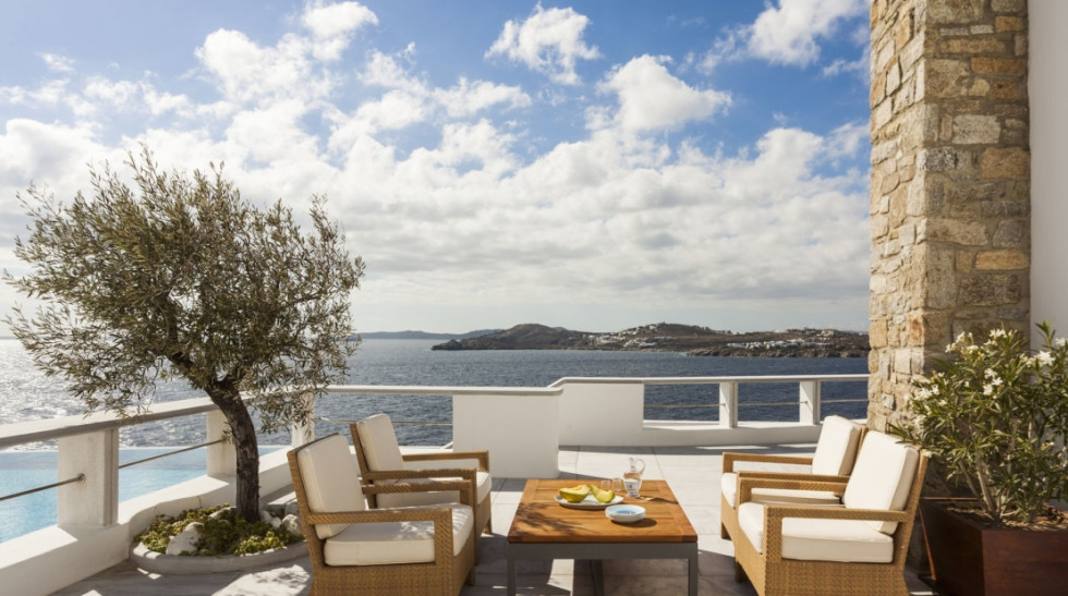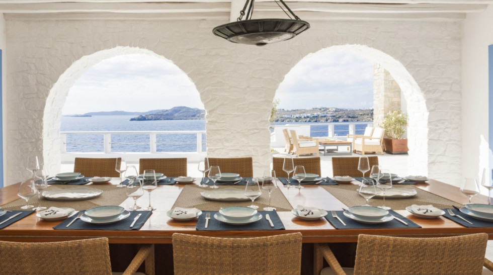 Outdoor dining area with sea view
