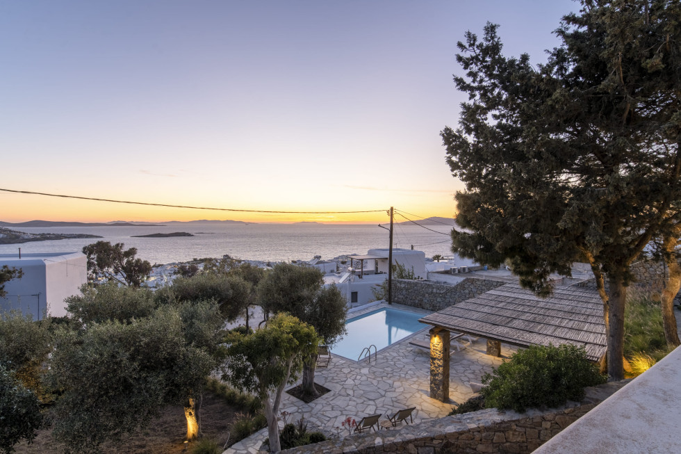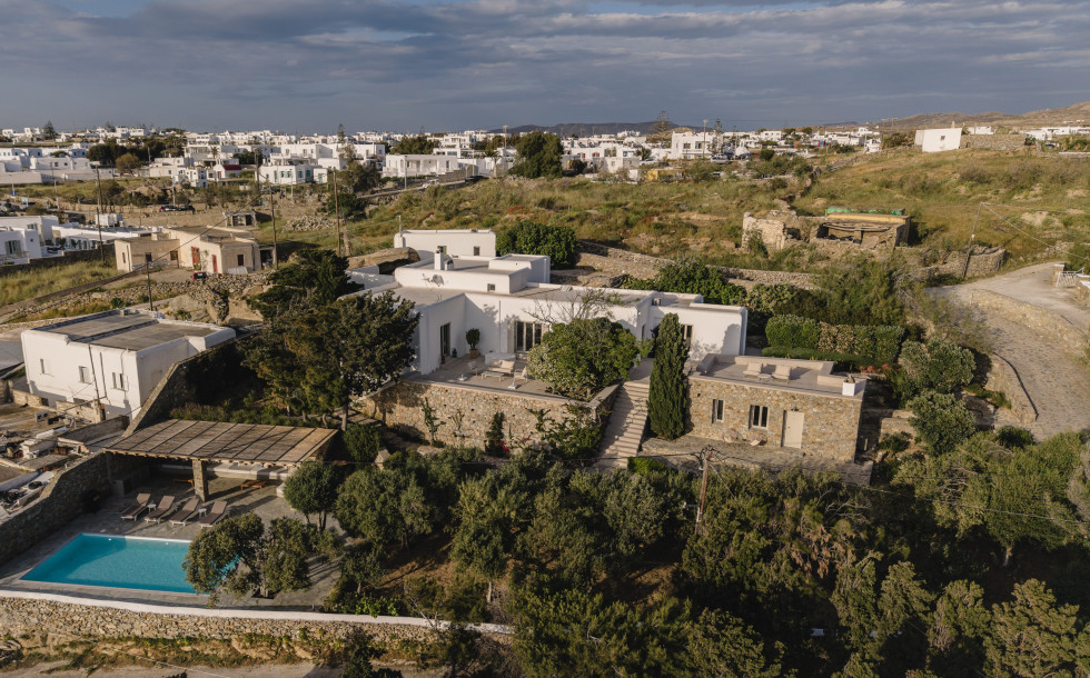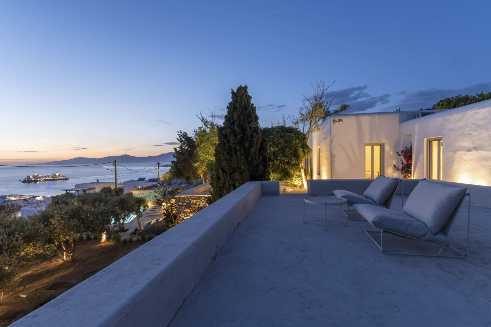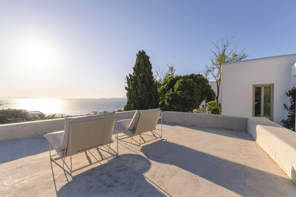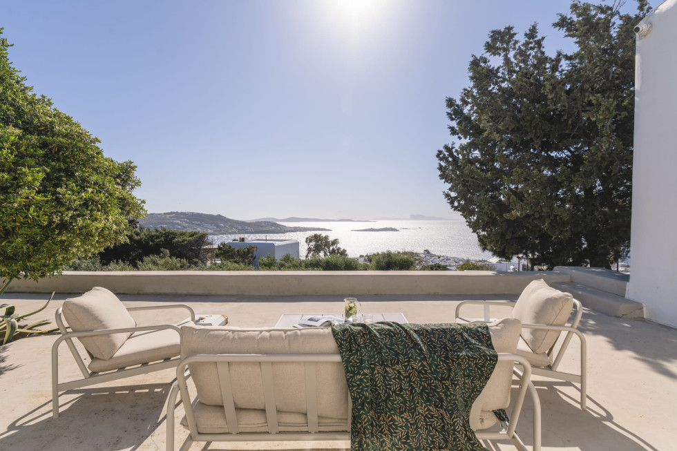 Perched above Mykonos Town, the villa enjoys sweeping views of the Aegean Sea, the iconic windmills, and the glowing sunset skies that define the island’s magic. Despite its peaceful setting, the lively town center is just a 6-minute walk (400 m) away—allowing you to enjoy calm mornings at home and vibrant nights out with effortless ease.