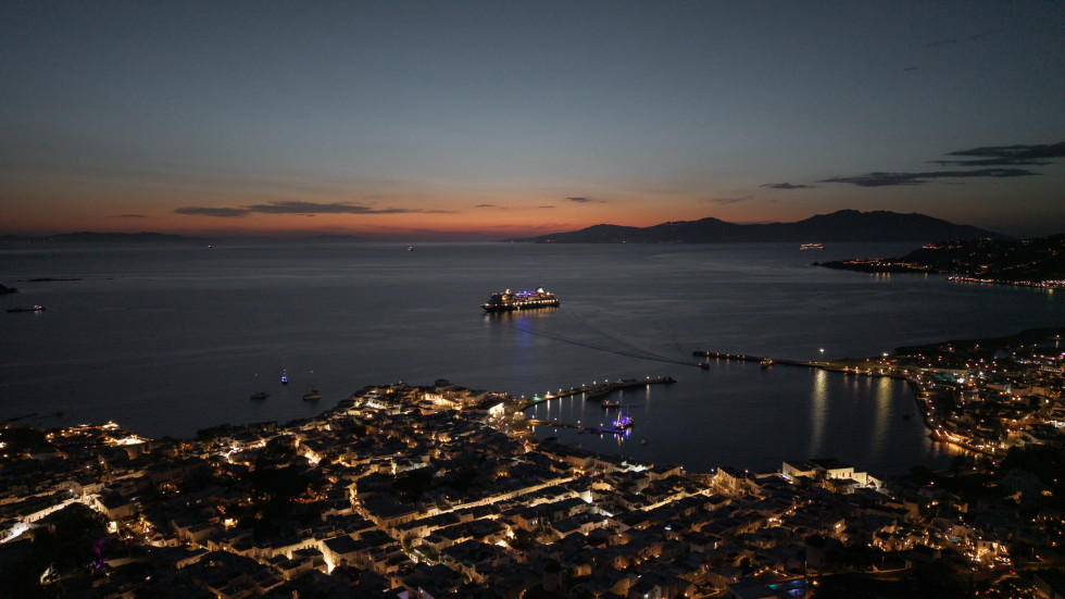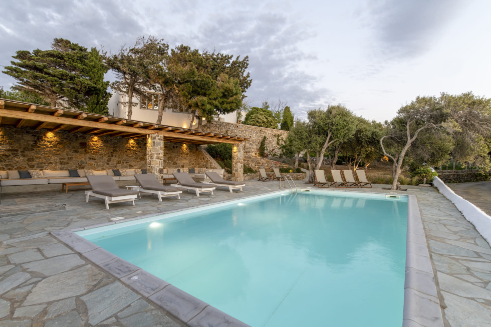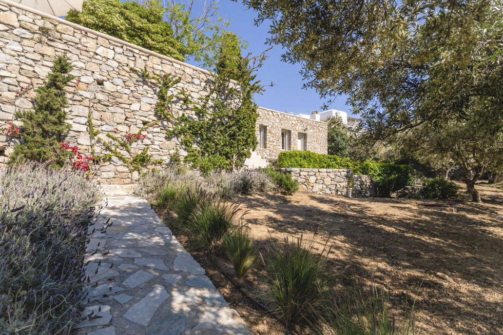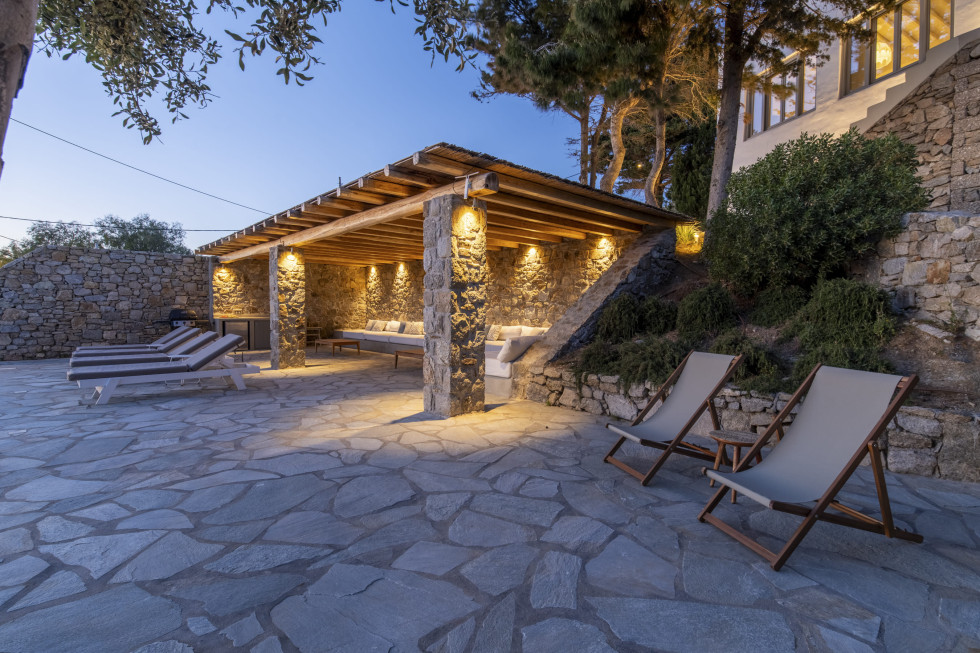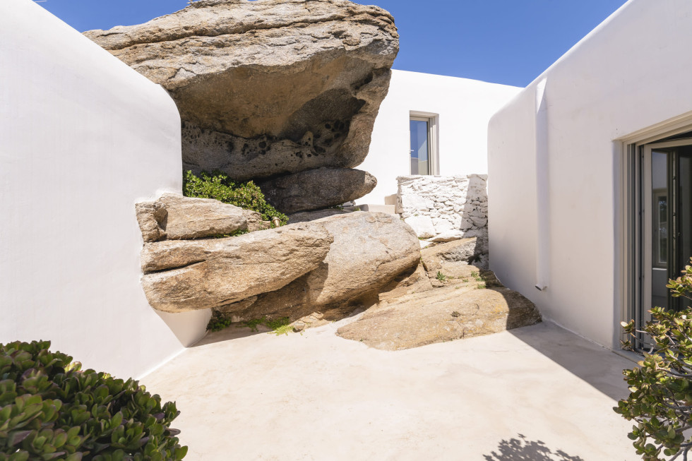 Perched above Mykonos Town, the villa enjoys sweeping views of the Aegean Sea, the iconic windmills, and the glowing sunset skies that define the island’s magic. Despite its peaceful setting, the lively town center is just a 6-minute walk (400 m) away—allowing you to enjoy calm mornings at home and vibrant nights out with effortless ease.