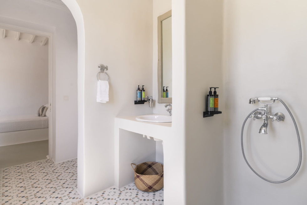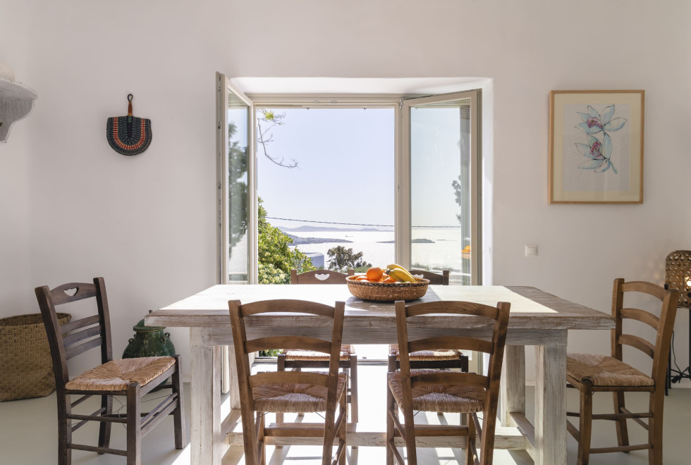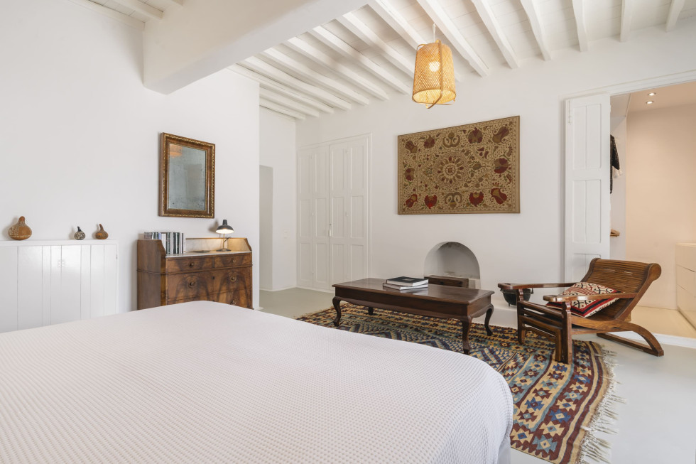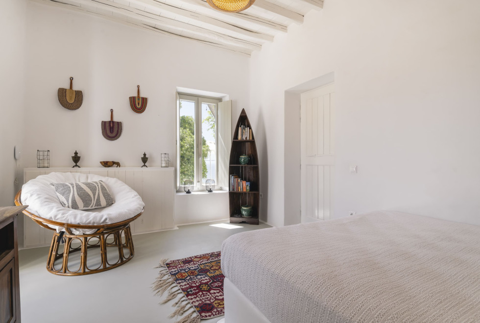 Villa Serenaya’s interiors reflect a curated fusion of Cycladic minimalism and bohemian elegance, featuring earthy tones, natural textures, and handpicked ethnic accents. Light-filled spaces create a soothing atmosphere, while large windows frame captivating views of the sea and town below.