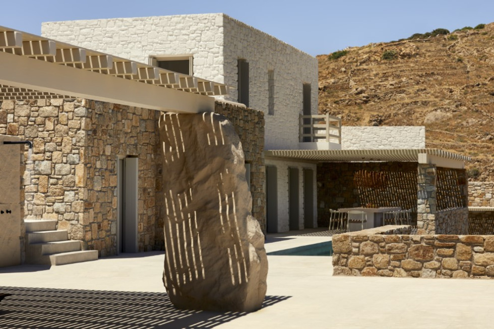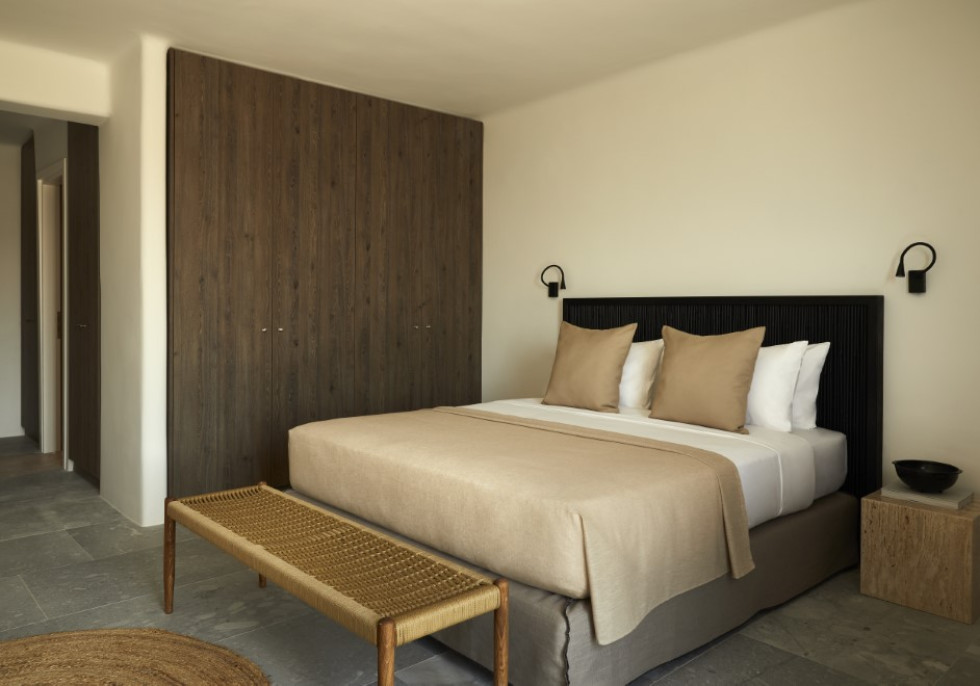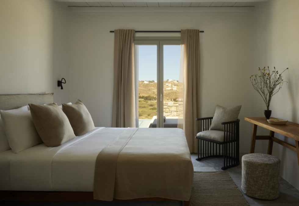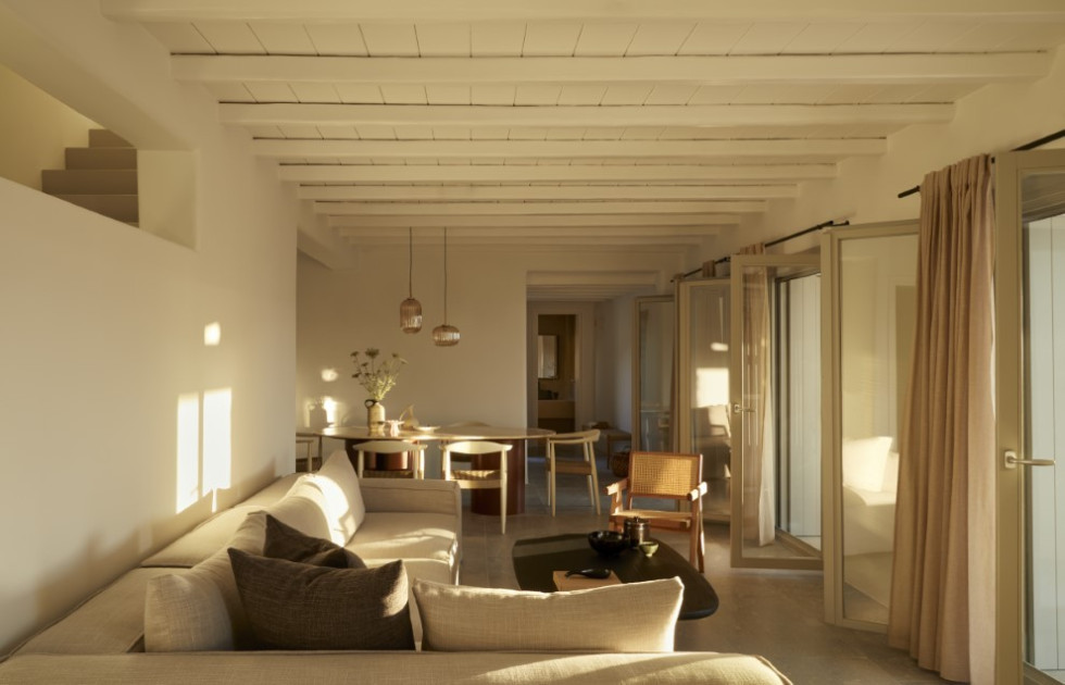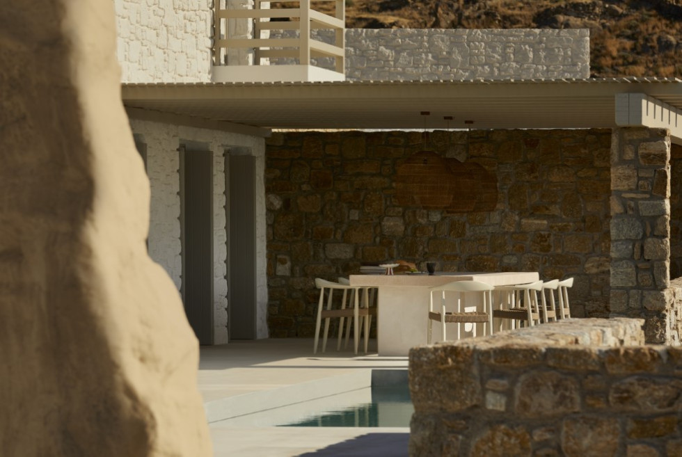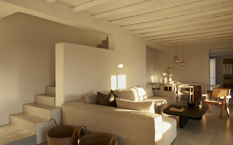 Inside, the villa features a harmonious blend of traditional Cycladic design with chic beige accents. Spacious areas with luxurious décor, a large dining area, and a fully equipped kitchen—complete with a wine cooler—ensure maximum comfort and elegance.