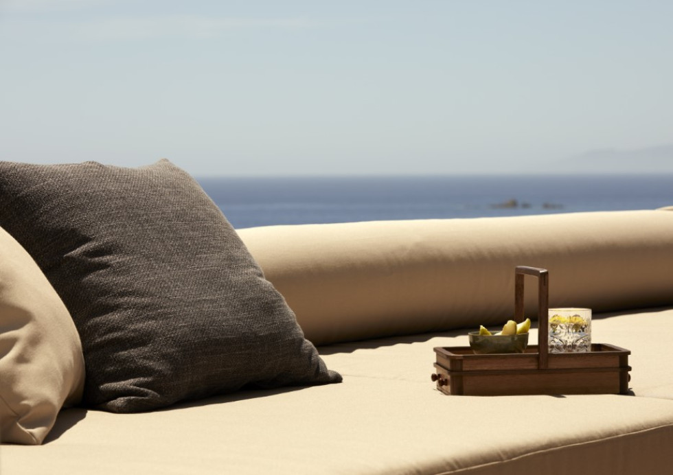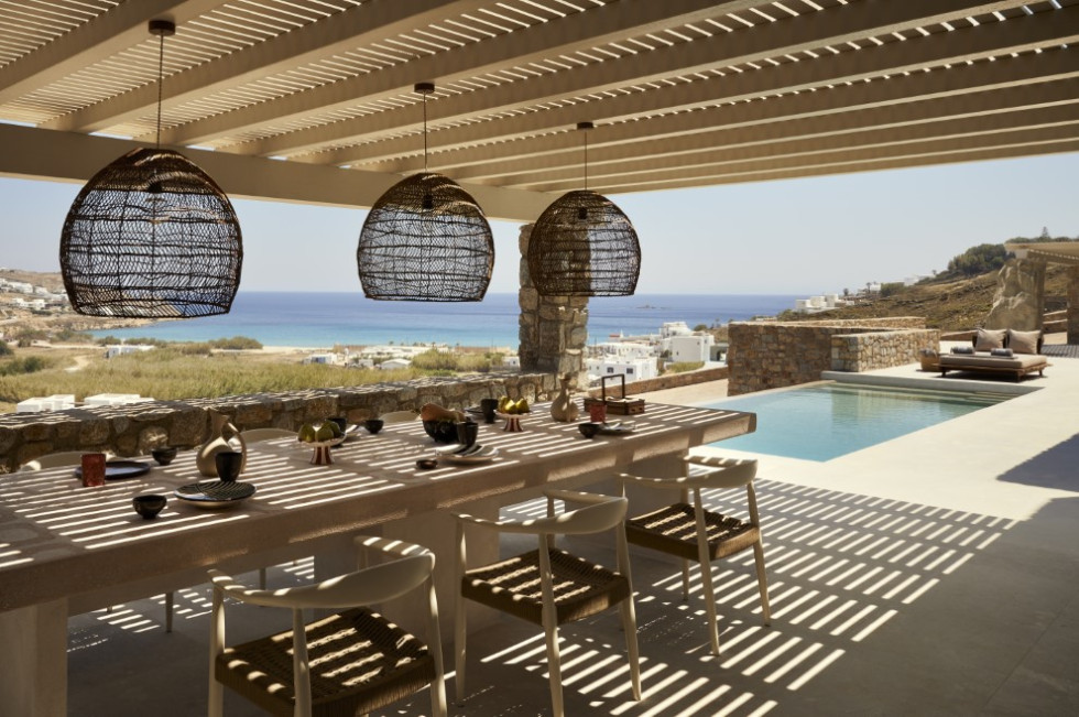 The expansive outdoor area is dominated by a pristine swimming pool, surrounded by stylish sunbeds and a sheltered lounge area perfect for unwinding under the sun. The pergola-covered dining area invites guests to enjoy memorable meals with loved ones while enjoying the incredible sea views.