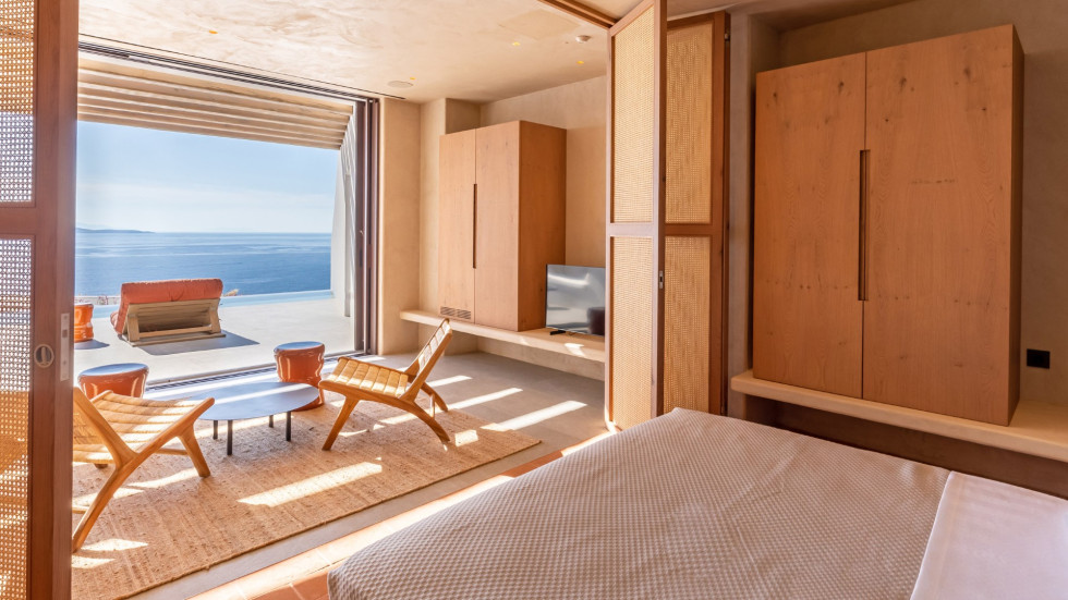 - Master Bedroom (50 sqm) – Double bed, A/C, en-suite bathroom with shower, private infinity pool, stunning sea views