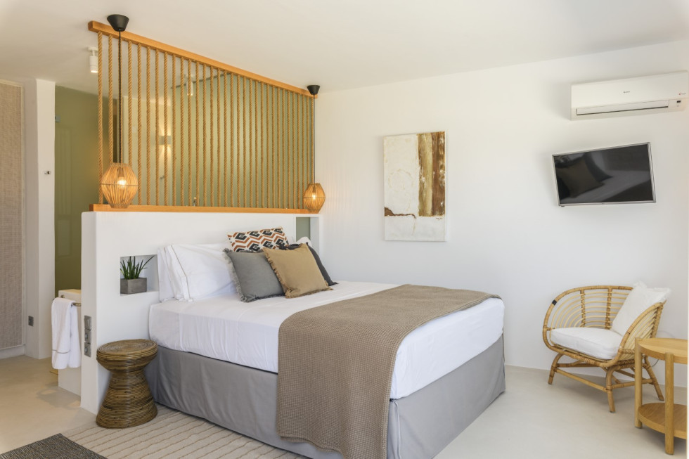 1 Master Bedroom with super-king bed, en-suite bathroom, TV, A/C, and sea-view terrace
